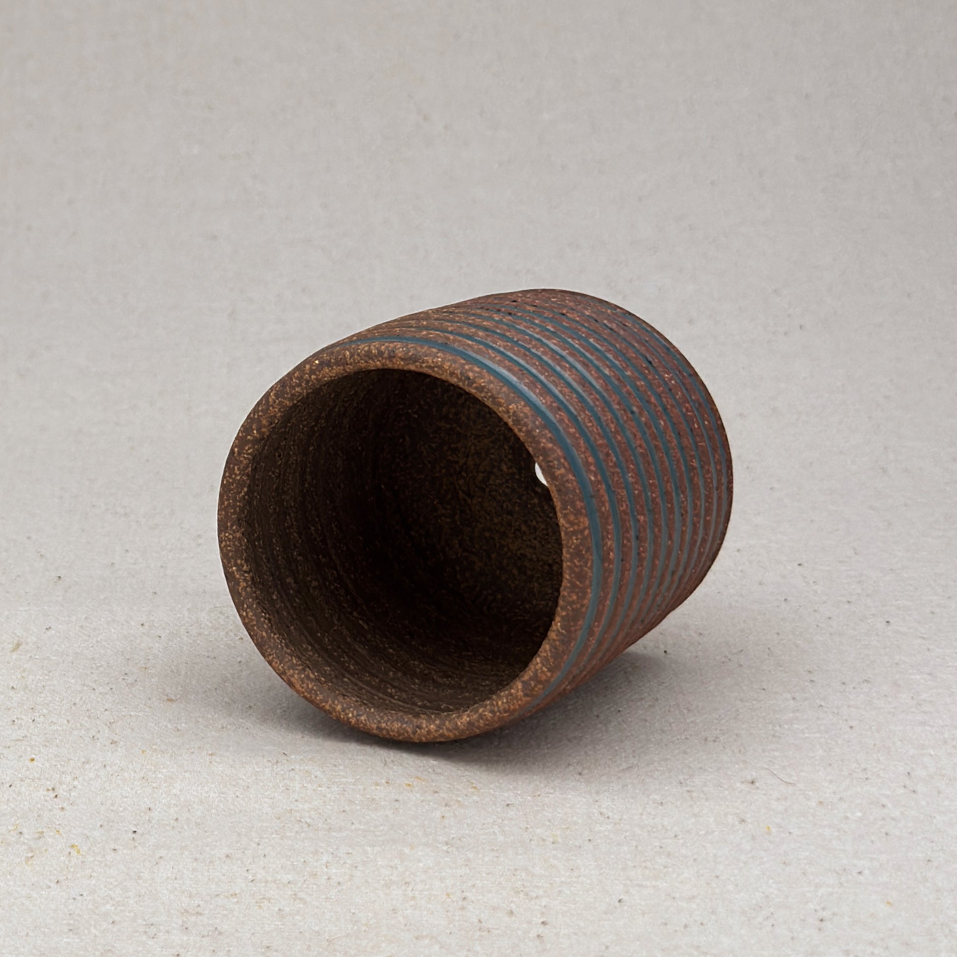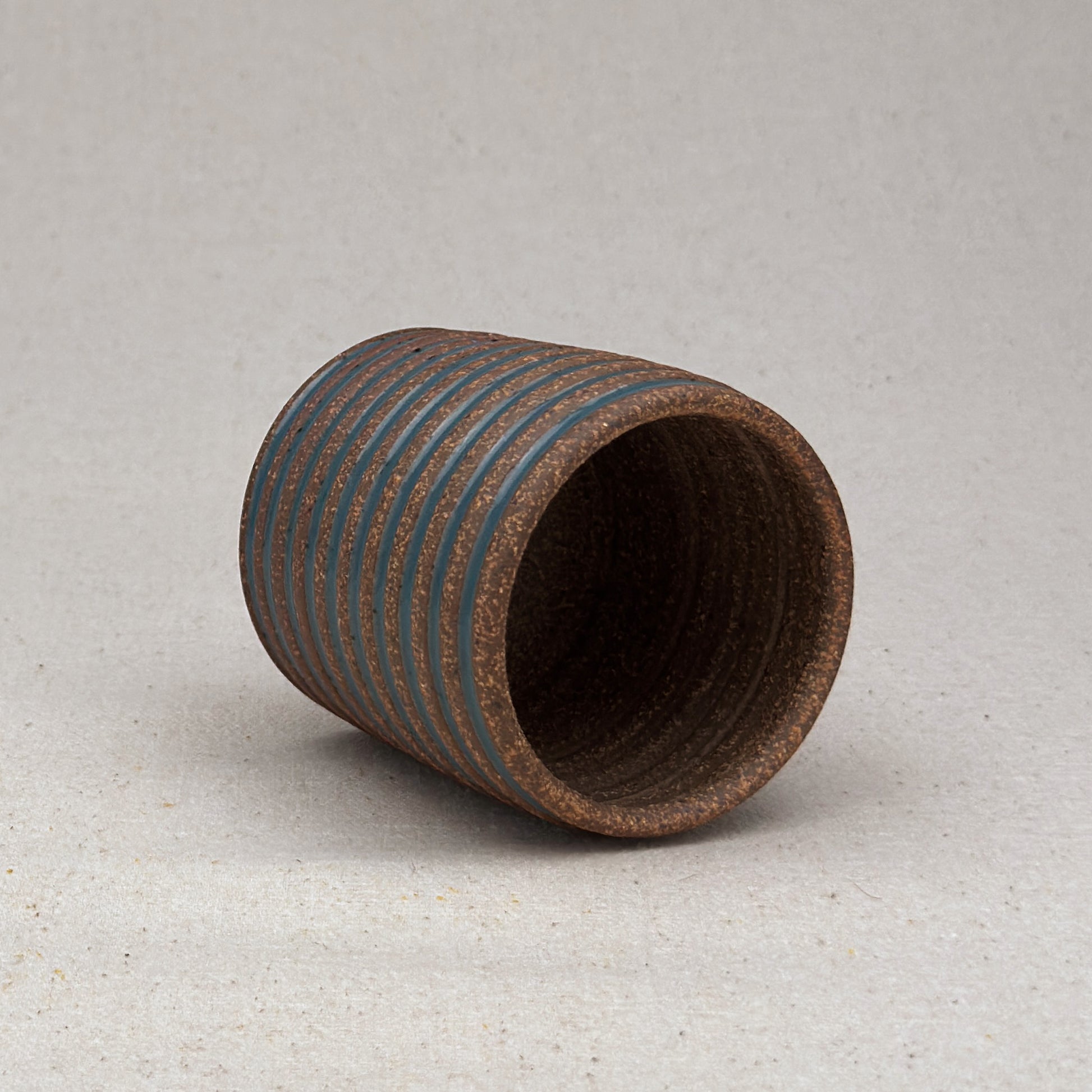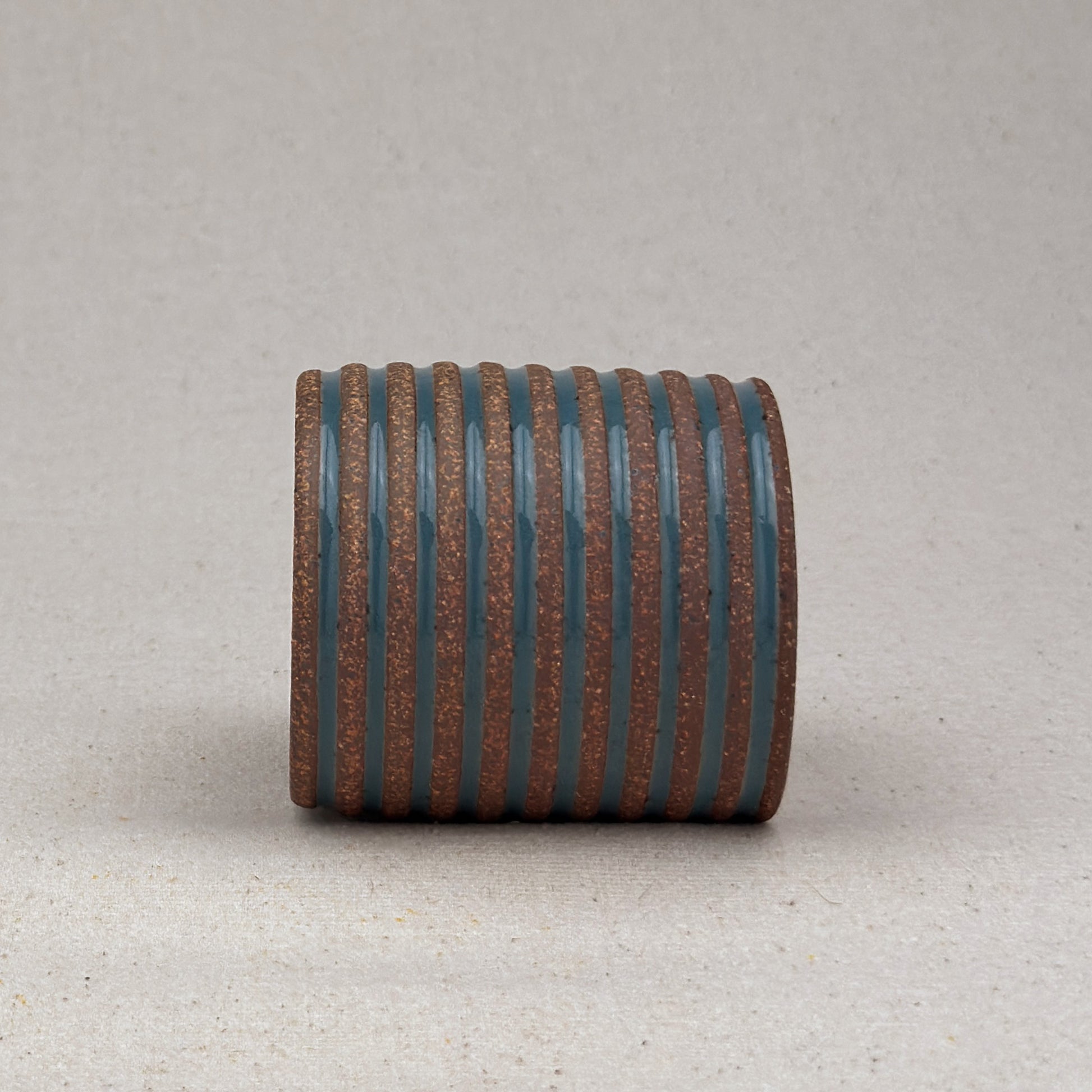 This blue striped ceramic planter was made on the potters wheel. When I threw it, I used a textured potter’s rib to form a deep groove into the wet clay. I used an transparent blue glaze letting it pool among the ridges. I left the peaks unglazed, so you can see iron-based clay.