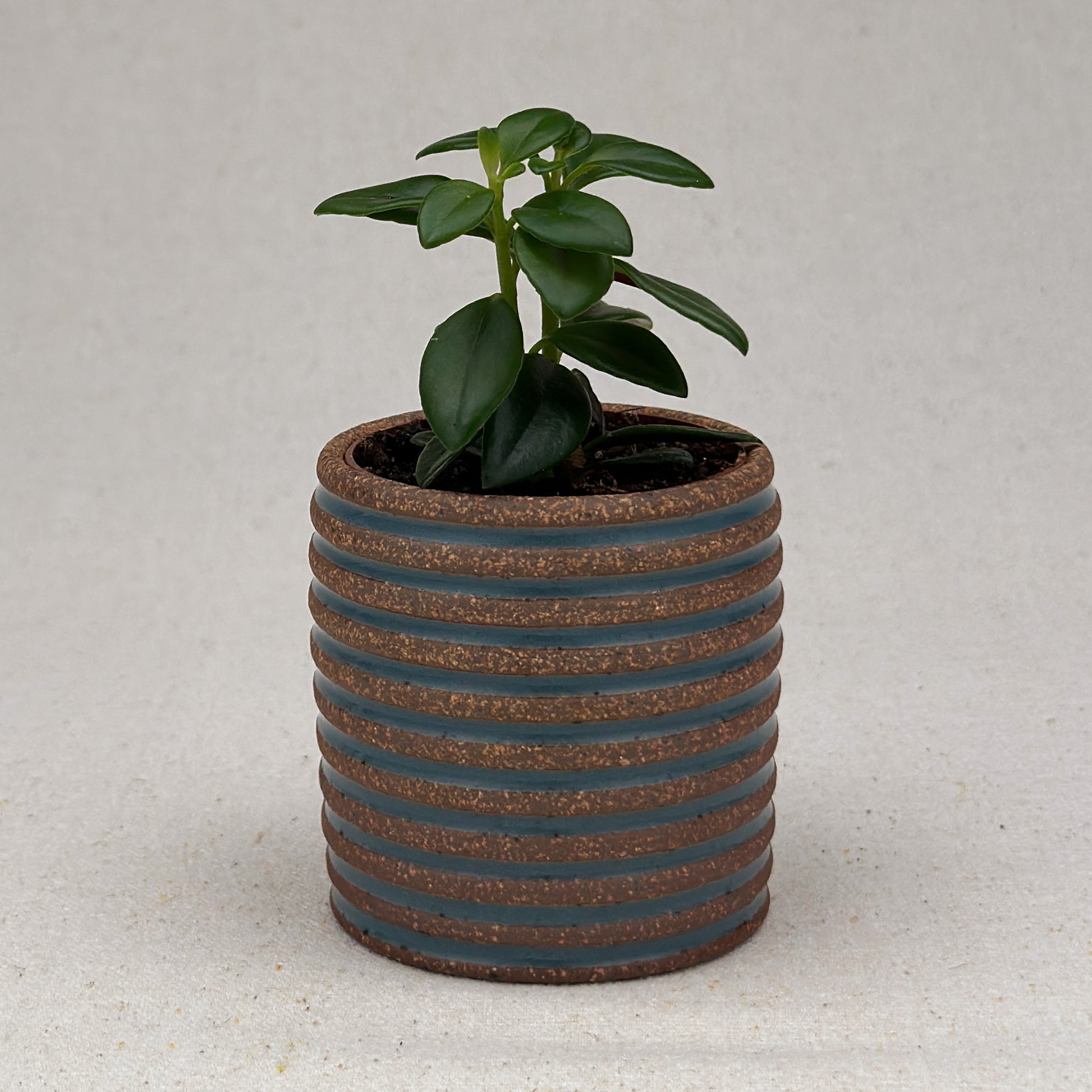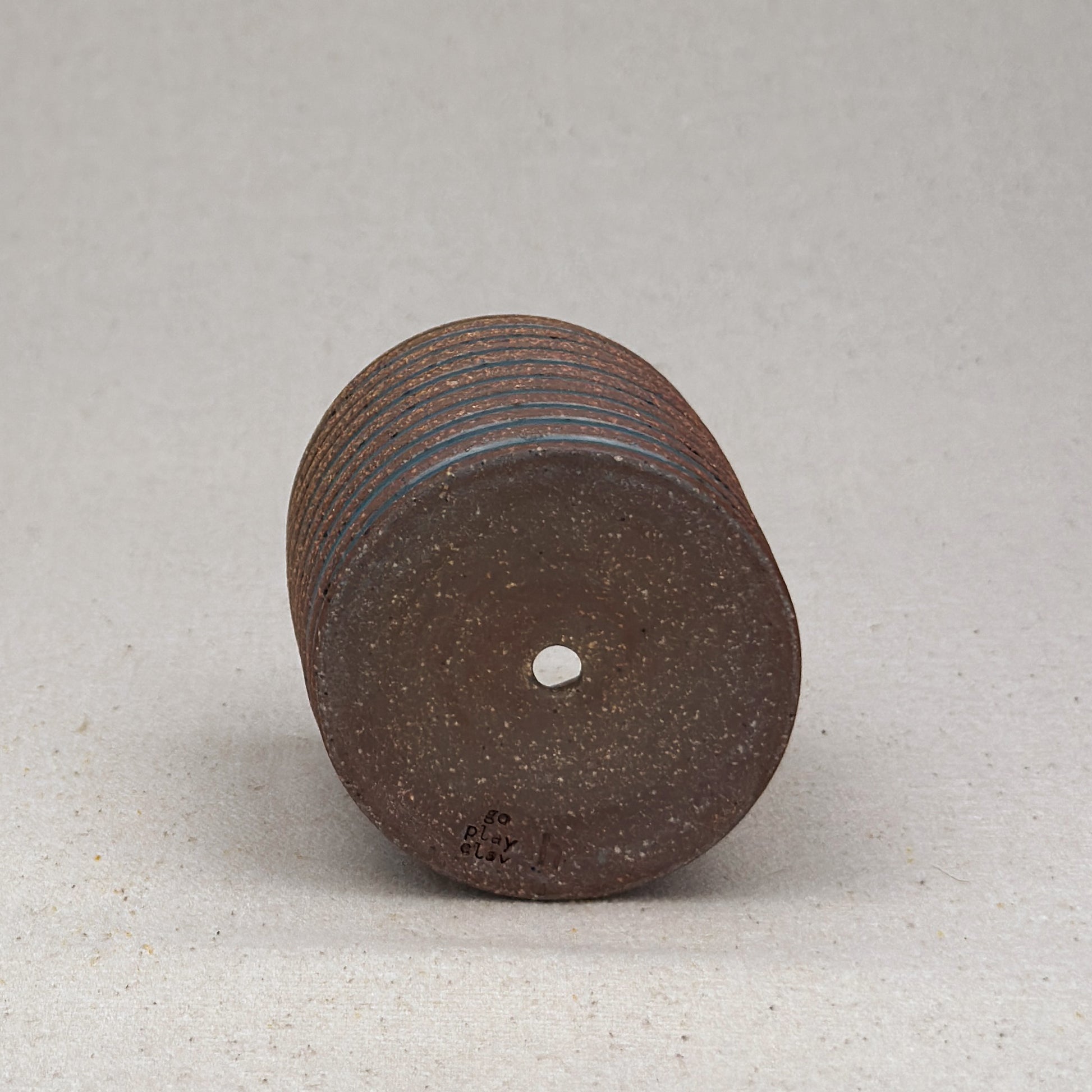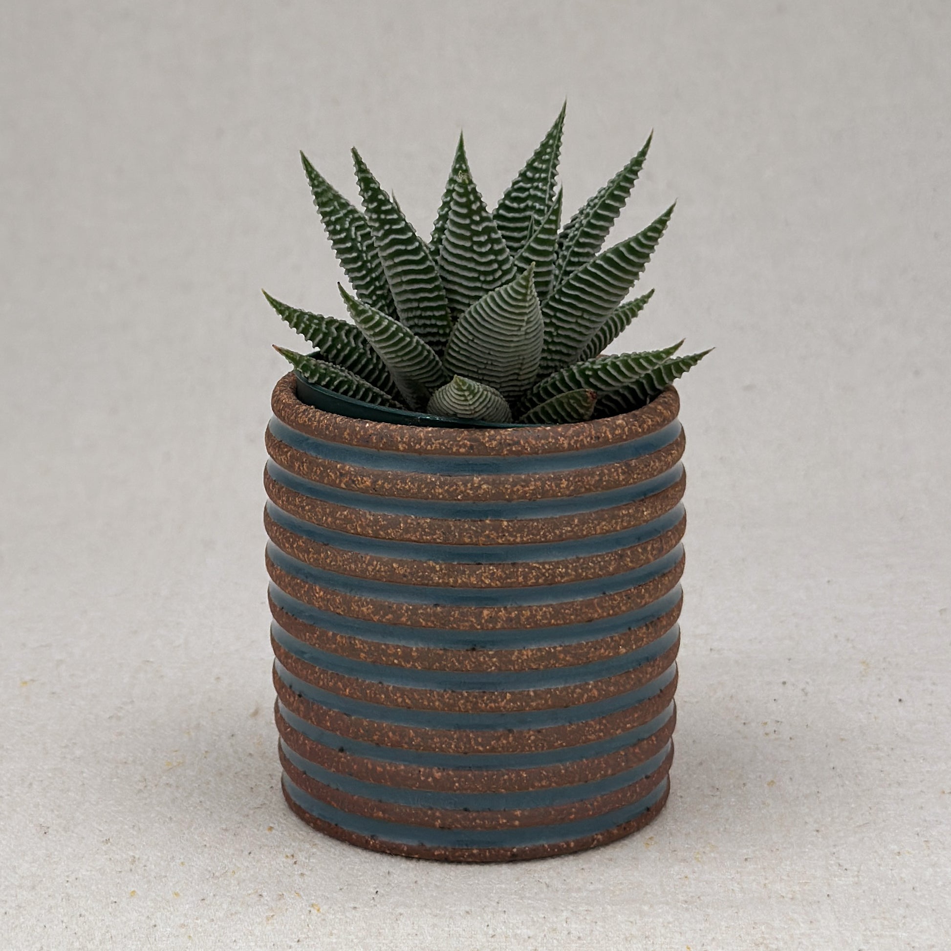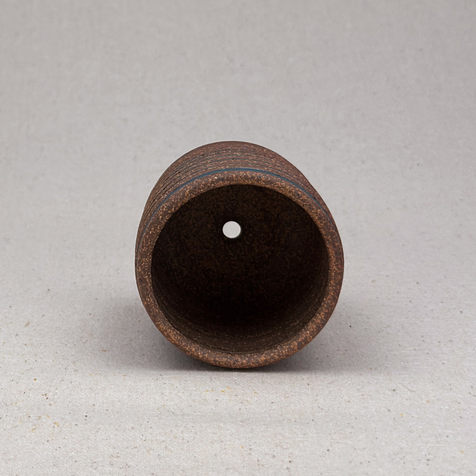 This blue striped ceramic planter was made on the potters wheel. When I threw it, I used a textured potter’s rib to form a deep groove into the wet clay. I used an transparent blue glaze letting it pool among the ridges. I left the peaks unglazed, so you can see iron-based clay.