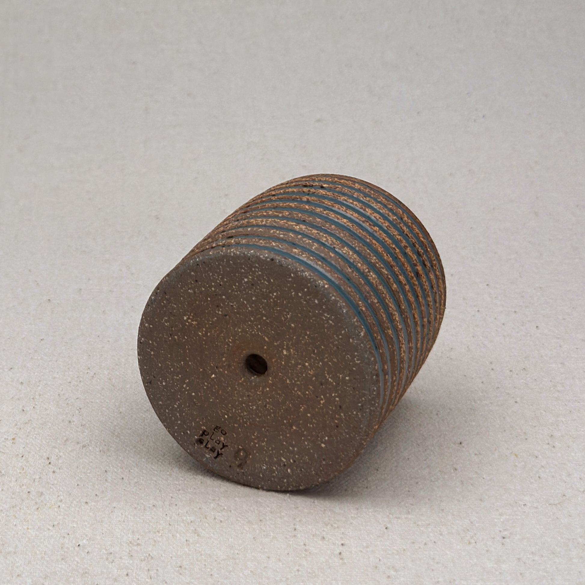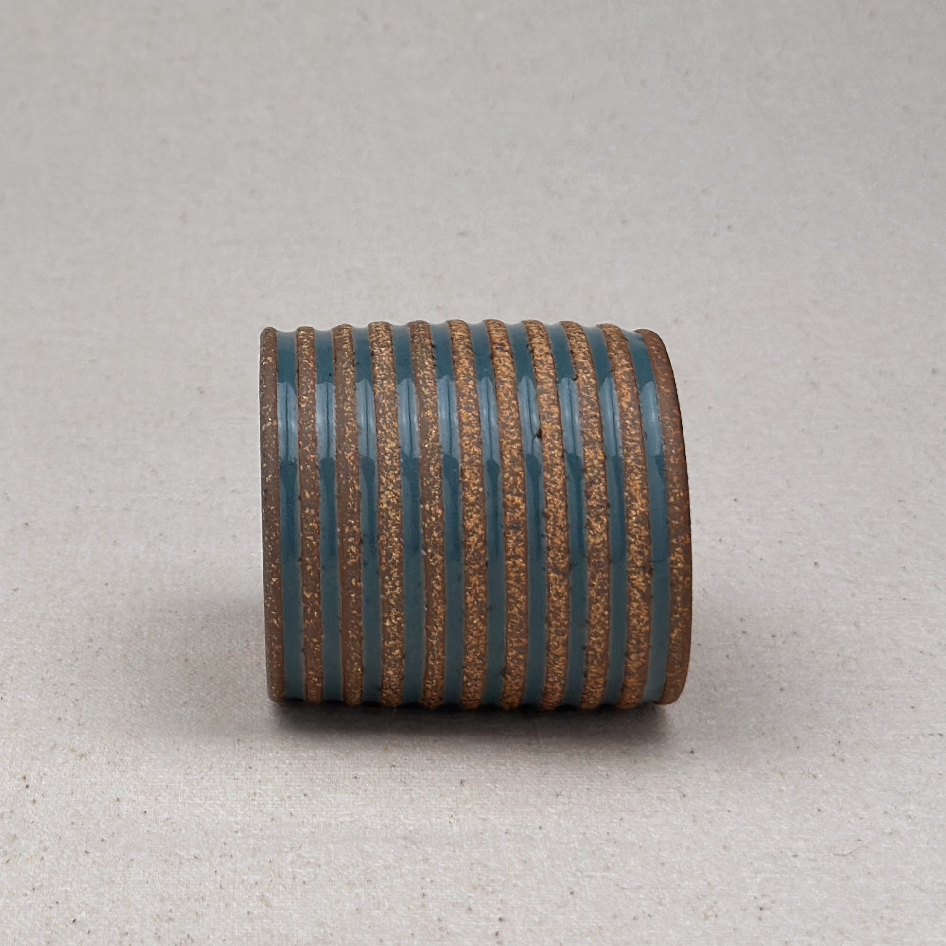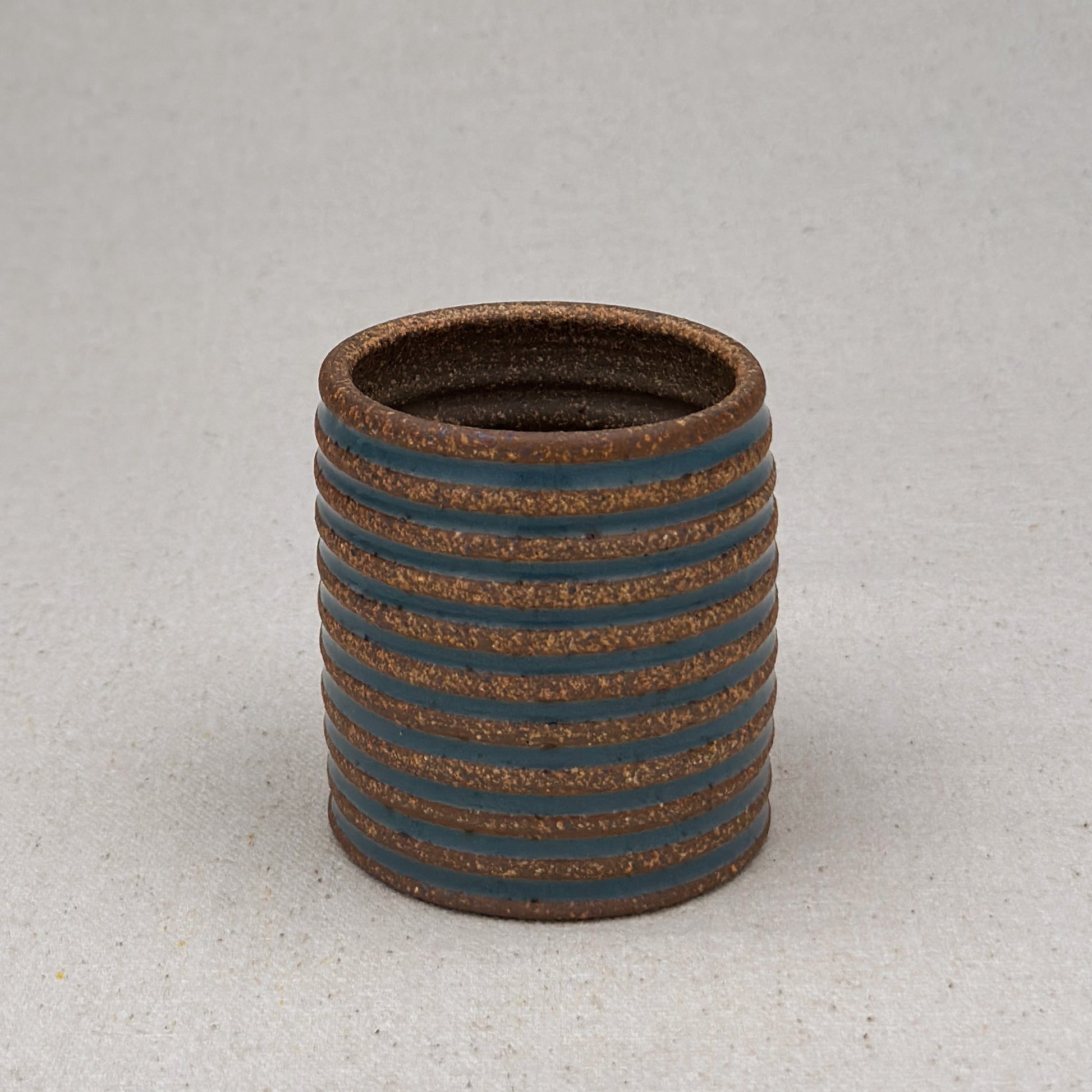 This blue striped ceramic planter was made on the potters wheel. When I threw it, I used a textured potter’s rib to form a deep groove into the wet clay. I used an transparent blue glaze letting it pool among the ridges. I left the peaks unglazed, so you can see iron-based clay.