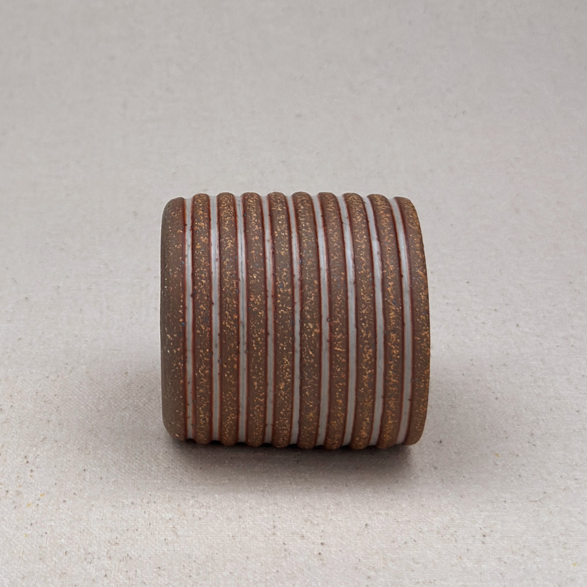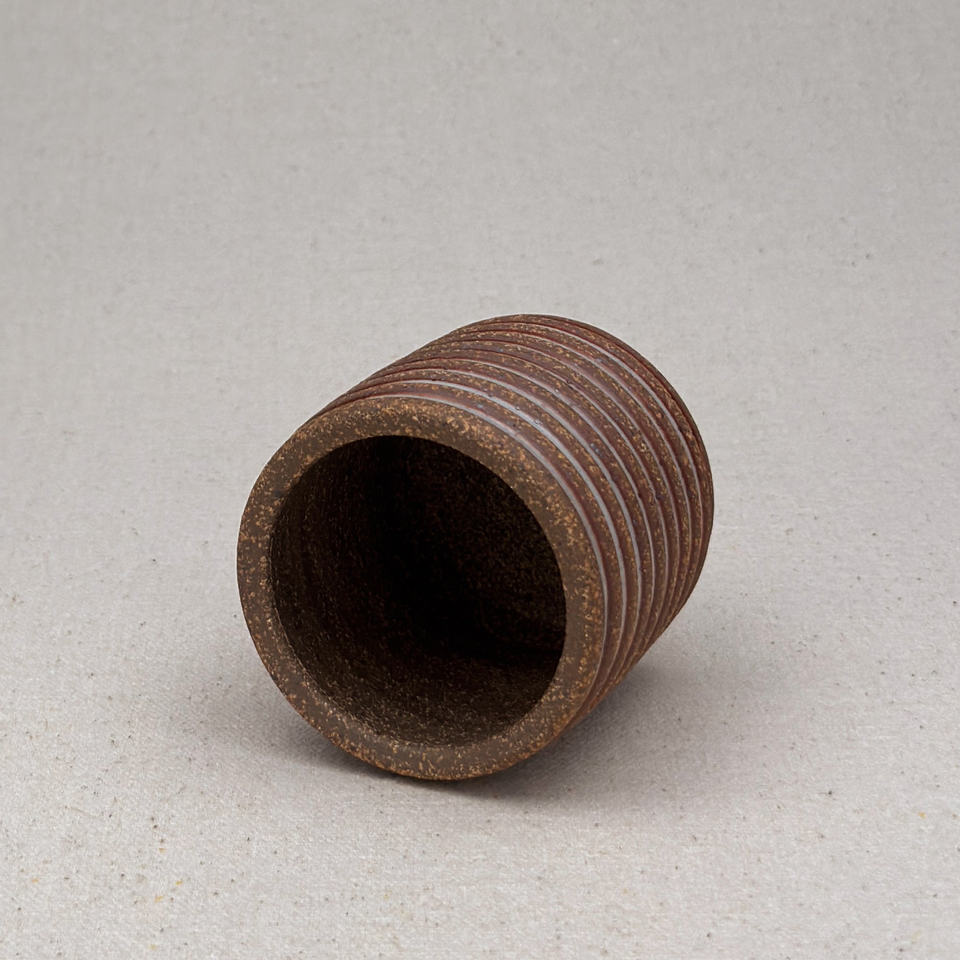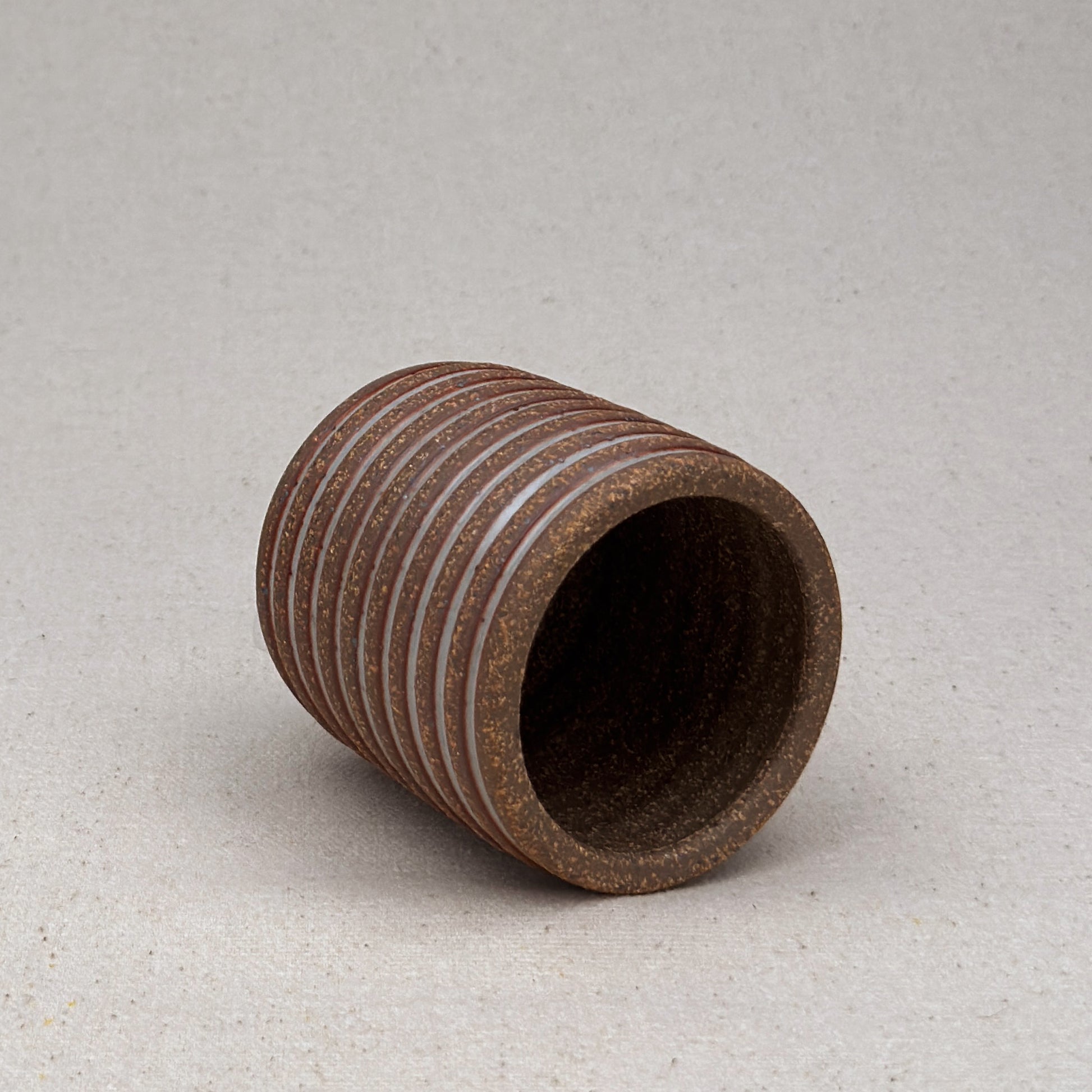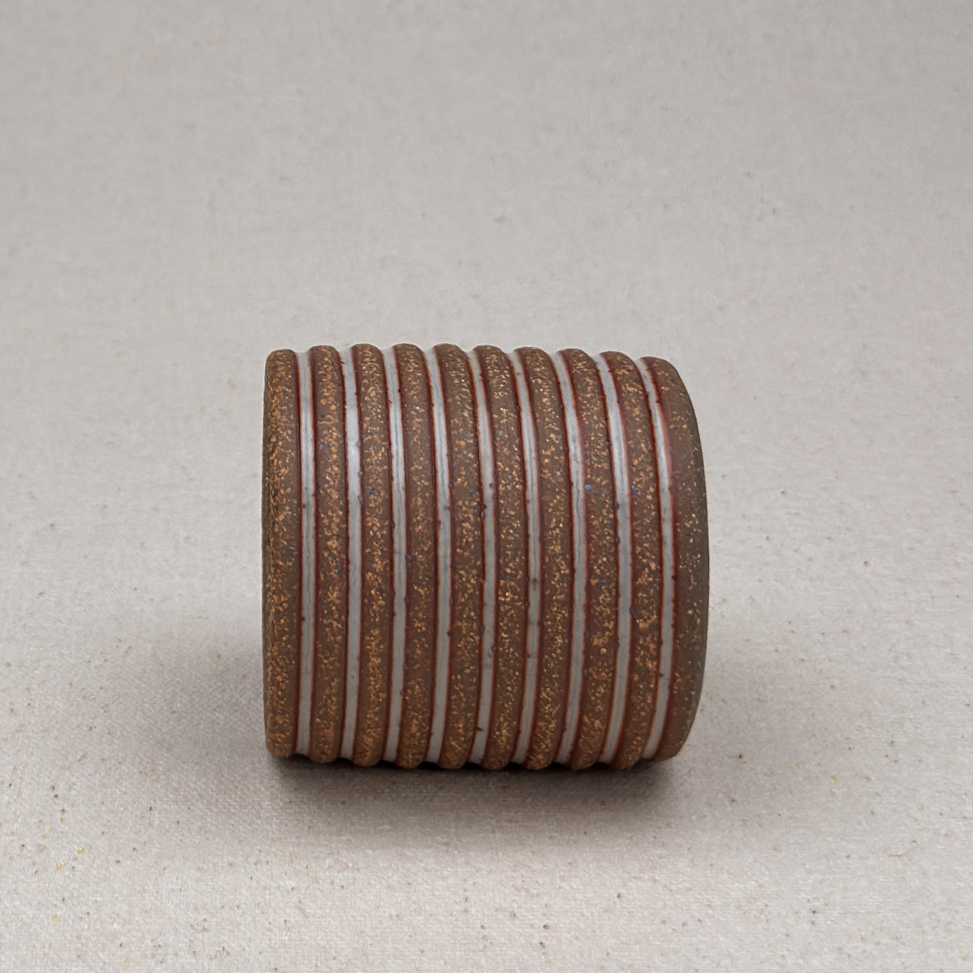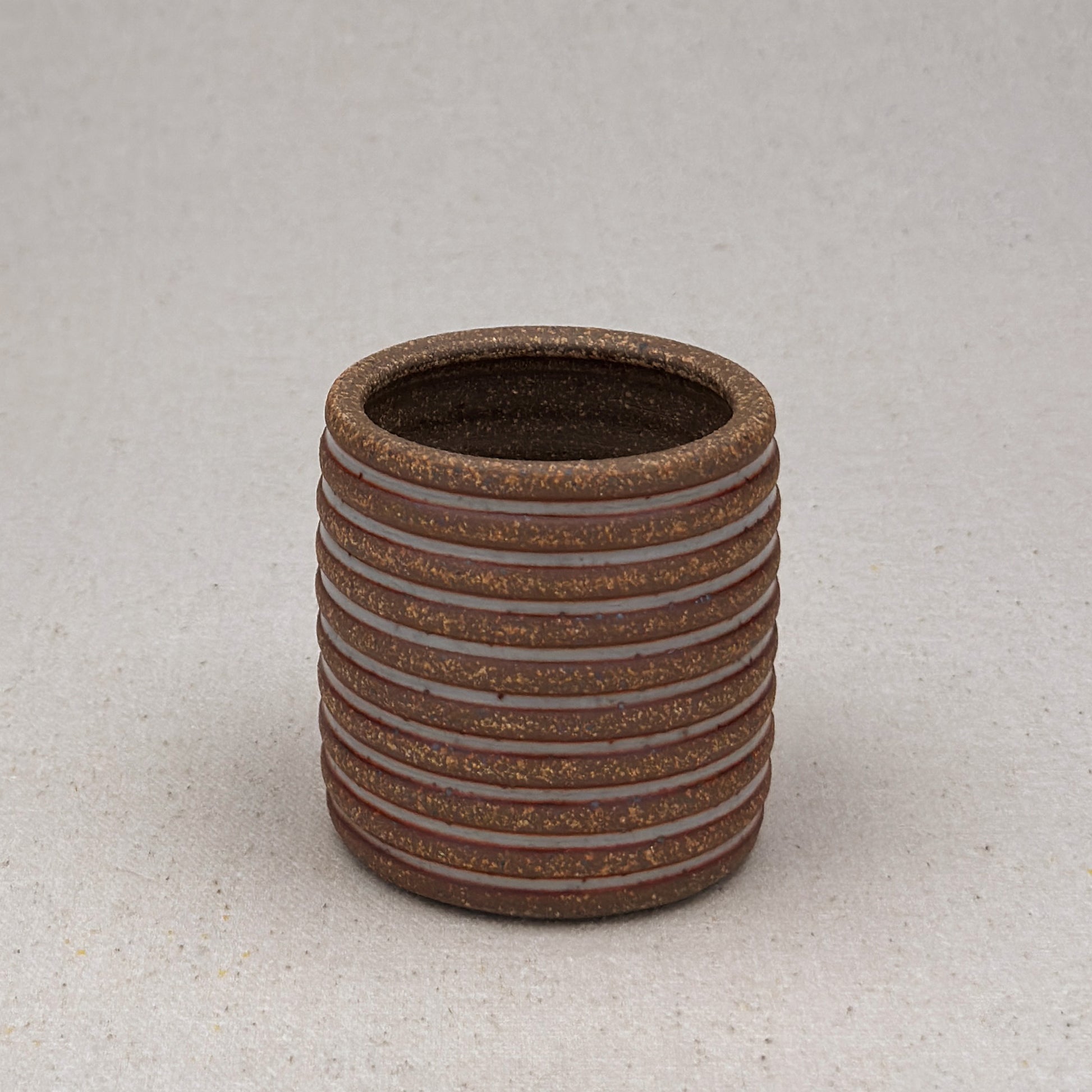 This shino striped ceramic planter was made on the potters wheel. When I threw it, I used a textured potter’s rib to form a deep groove into the wet clay. I used a shino glaze letting it pool among the ridges. I left the peaks unglazed, so you can see iron-based clay.