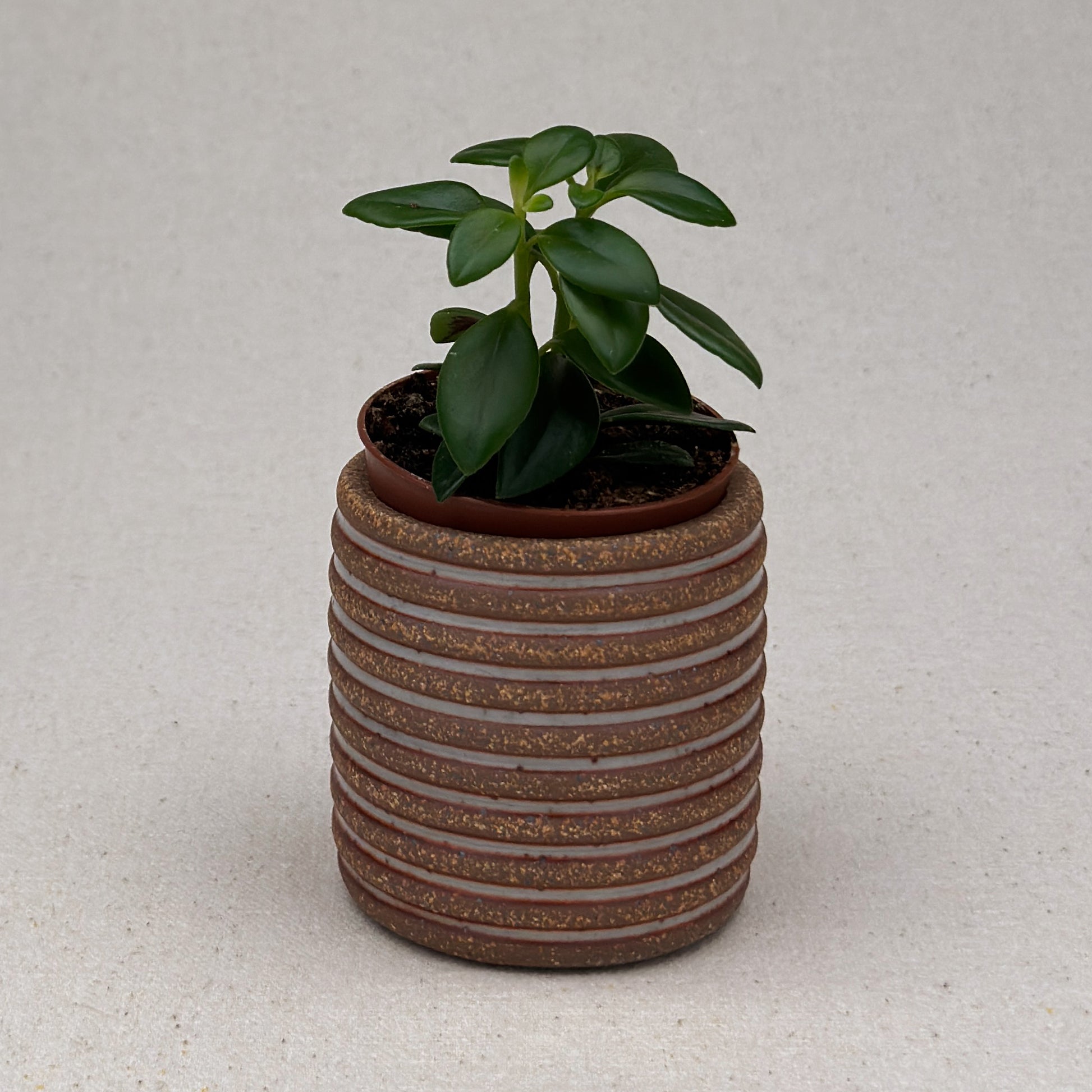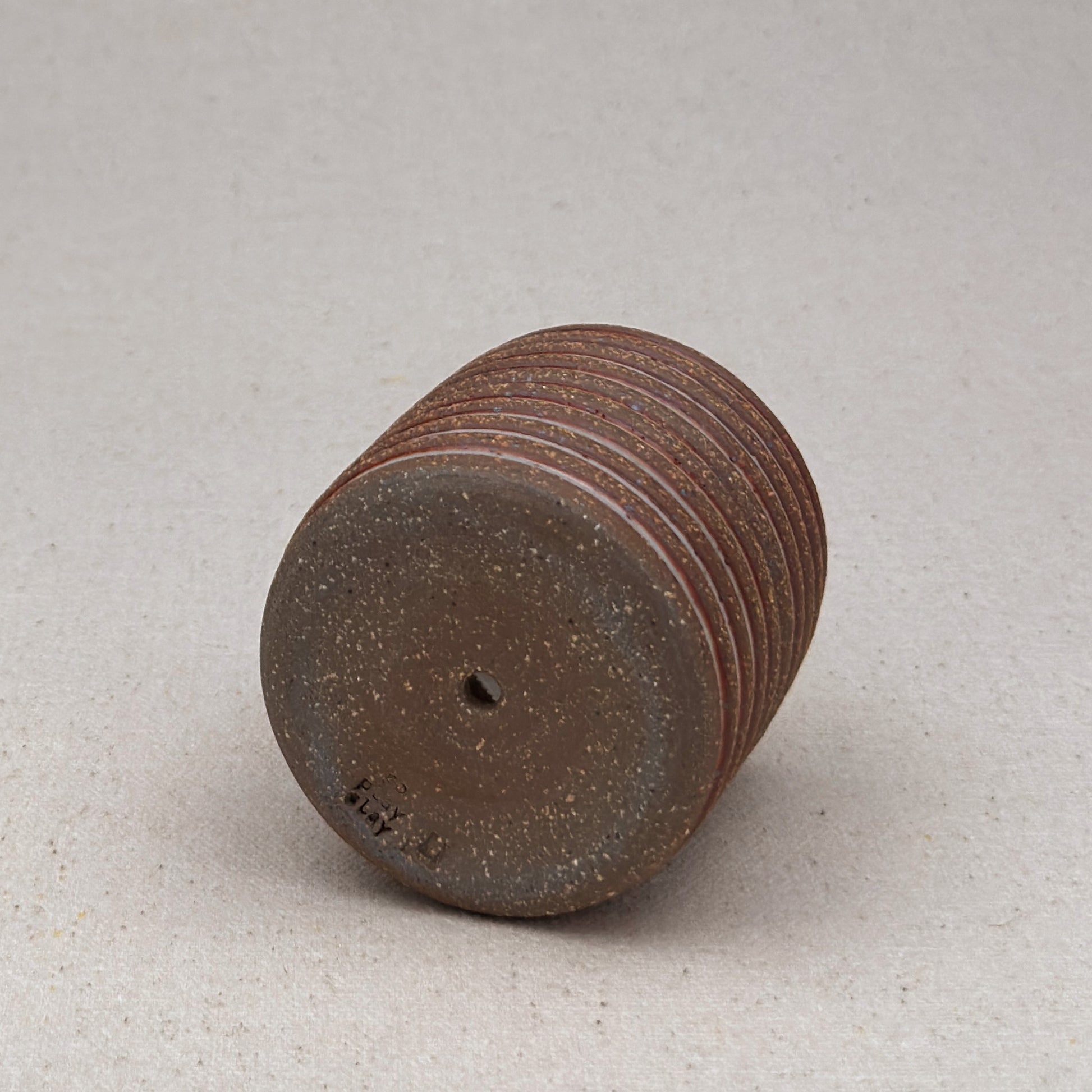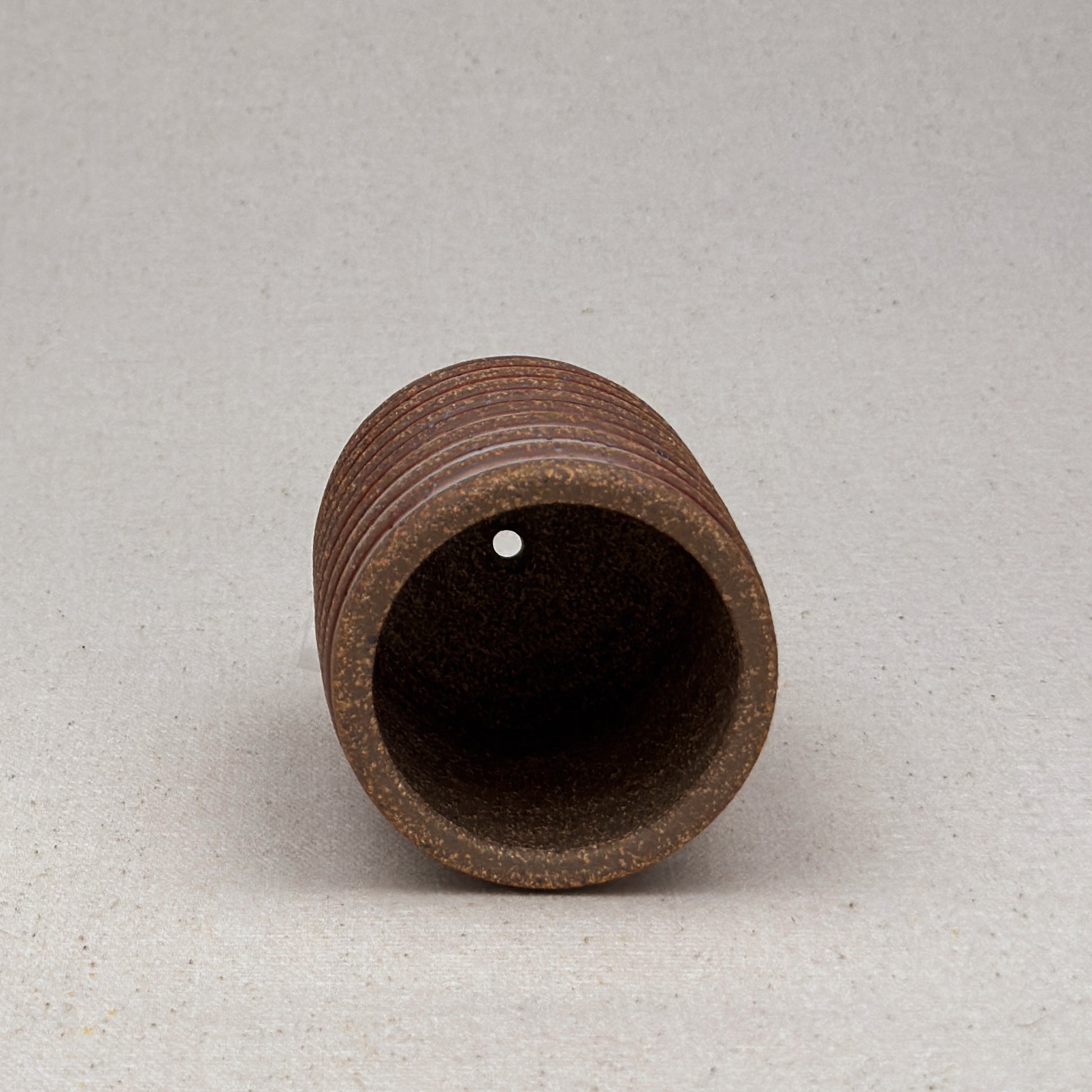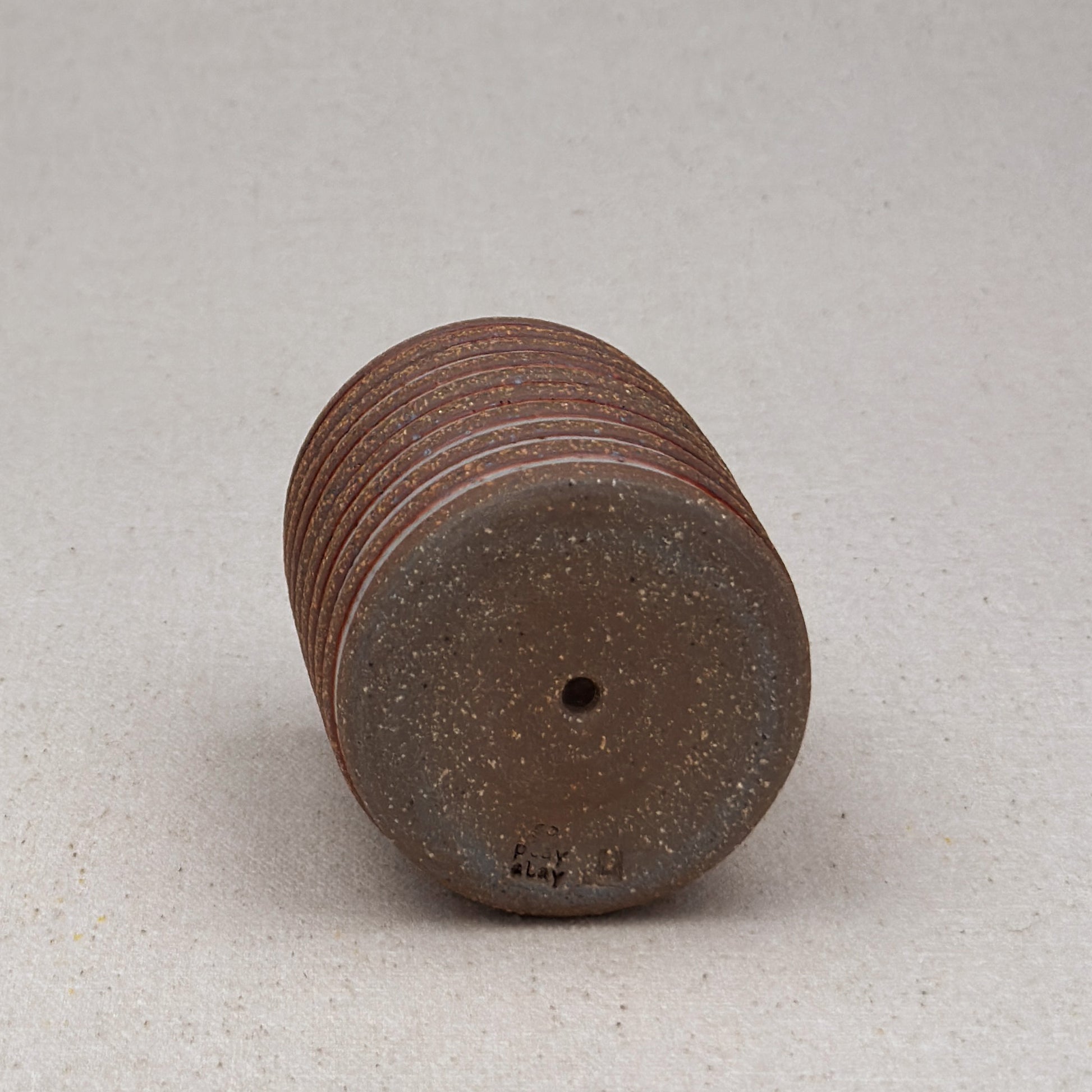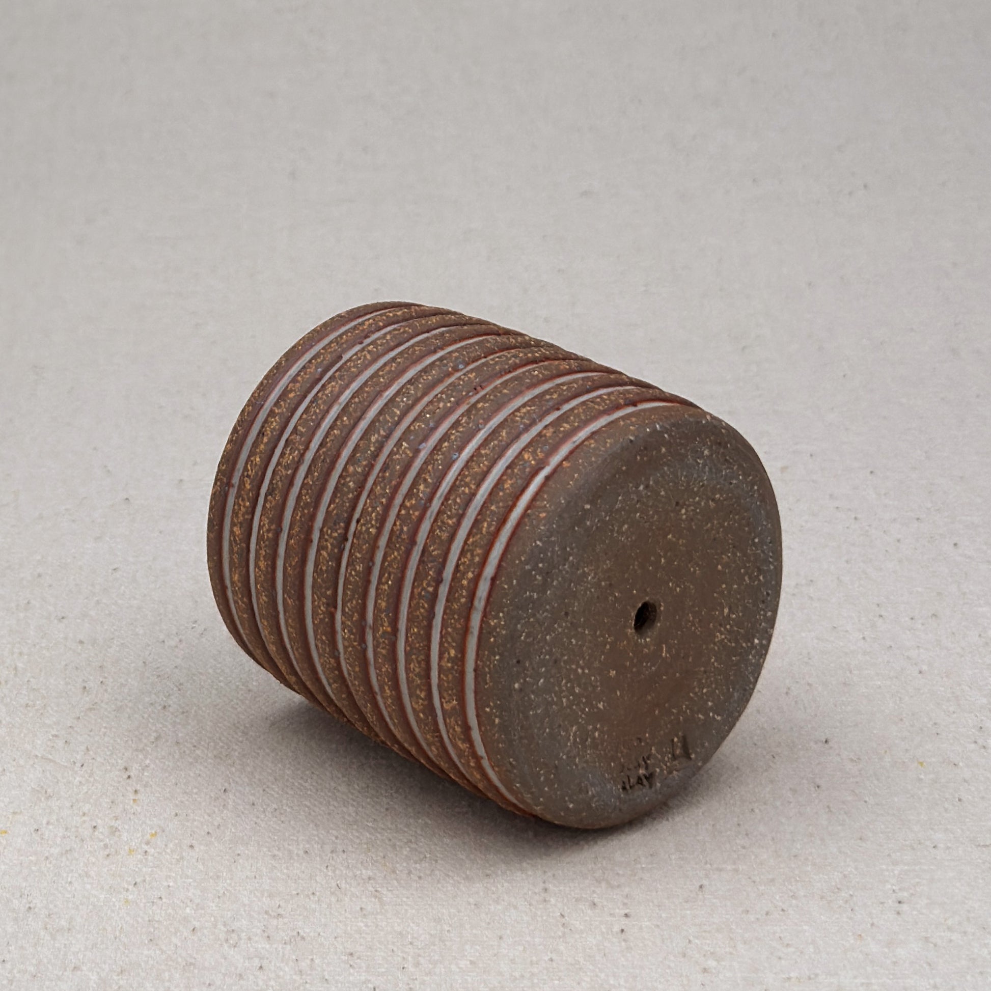 This shino striped ceramic planter was made on the potters wheel. When I threw it, I used a textured potter’s rib to form a deep groove into the wet clay. I used a shino glaze letting it pool among the ridges. I left the peaks unglazed, so you can see iron-based clay.