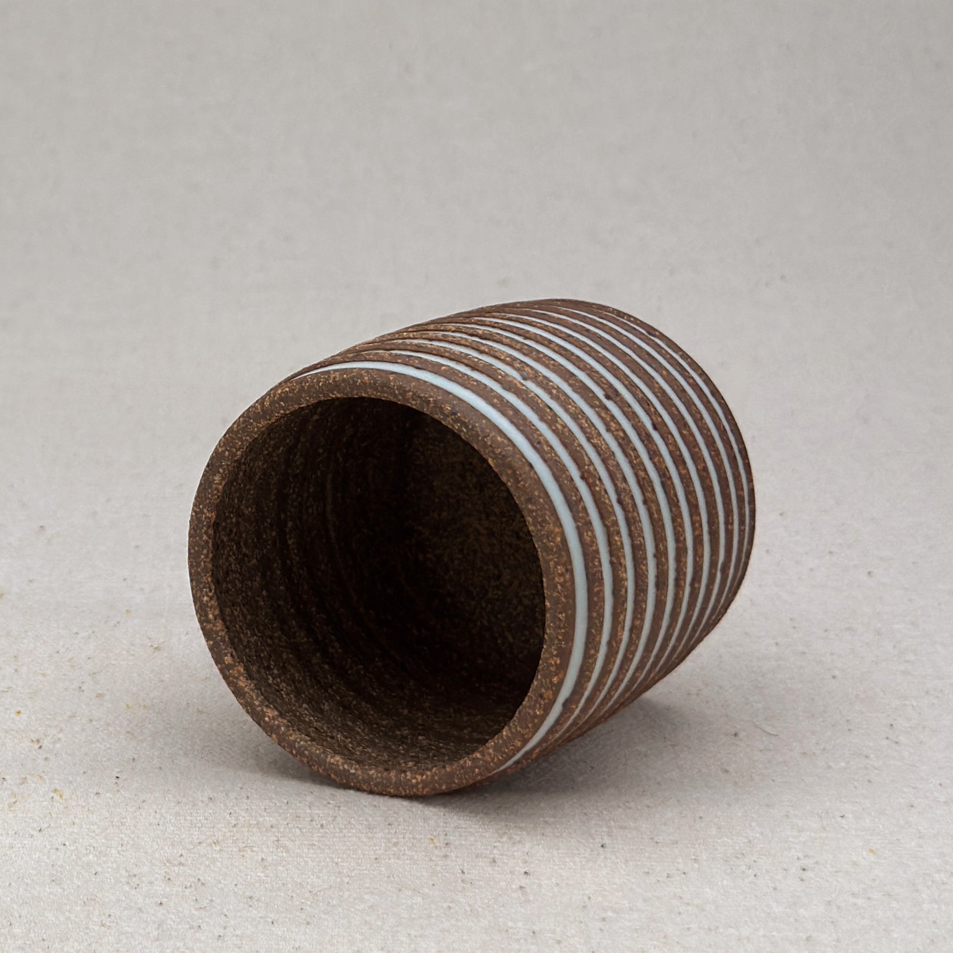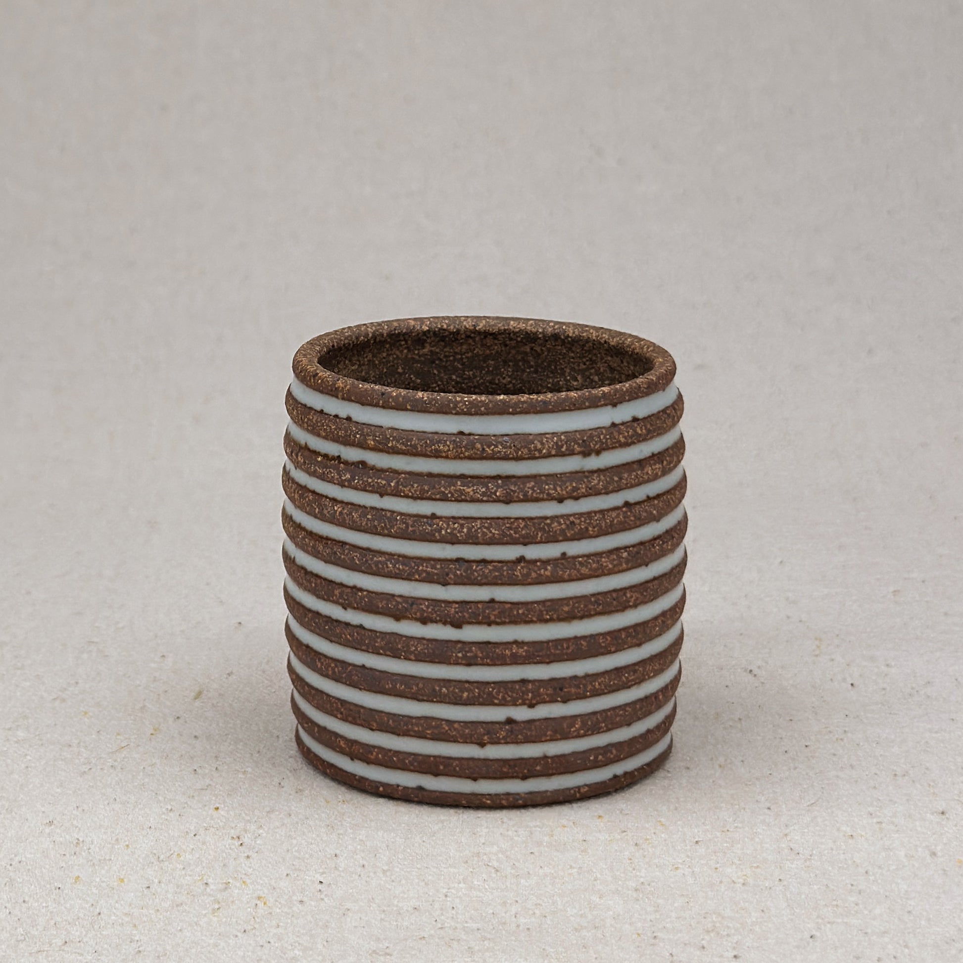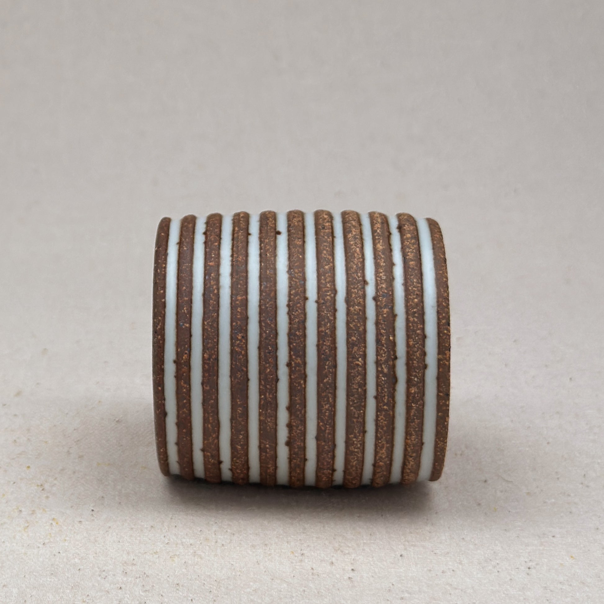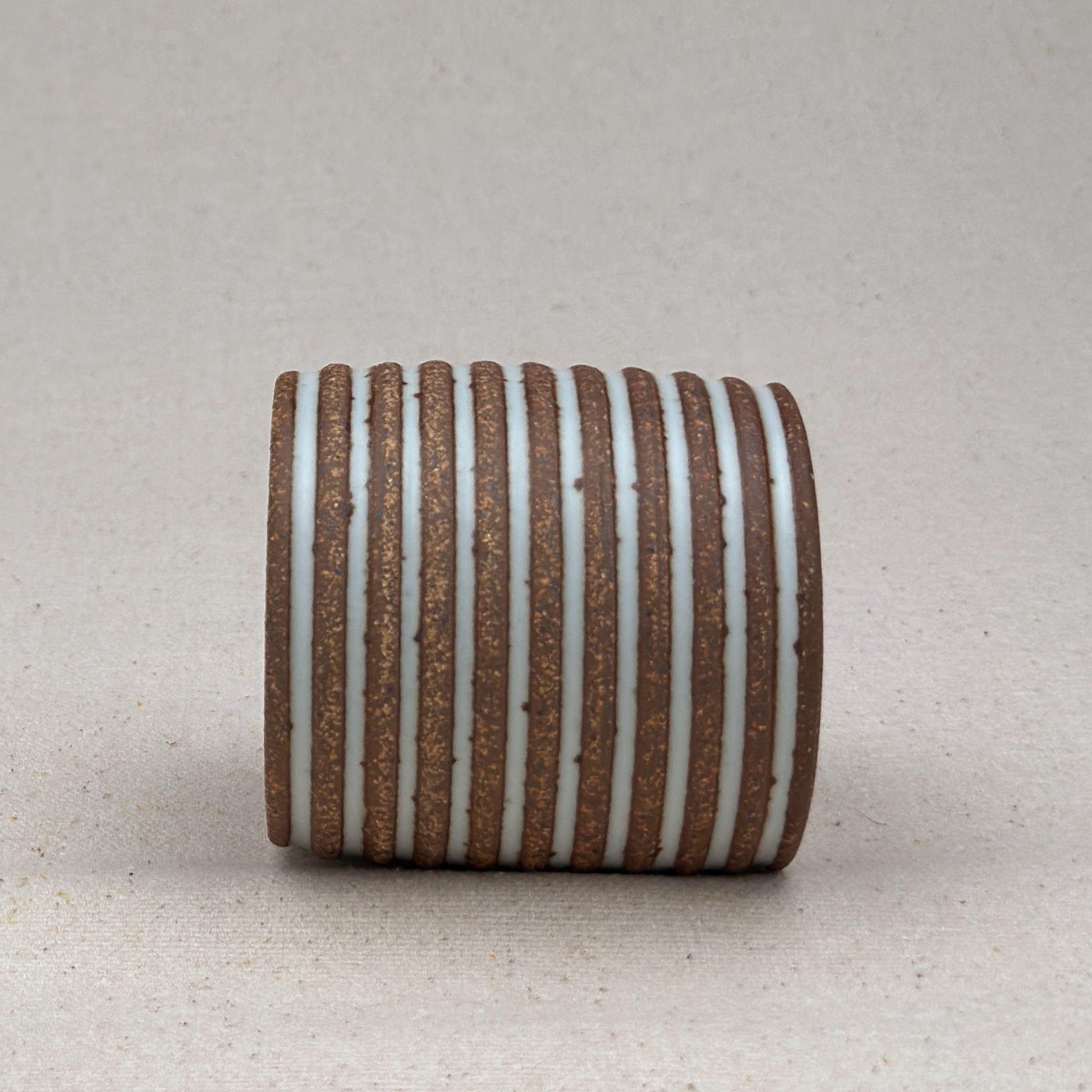This white striped ceramic planter was made on the potters wheel. When I threw it, I used a textured potter’s rib to form a deep groove into the wet clay. I used an opaque white glaze letting it pool among the ridges. I left the peaks unglazed, so you can see iron-based clay.