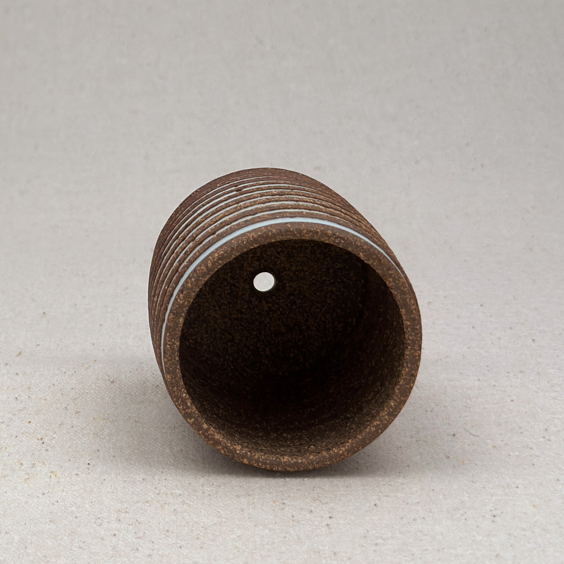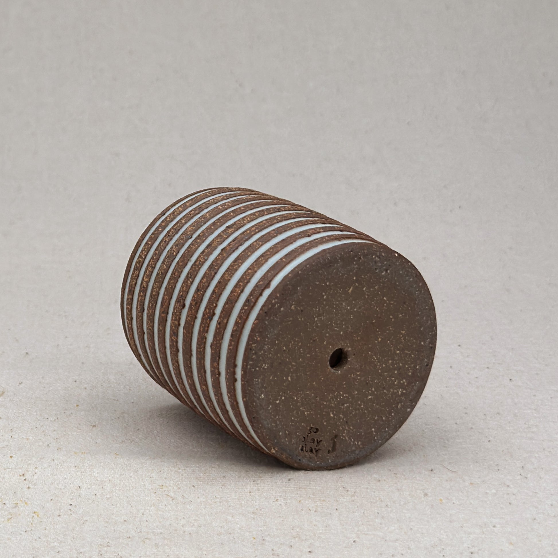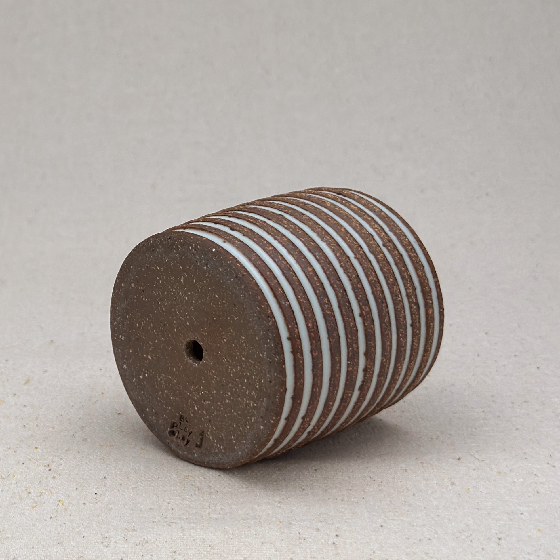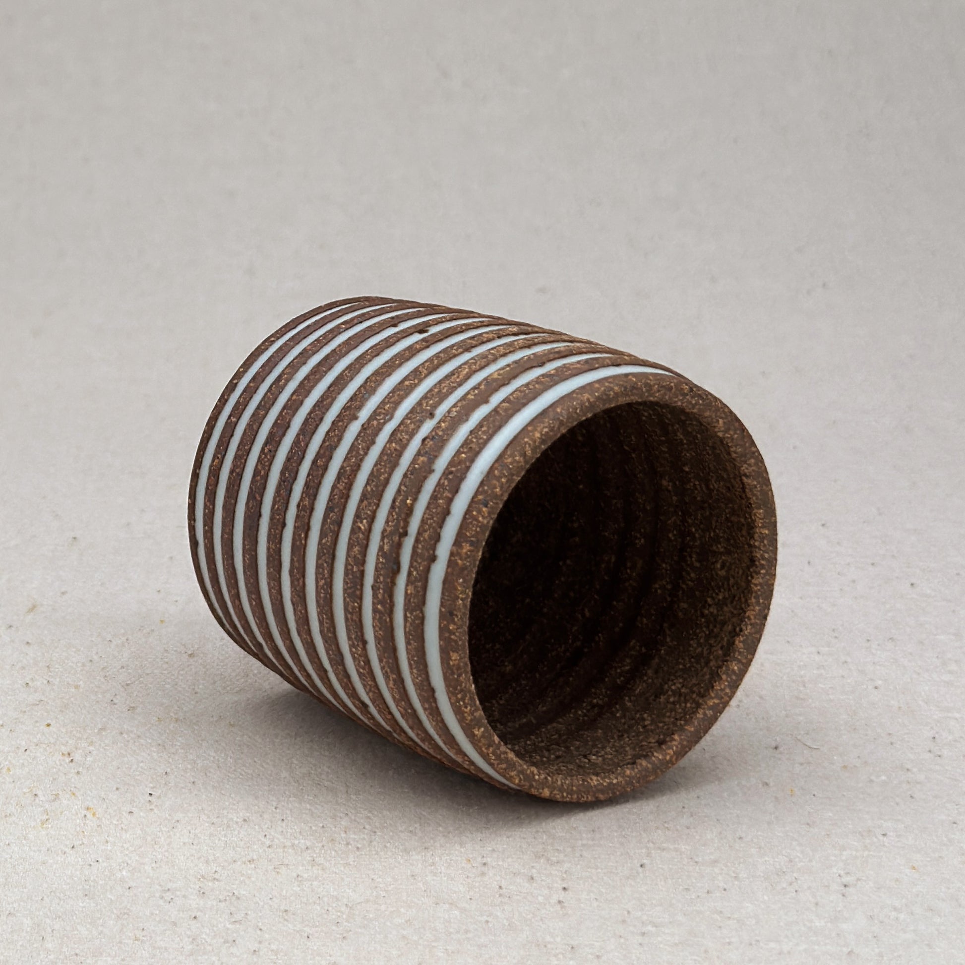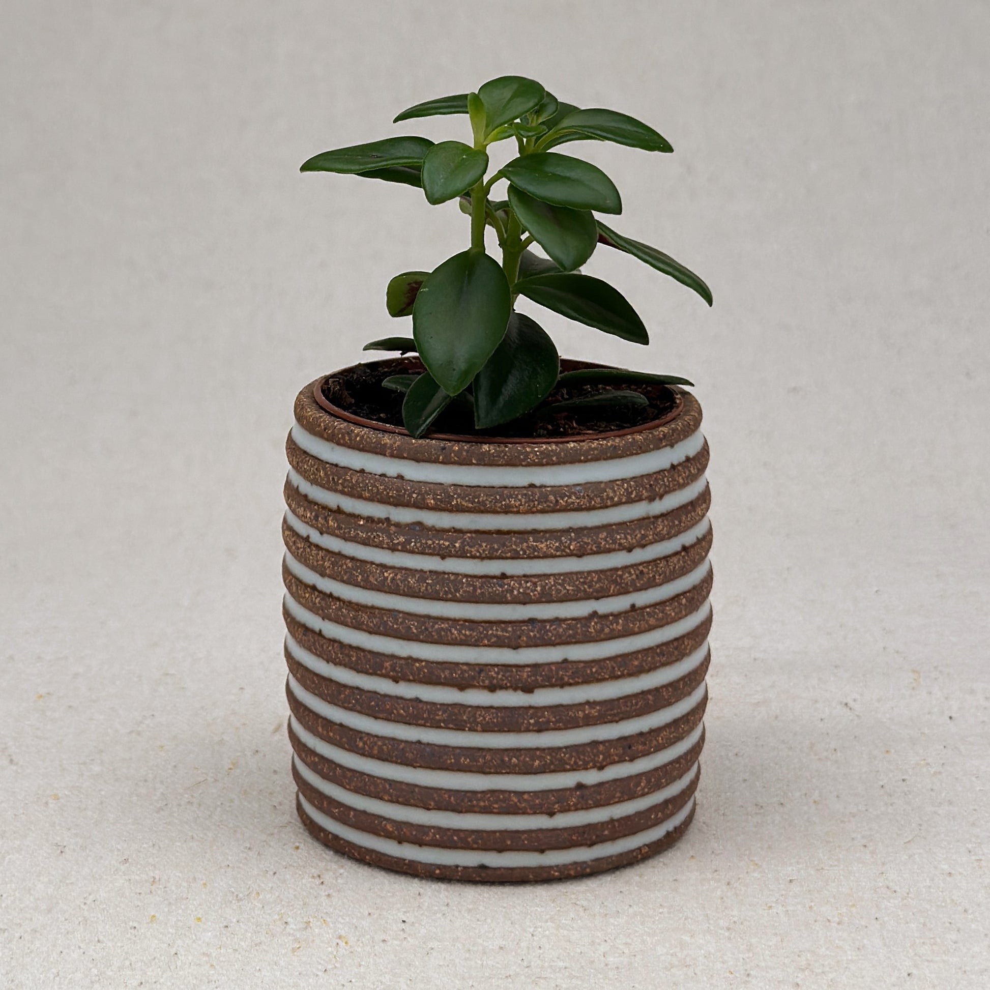 This white striped ceramic planter was made on the potters wheel. When I threw it, I used a textured potter’s rib to form a deep groove into the wet clay. I used an opaque white glaze letting it pool among the ridges. I left the peaks unglazed, so you can see iron-based clay.