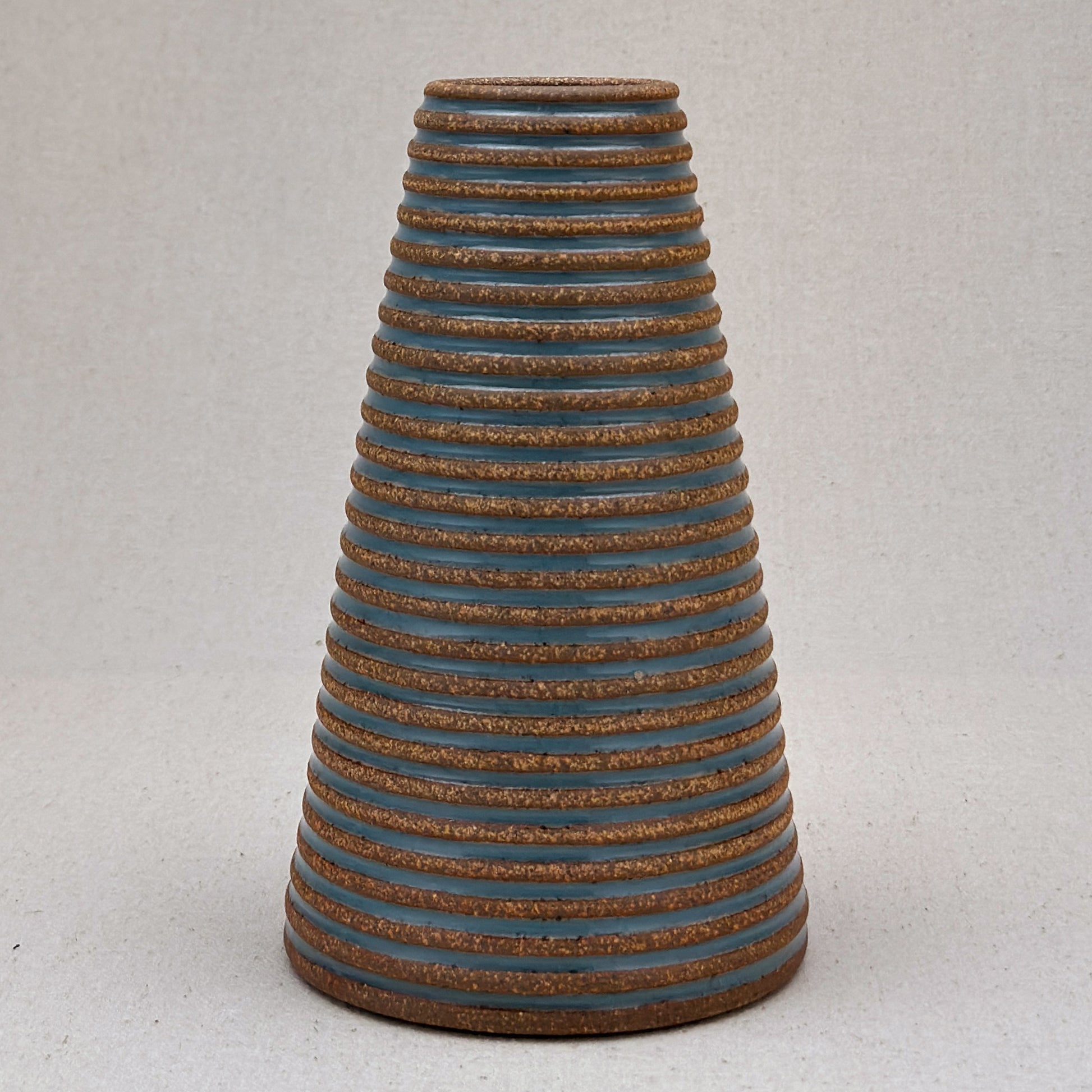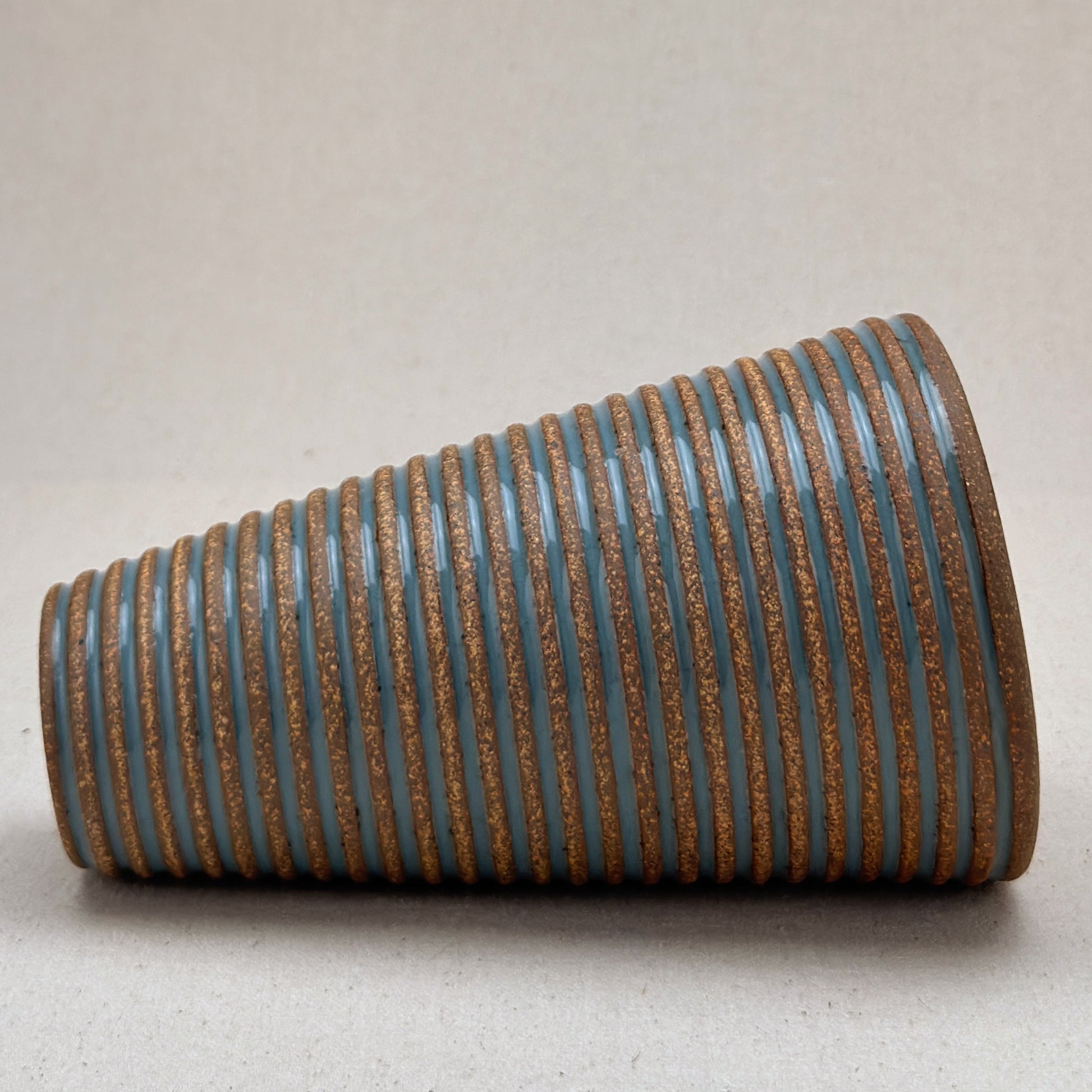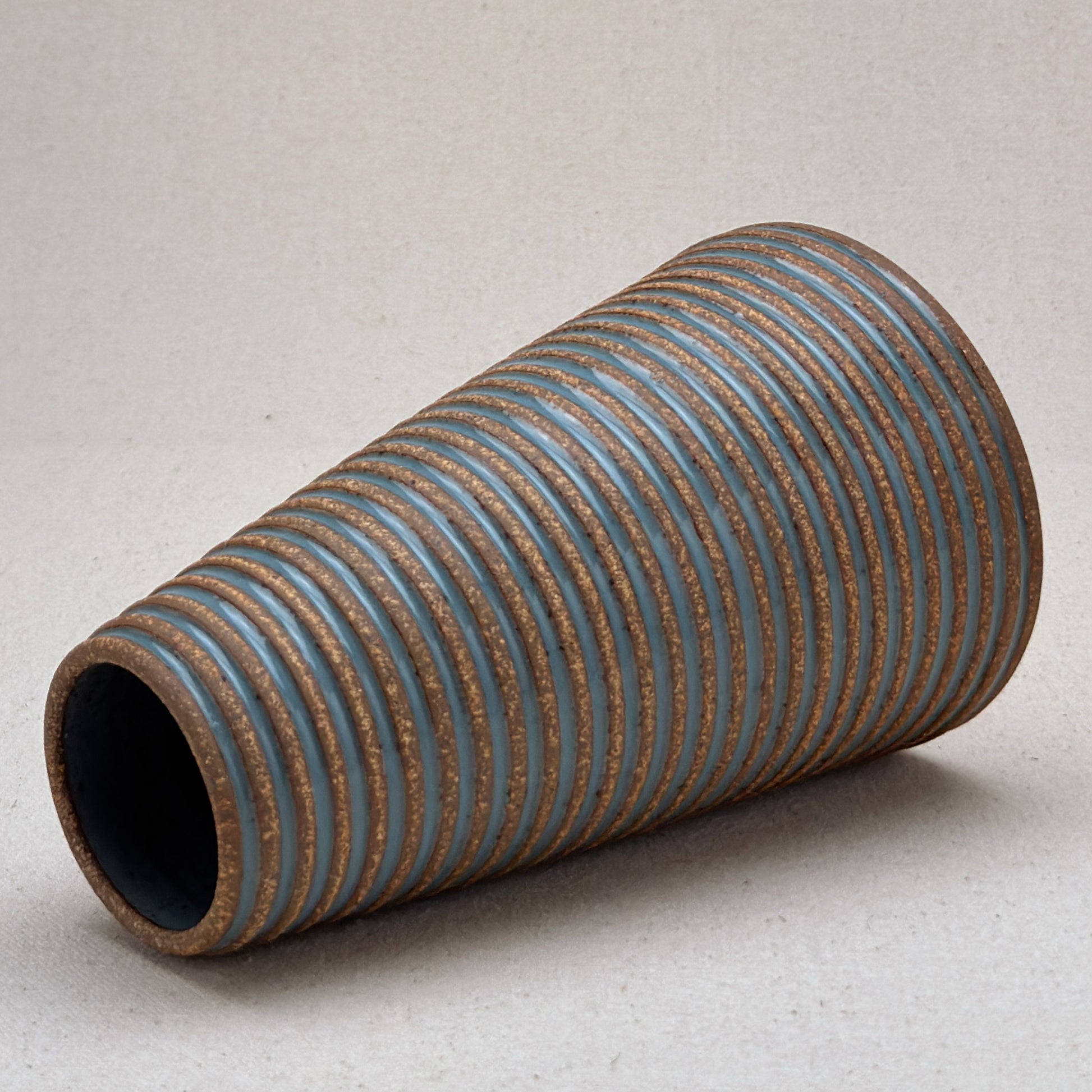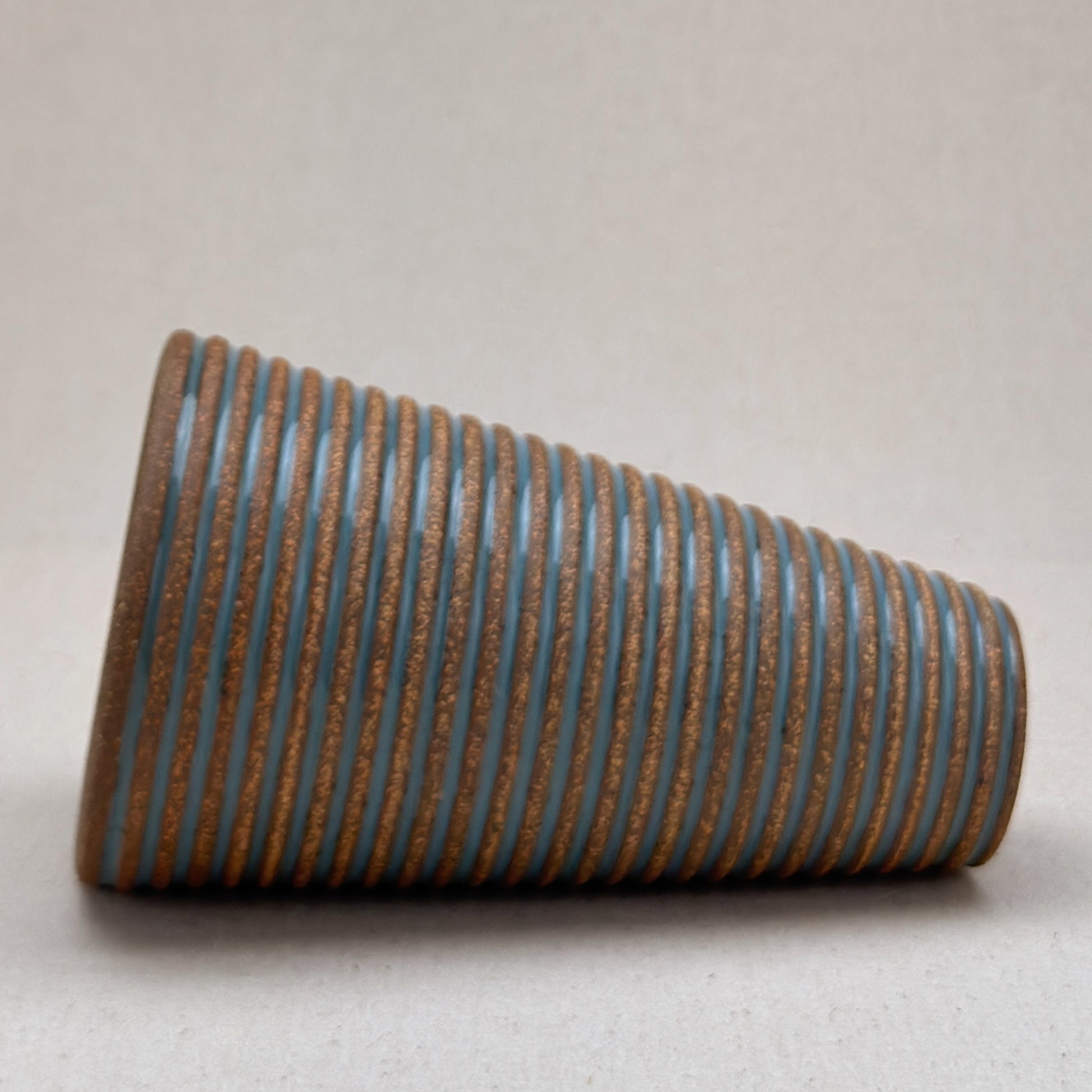 This blue striped ceramic vase was made on the potters wheel. When I threw it, I used a textured potter’s rib to form a deep groove into the wet clay. I used a transparent blue glaze letting it pool among the ridges. I left the peaks unglazed, so you can see iron-based clay.