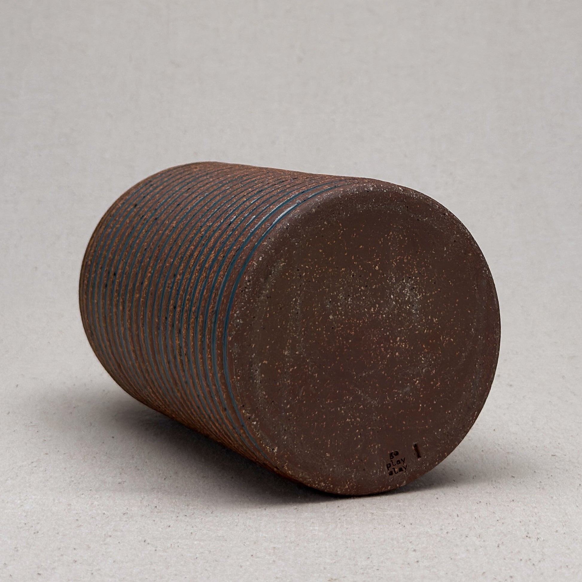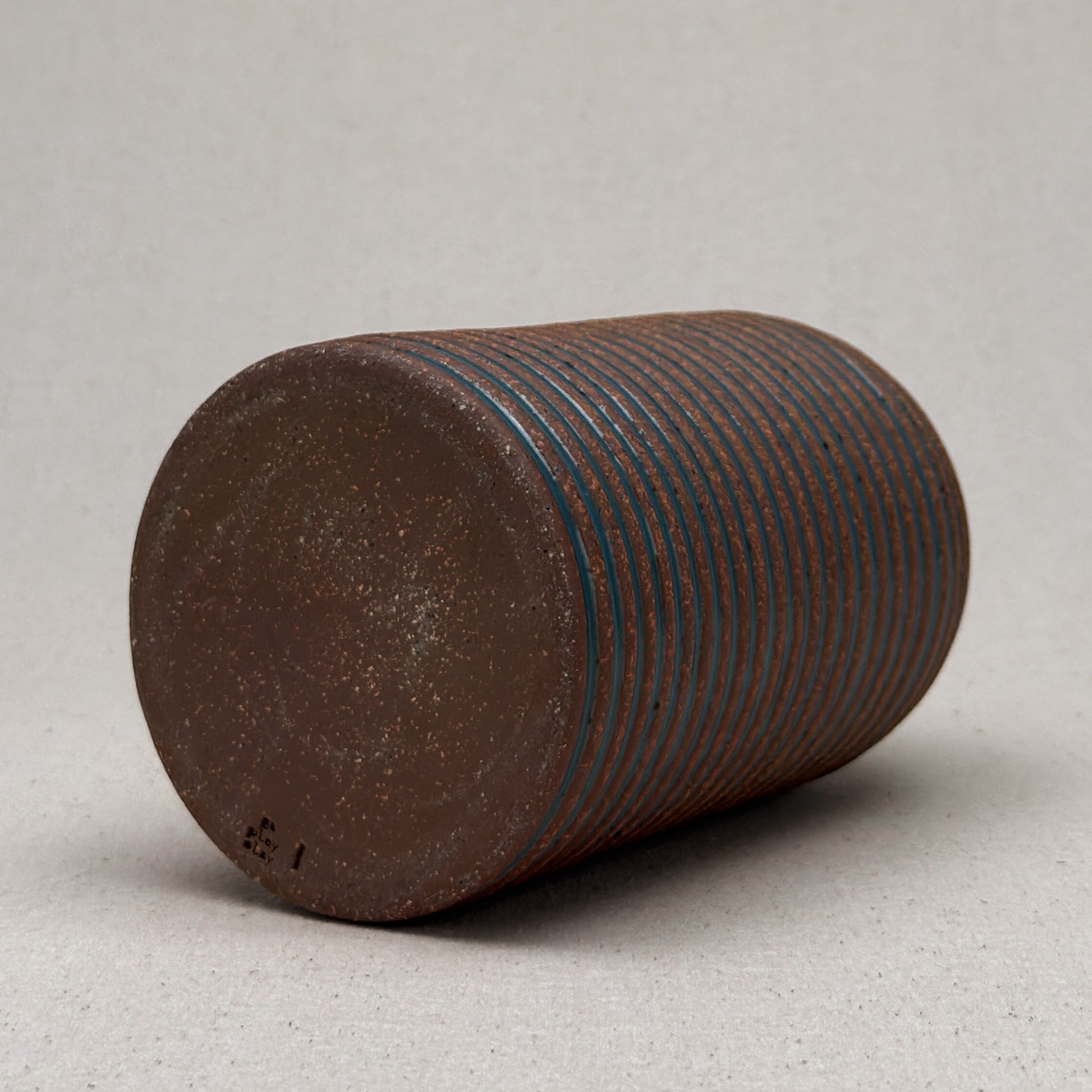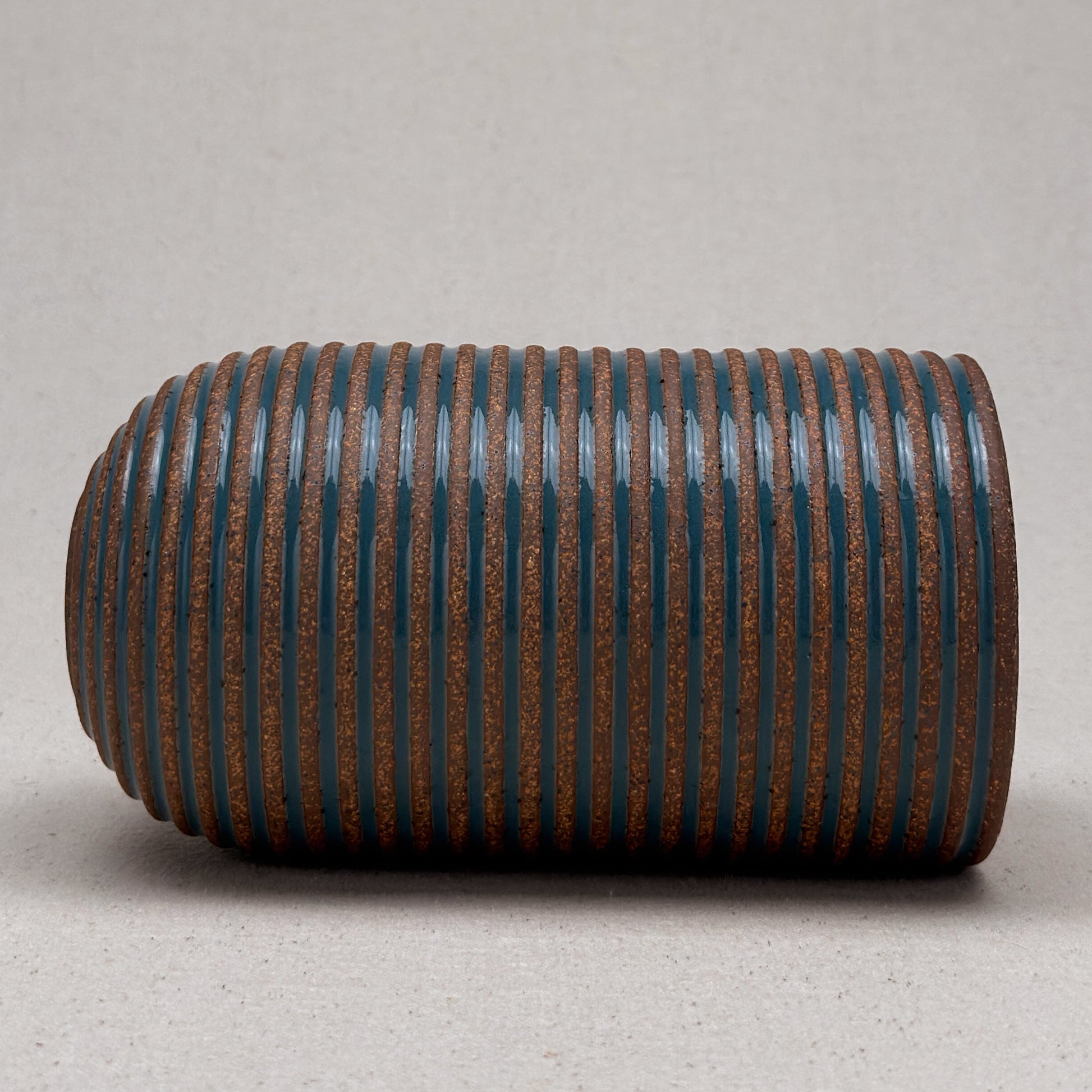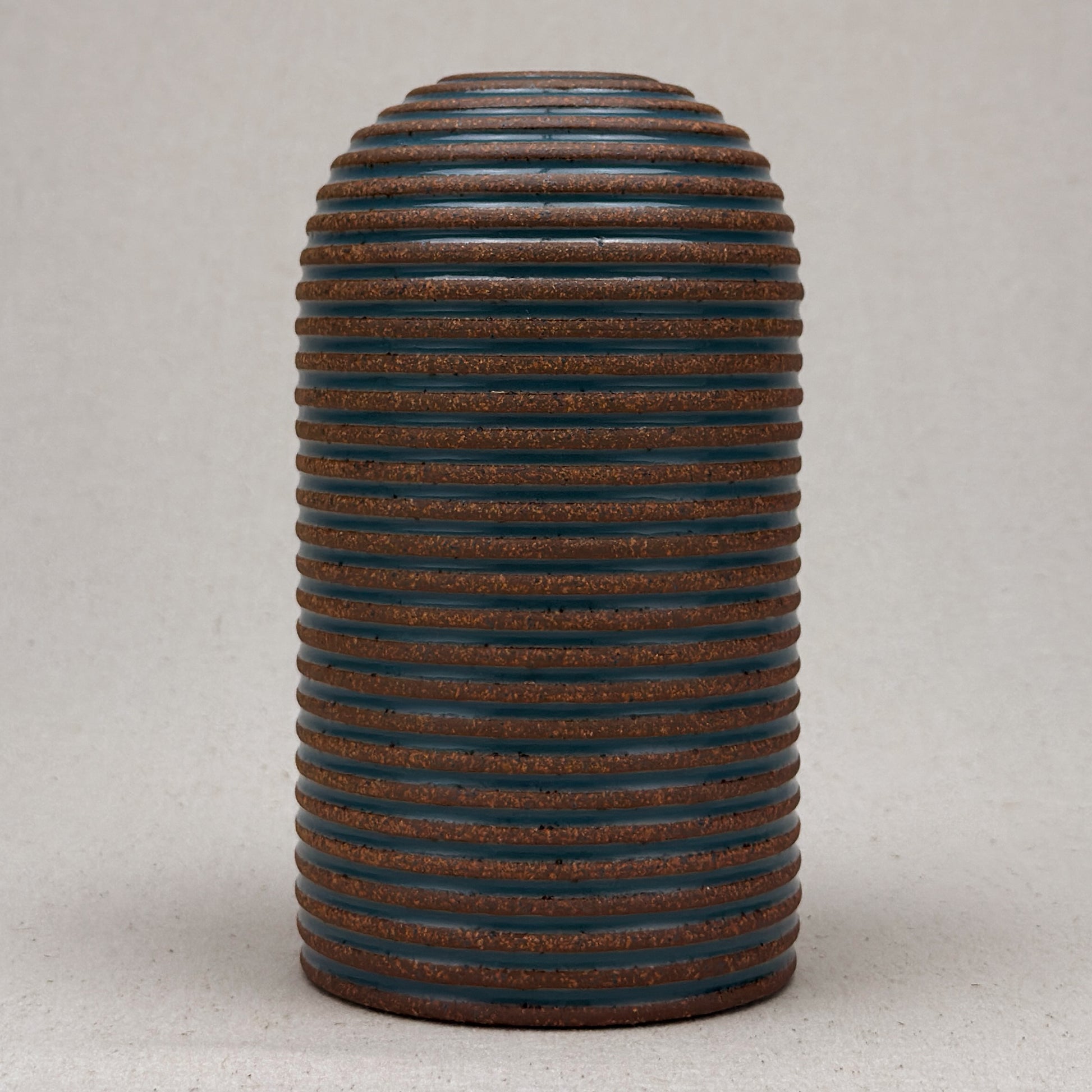 This striped blue ceramic bud vase was made on the potters wheel. When I threw it, I used a textured potter’s rib to form a deep groove into the wet clay. I used a transparent blue glaze letting it pool among the ridges. I left the peaks unglazed, so you can see iron-based clay.