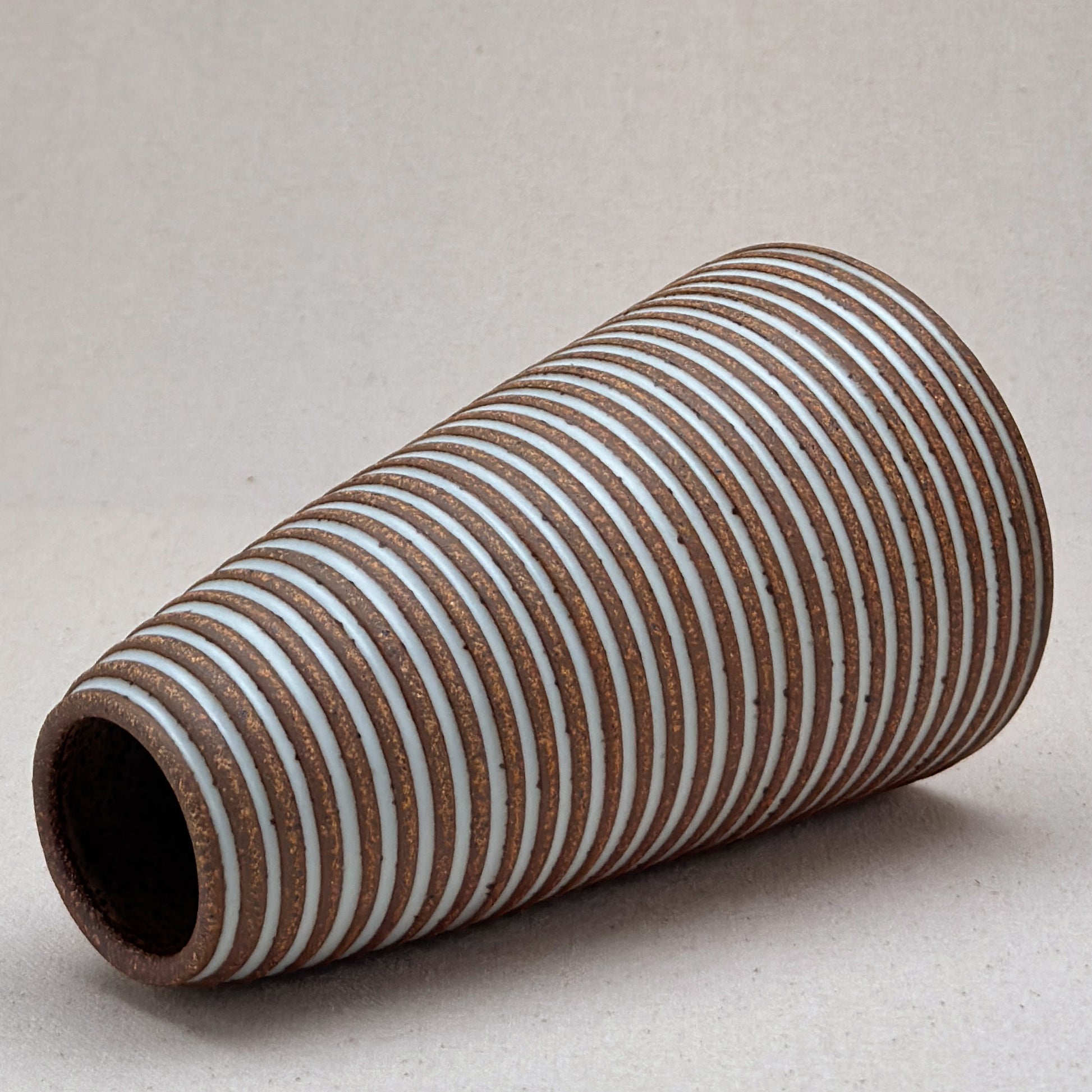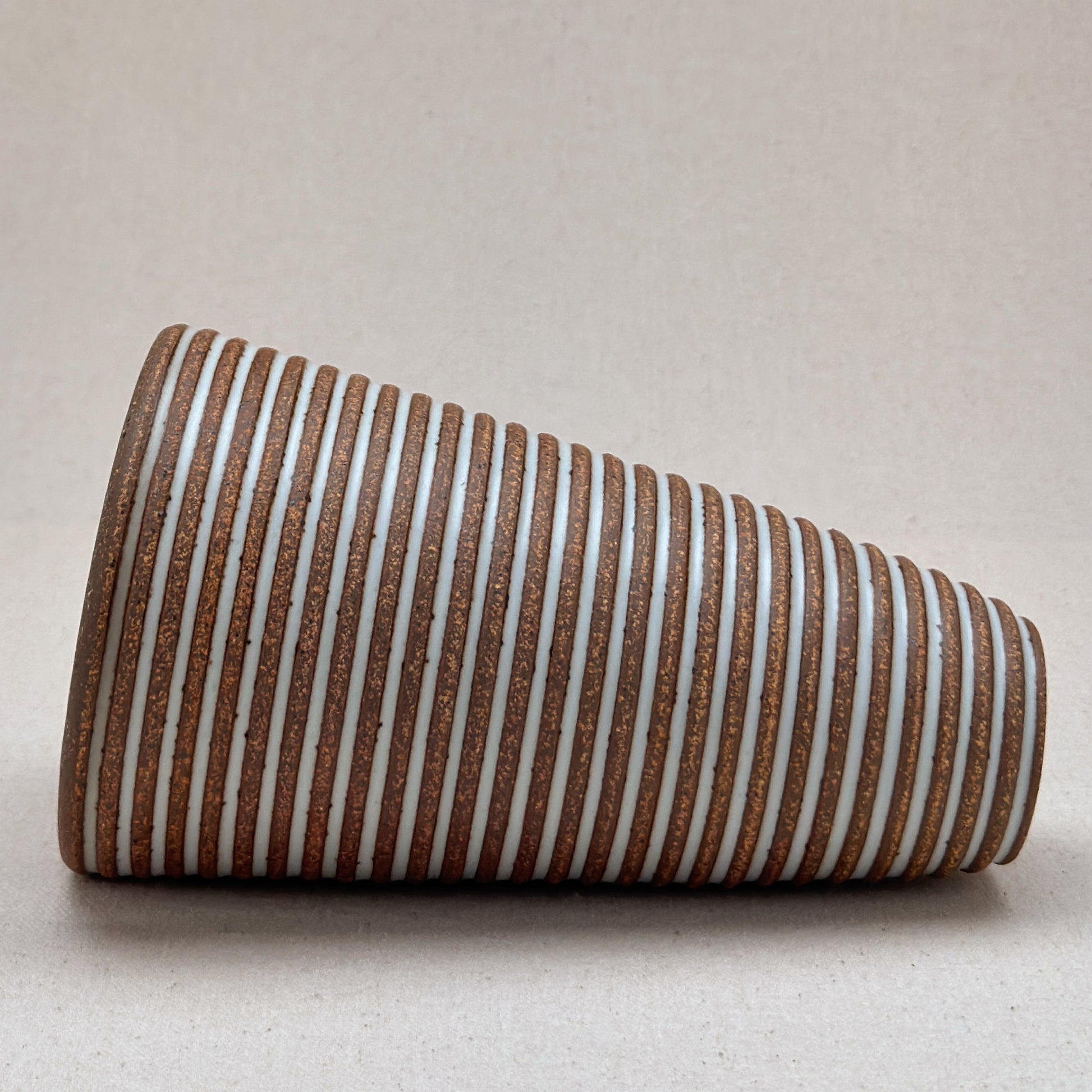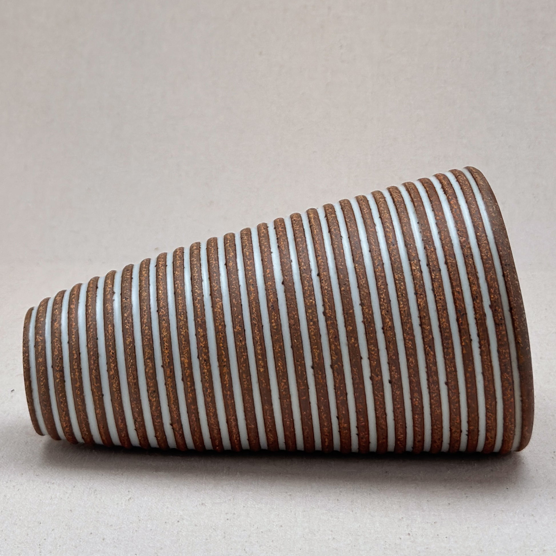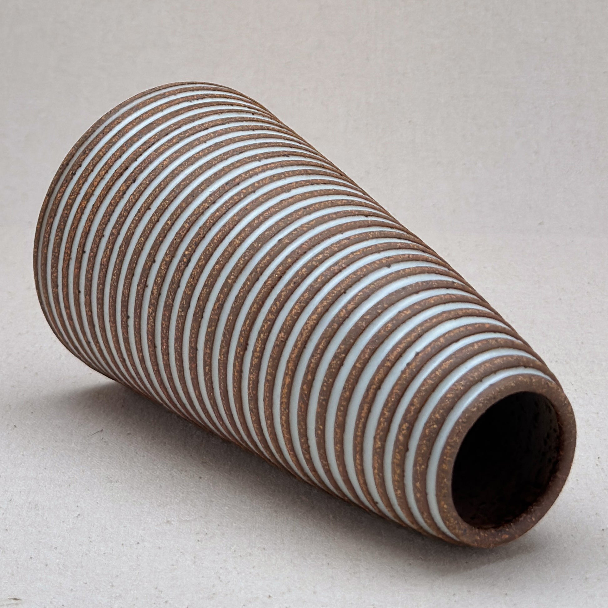 This white striped ceramic vase was made on the potters wheel. When I threw it, I used a textured potter’s rib to form a deep groove into the wet clay. I used an opaque white glaze letting it pool among the ridges. I left the peaks unglazed, so you can see iron-based clay.