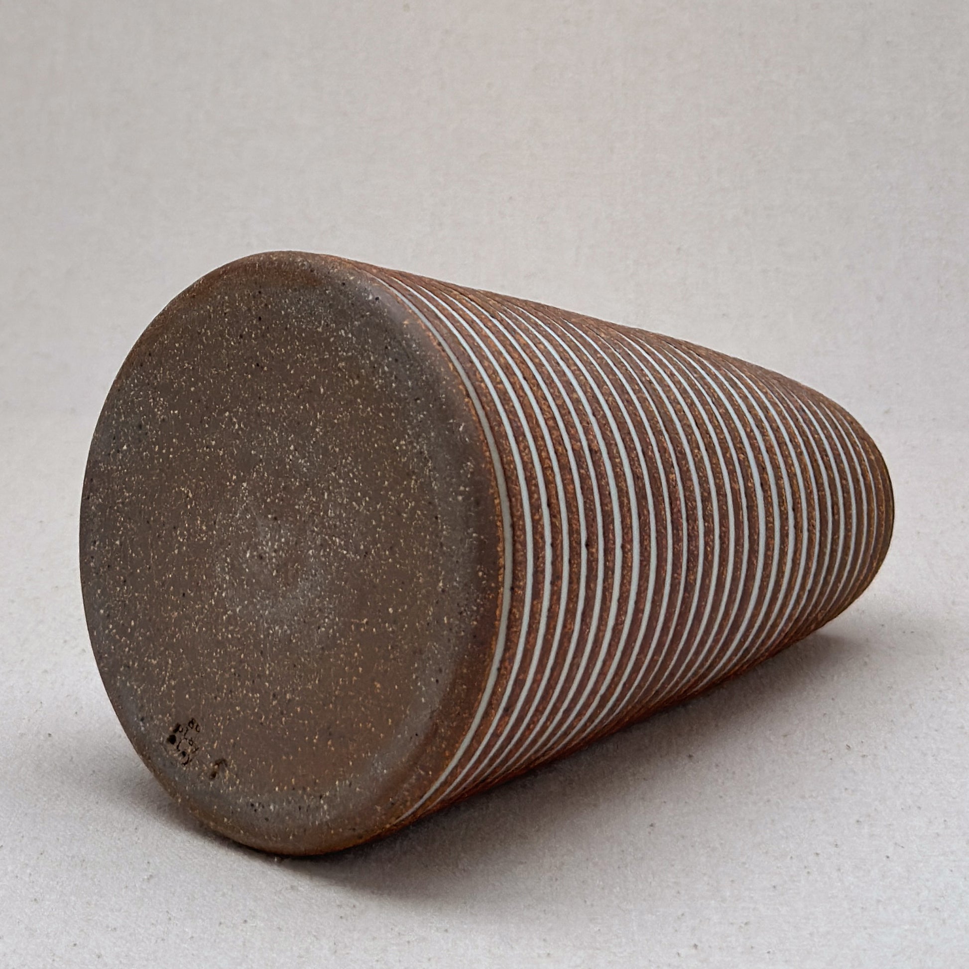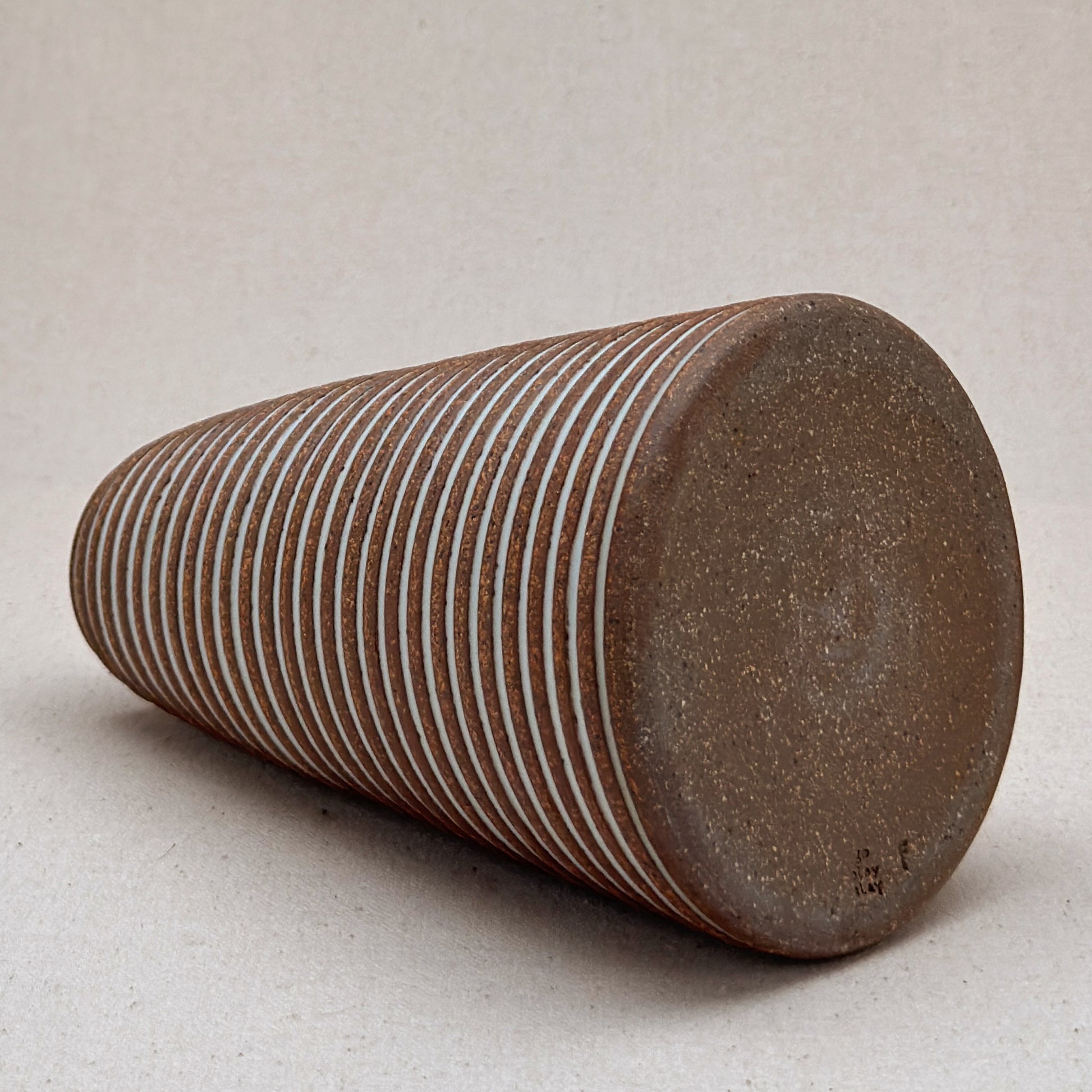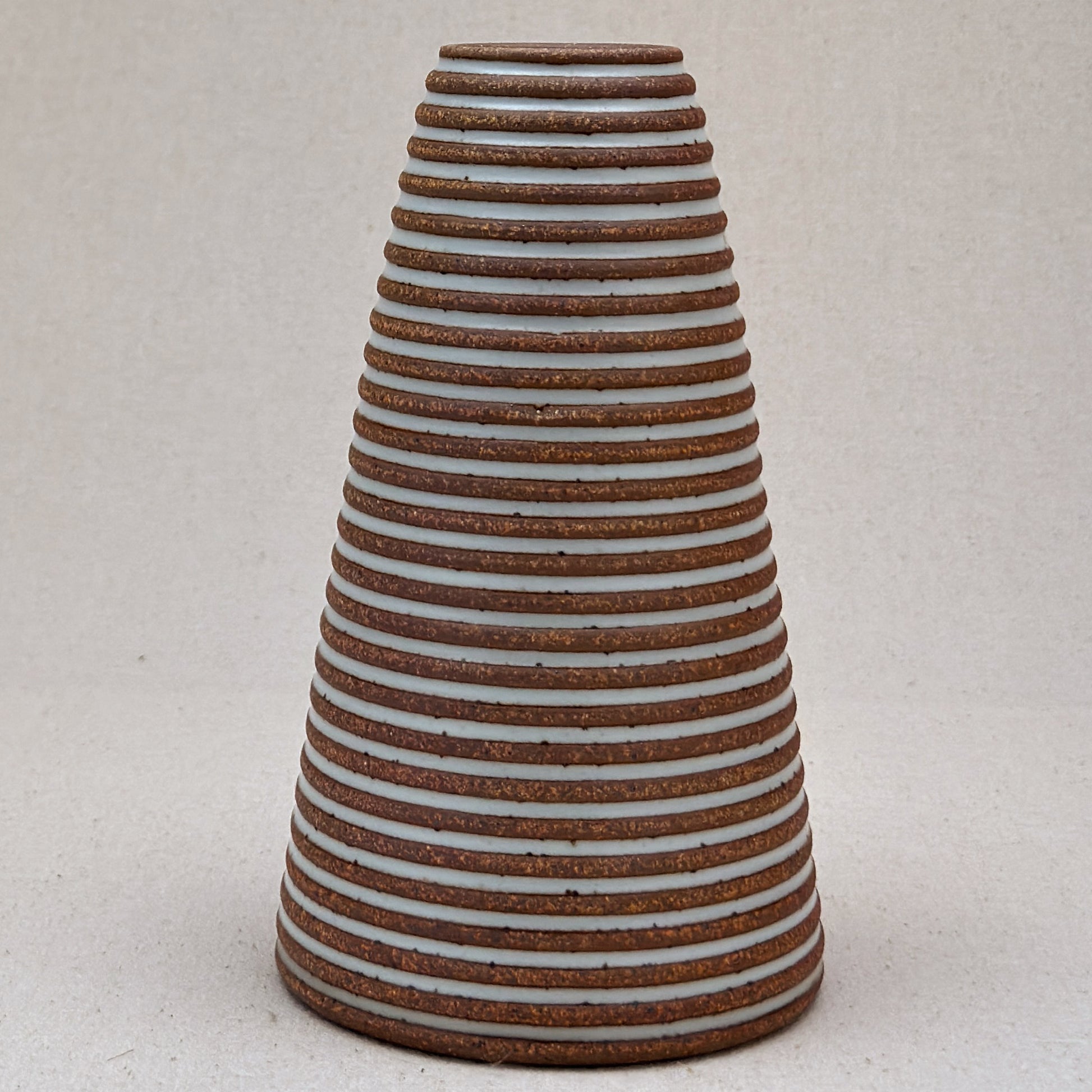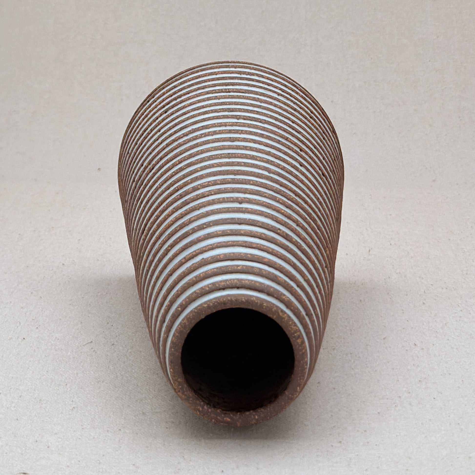 This white striped ceramic vase was made on the potters wheel. When I threw it, I used a textured potter’s rib to form a deep groove into the wet clay. I used an opaque white glaze letting it pool among the ridges. I left the peaks unglazed, so you can see iron-based clay.
