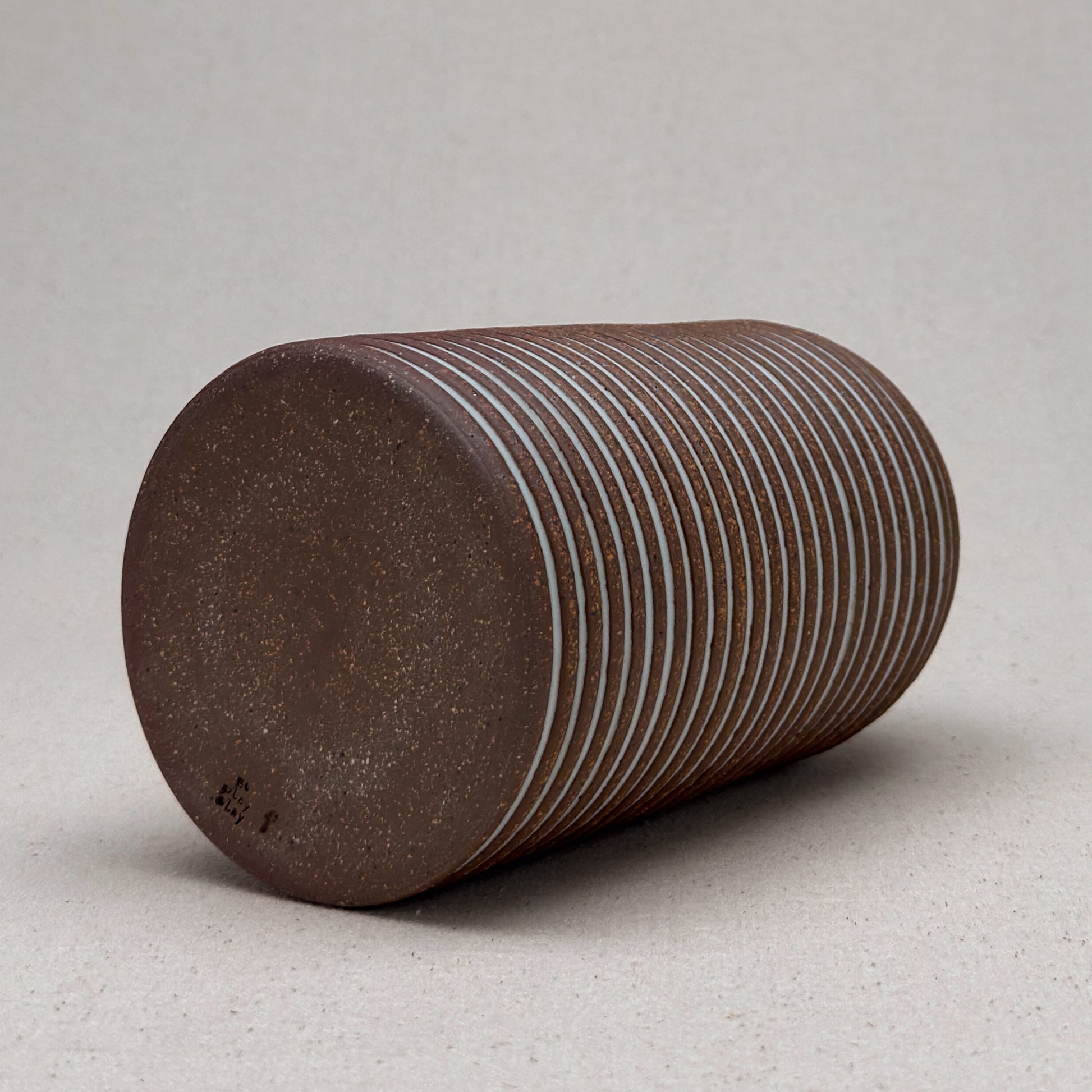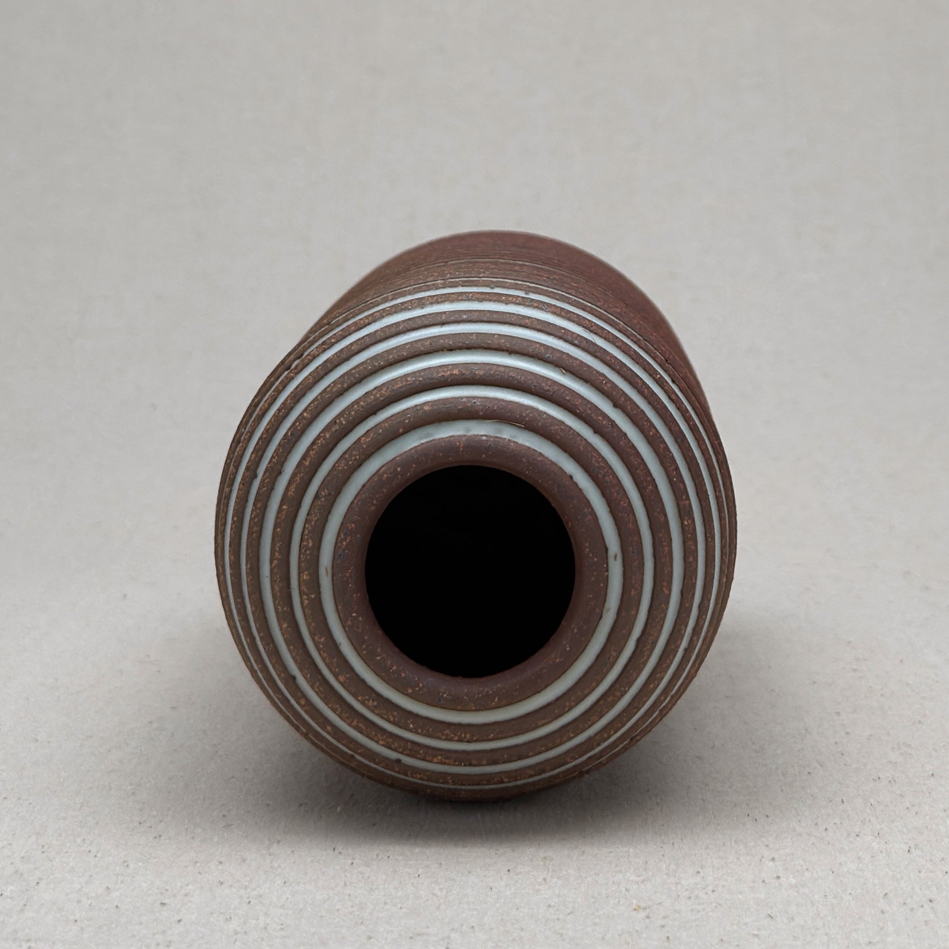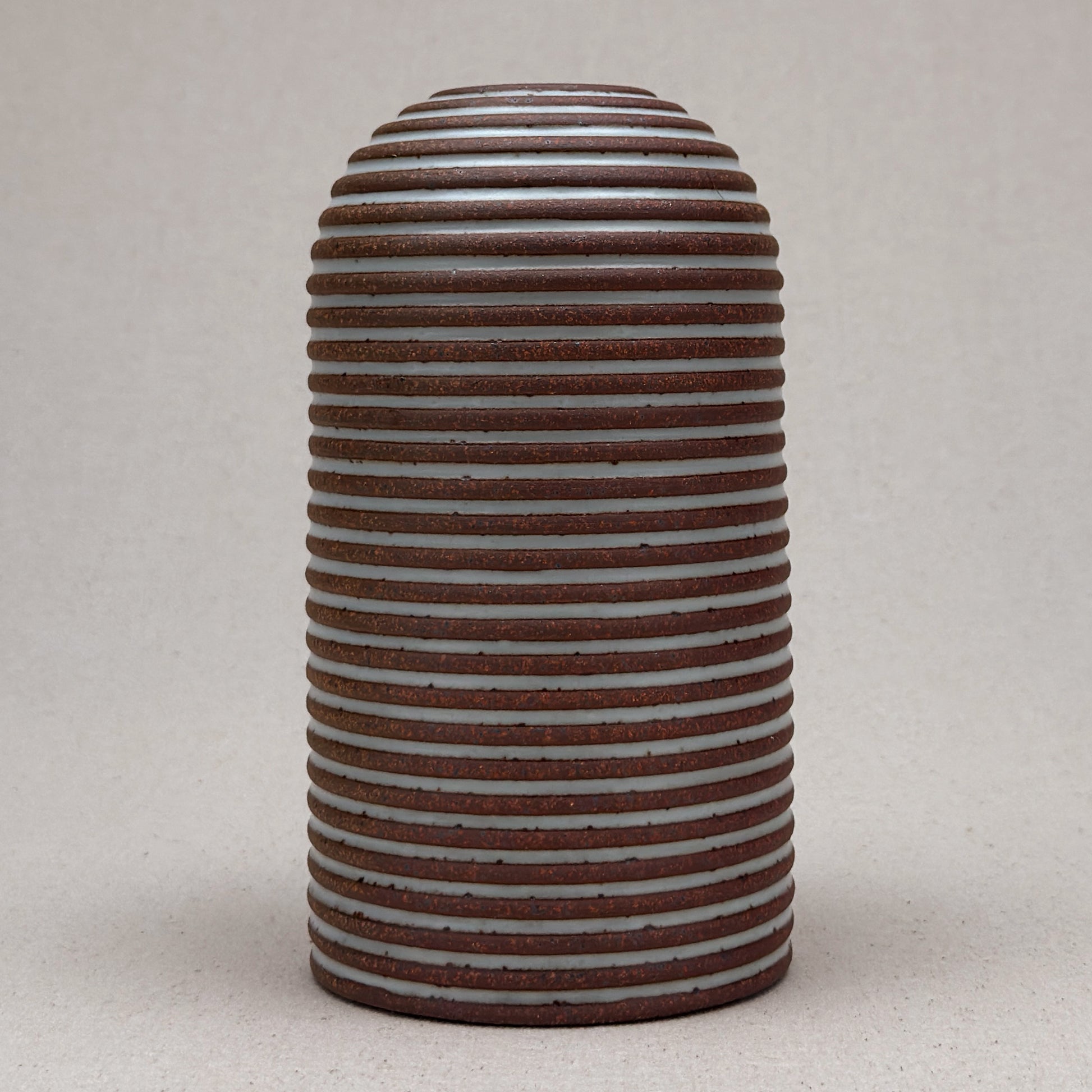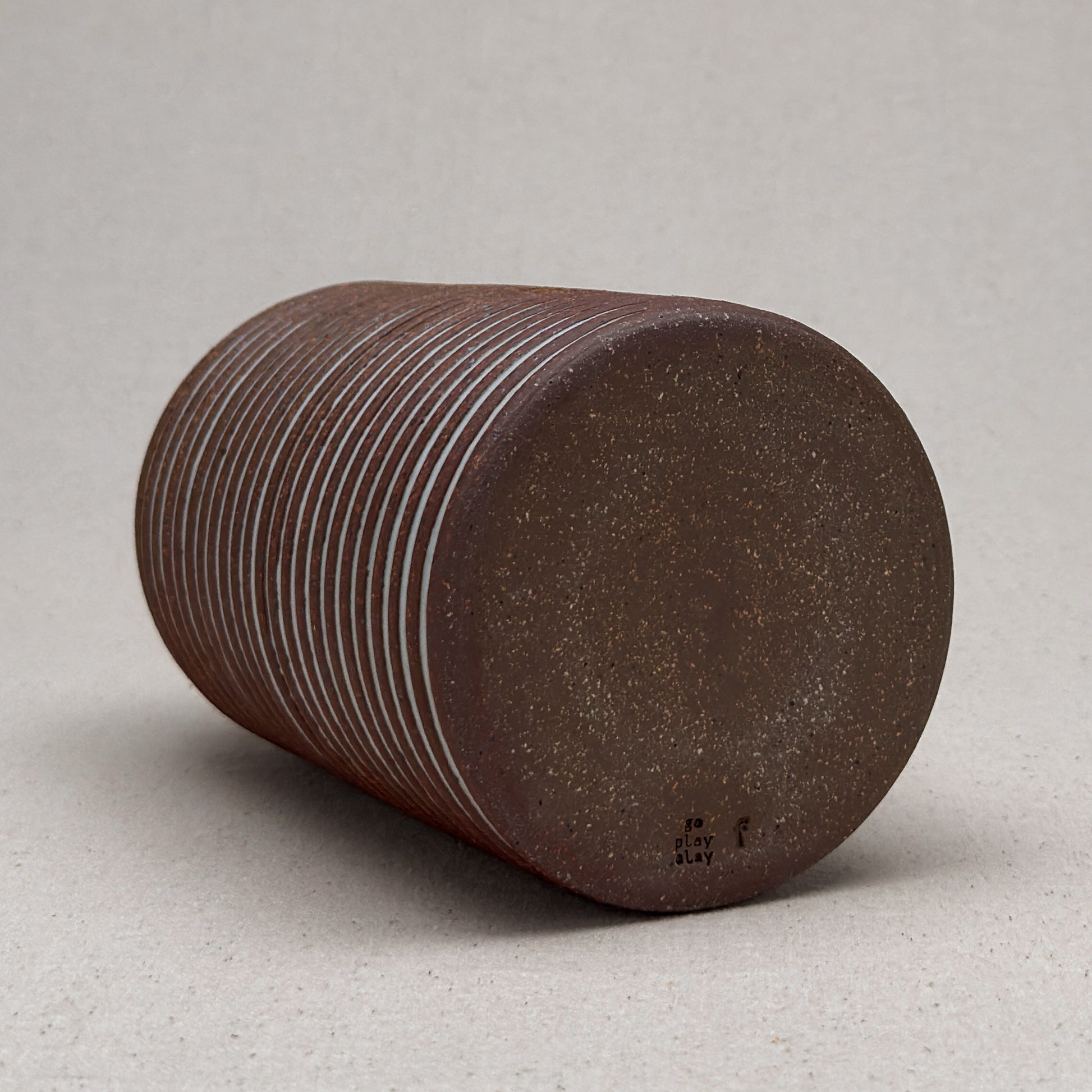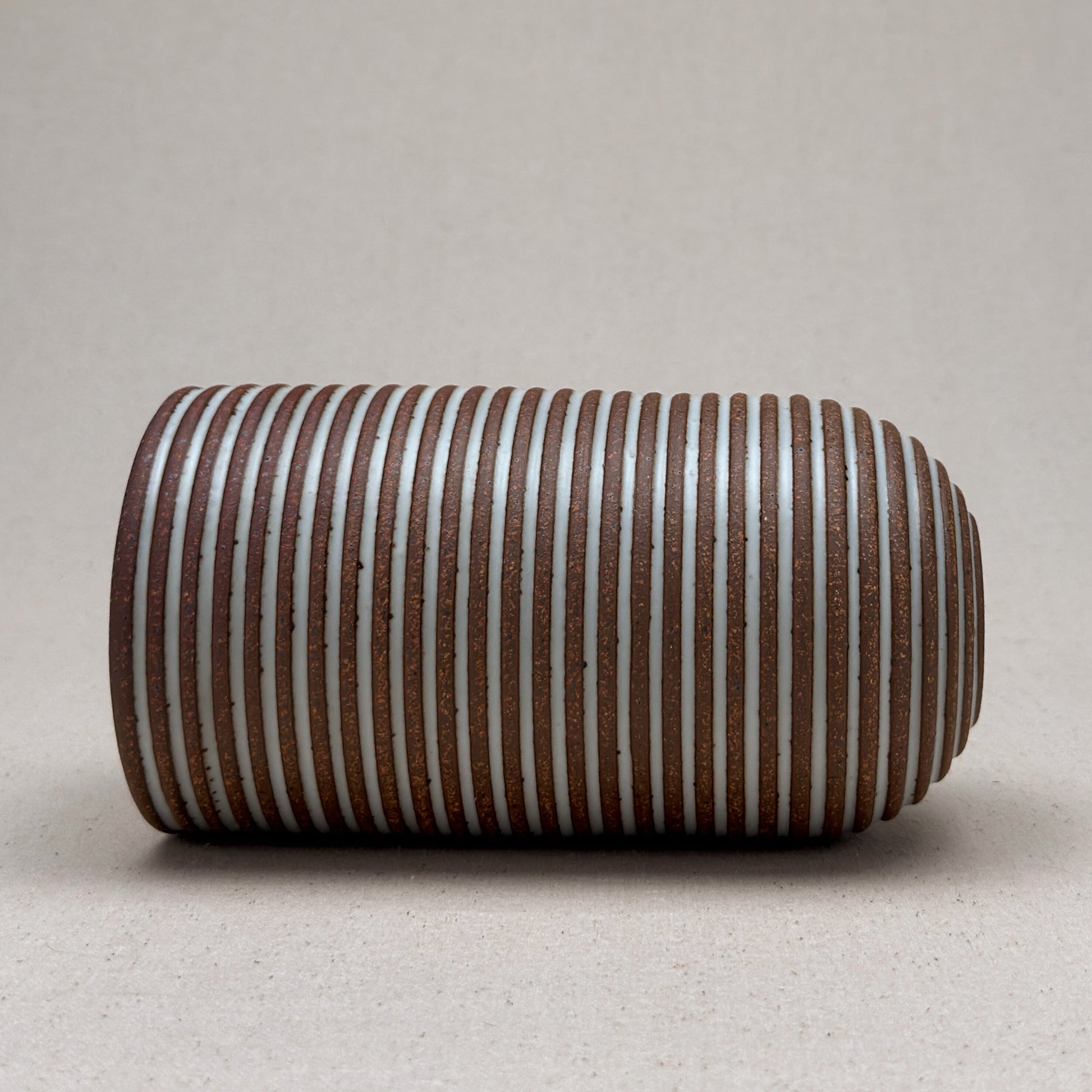 This white striped vase was made on the potters wheel. When I threw it, I used a textured potter’s rib to form a deep groove into the wet clay. I used an opaque white glaze letting it pool among the ridges. I left the peaks unglazed, so you can see iron-based clay.