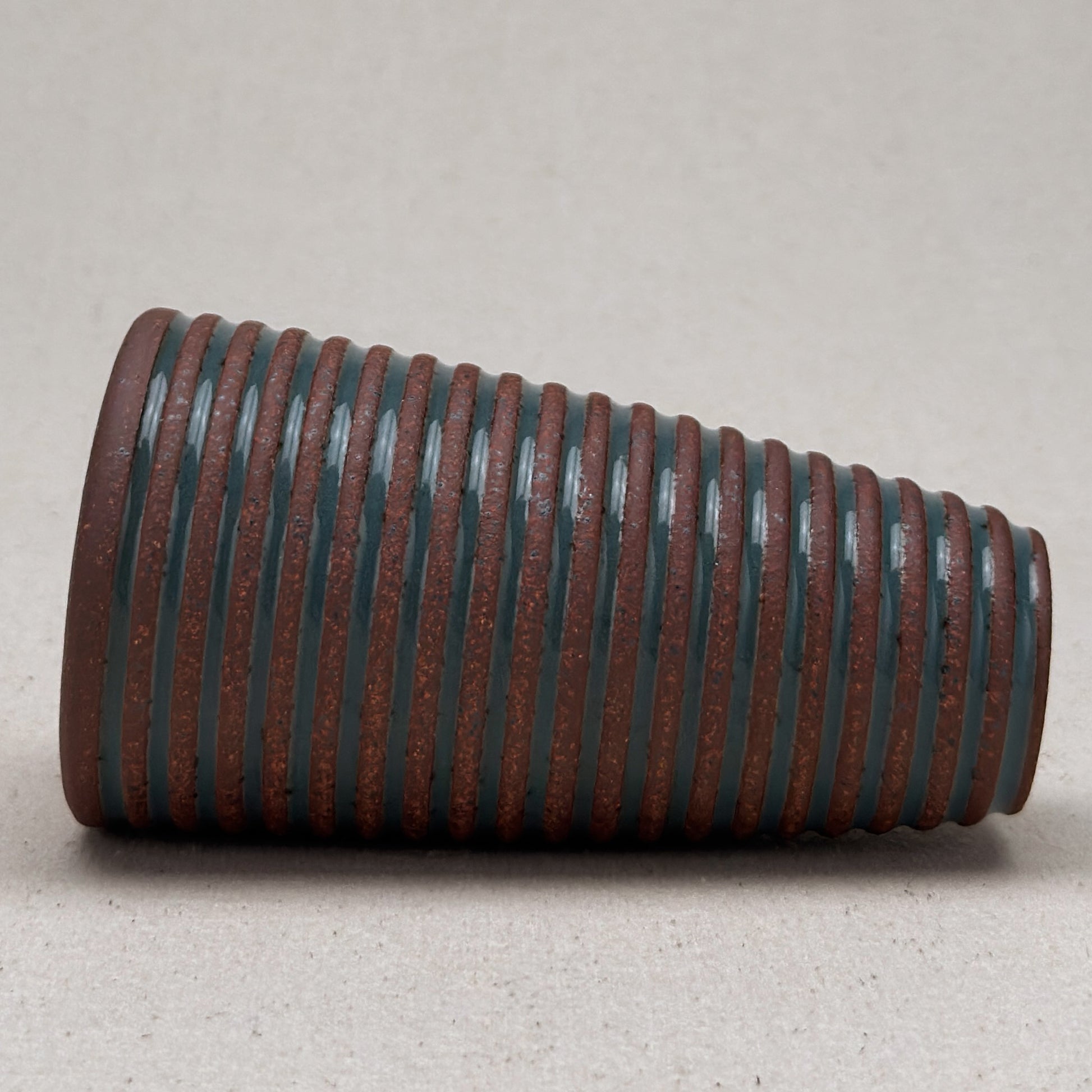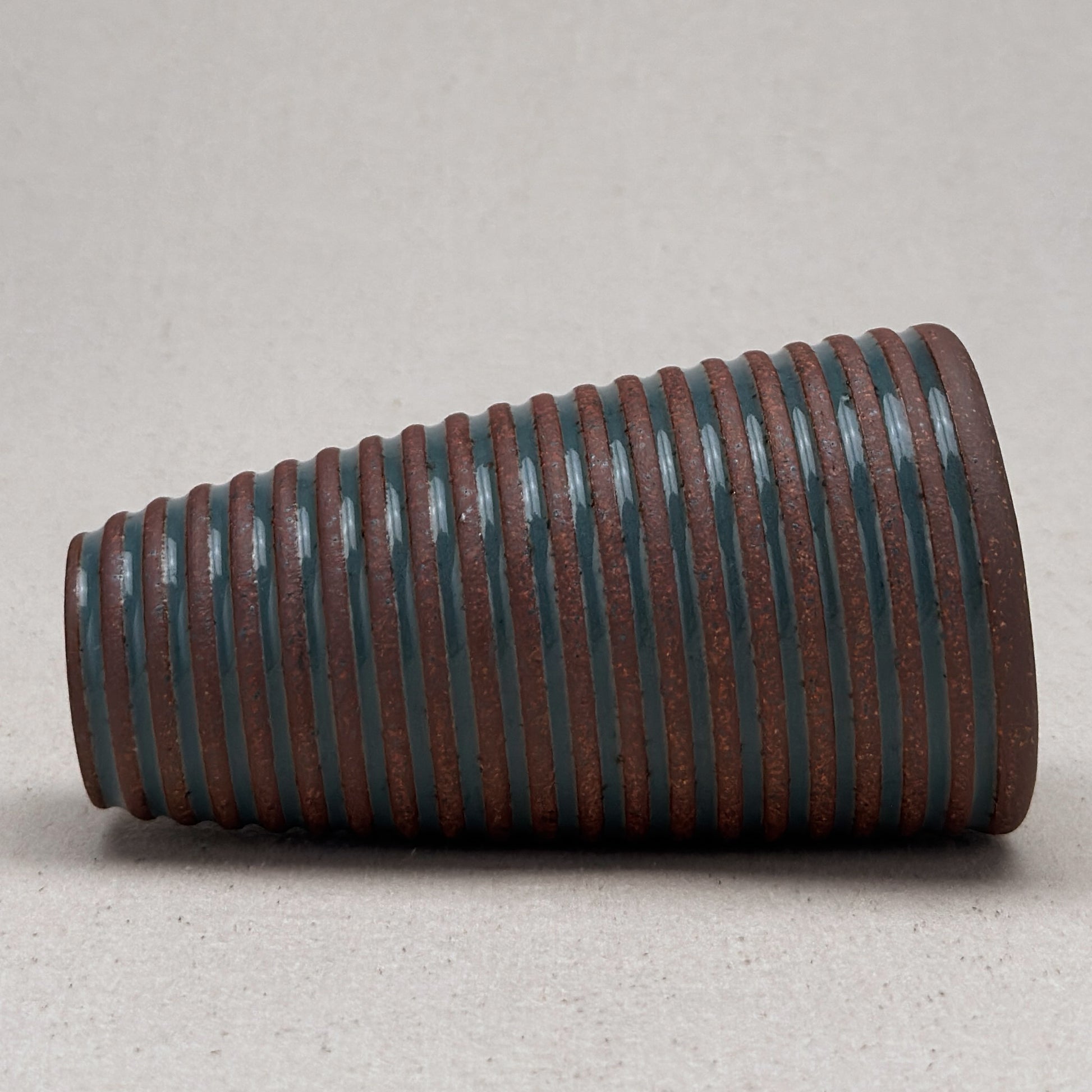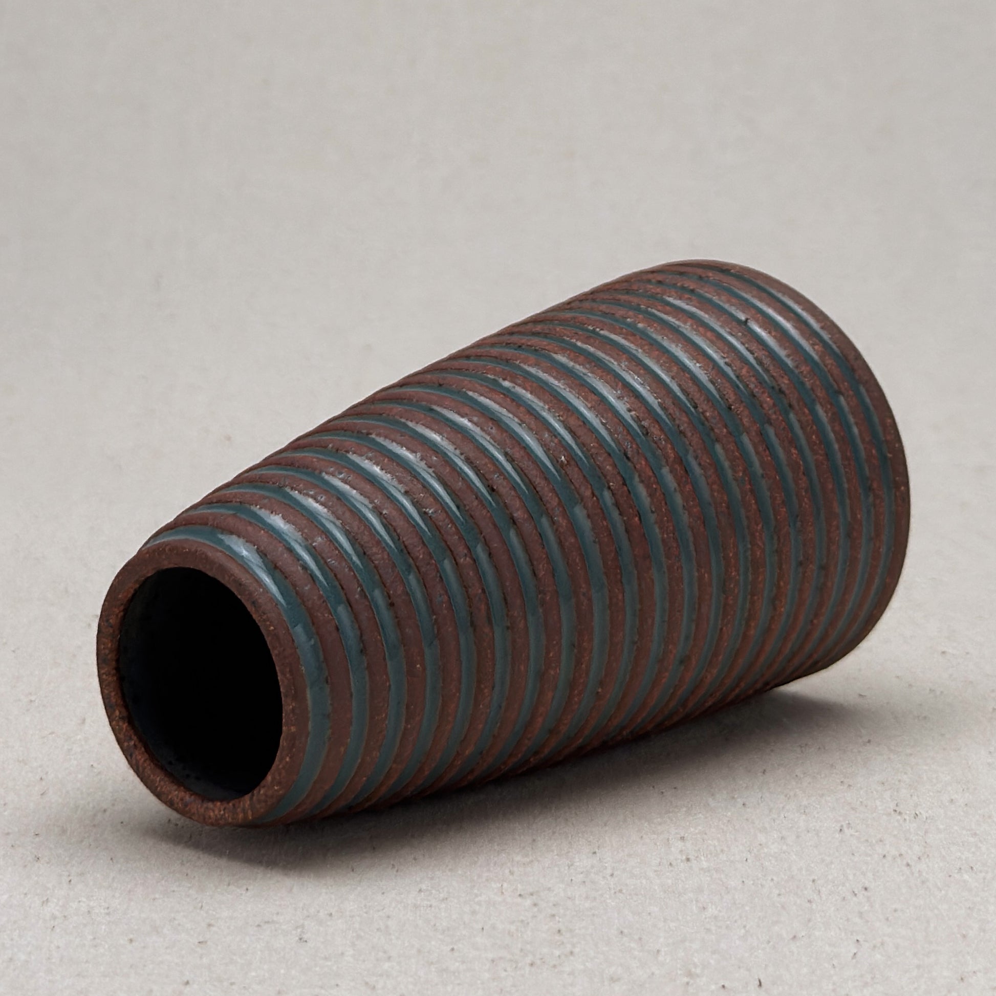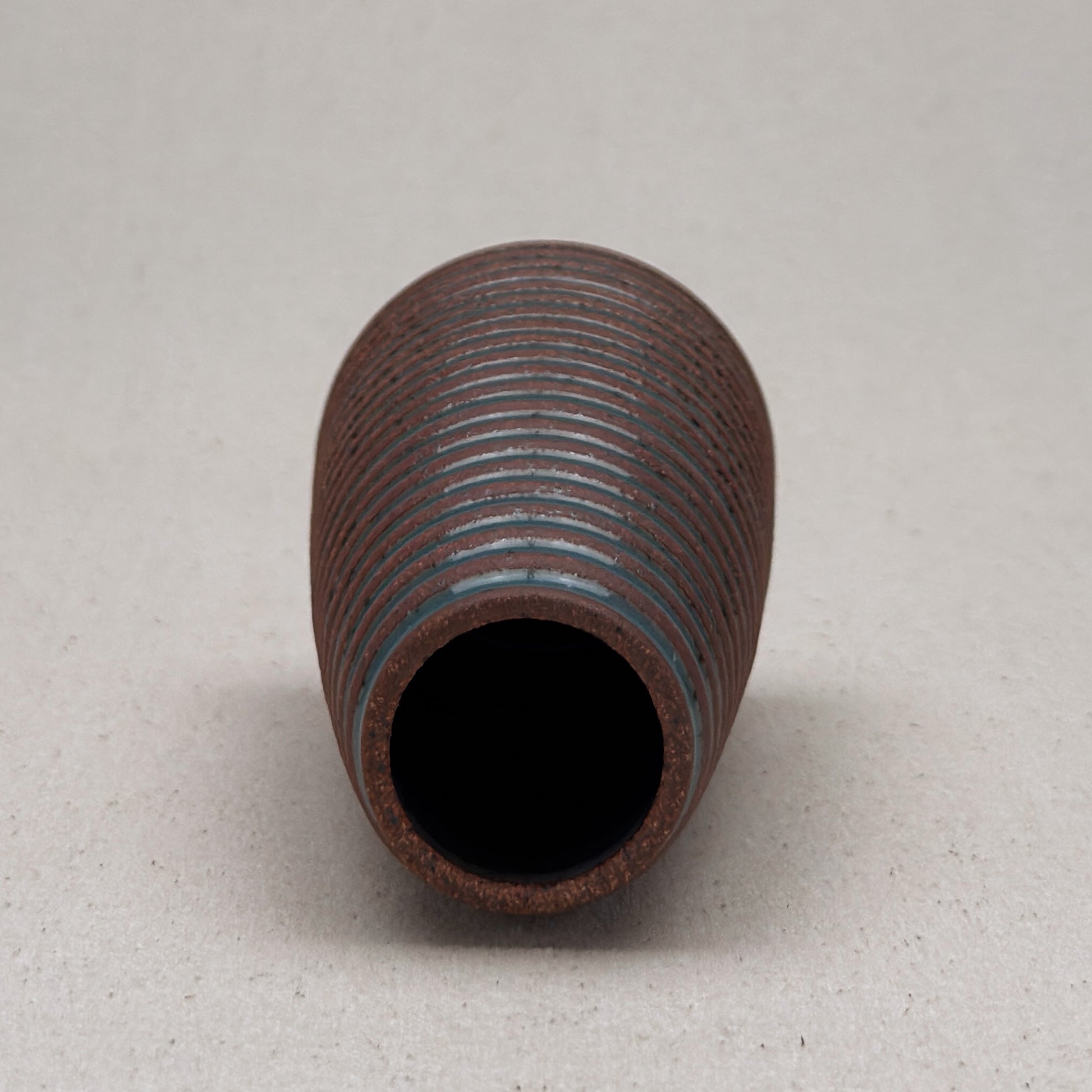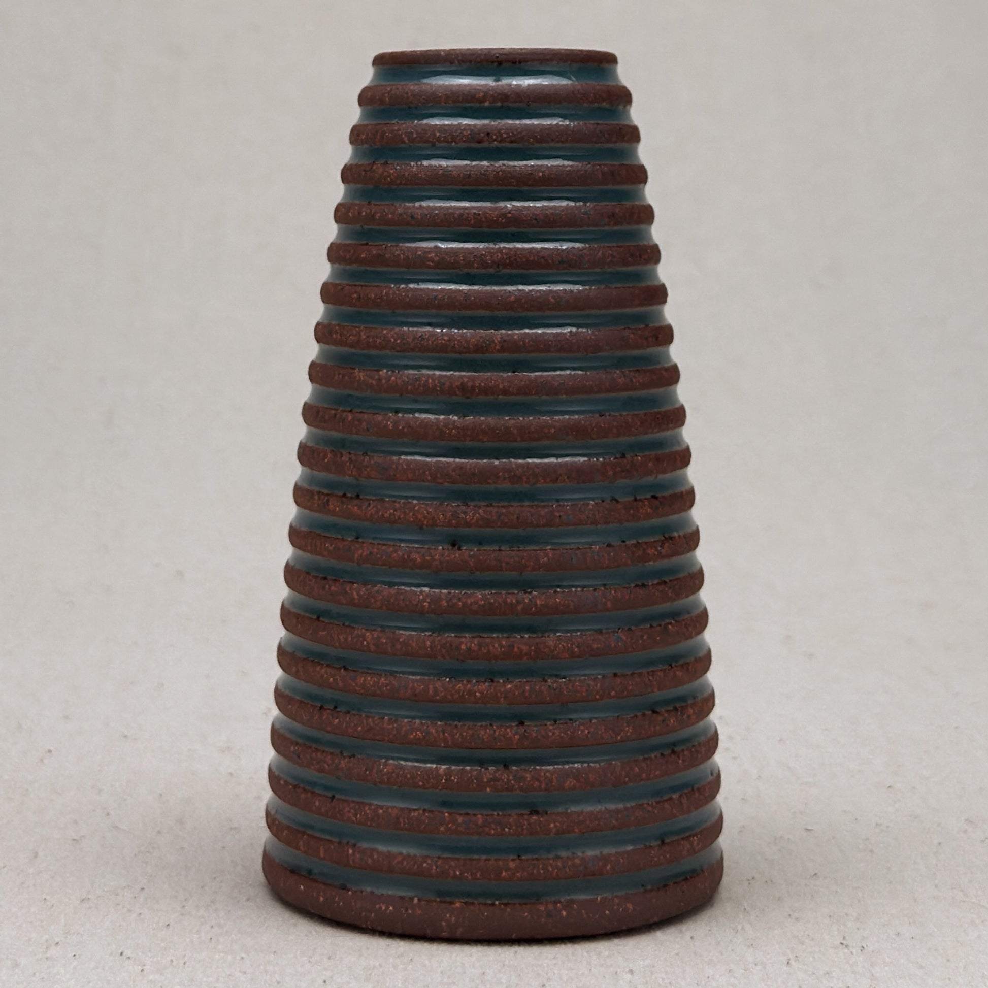 This striped blue ceramic bud vase was made on the potters wheel. When I threw it, I used a textured potter’s rib to form a deep groove into the wet clay. I used a transparent blue glaze letting it pool among the ridges. I left the peaks unglazed, so you can see iron-based clay.