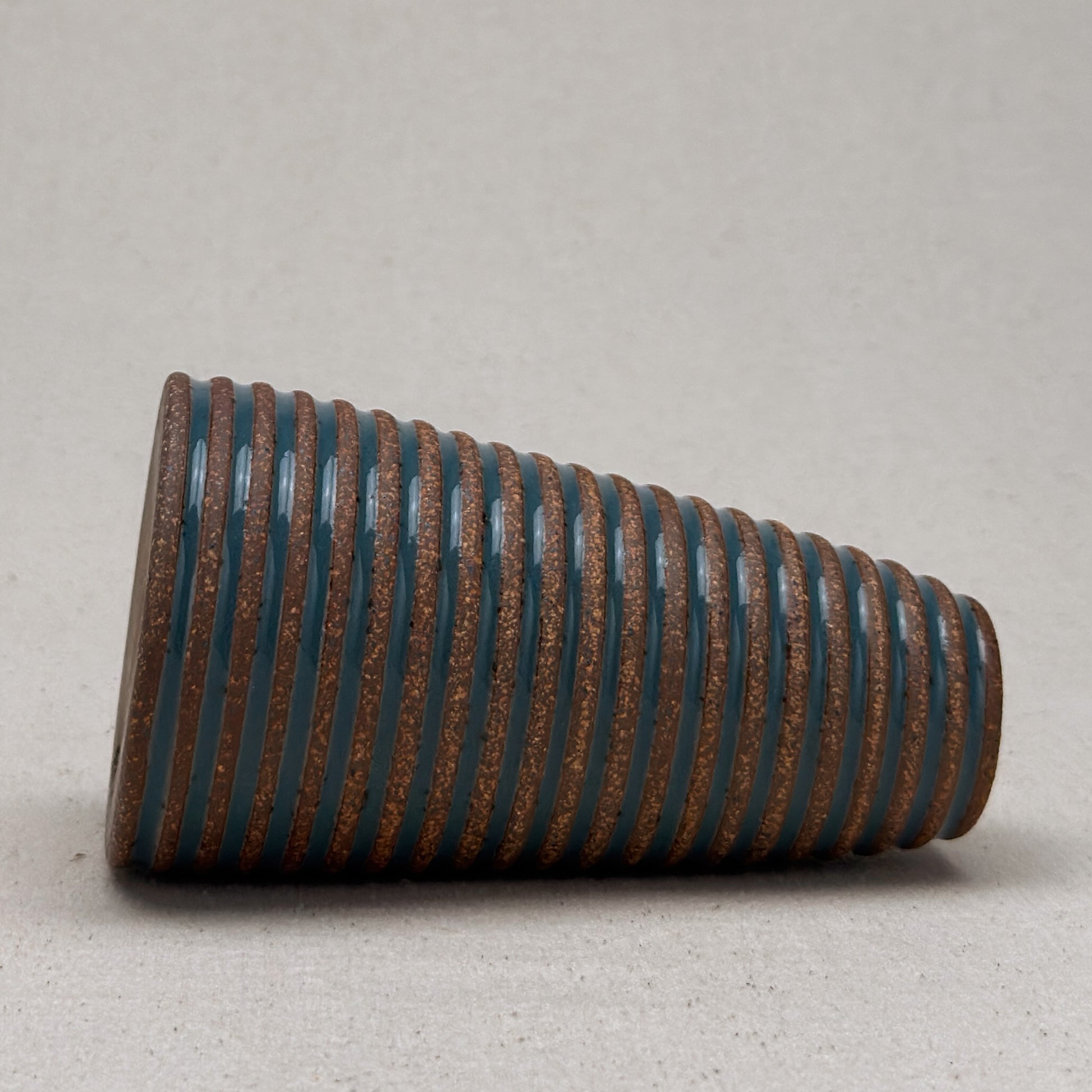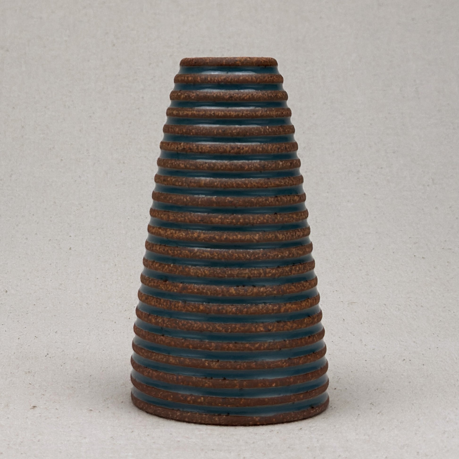 This striped blue ceramic bud vase was made on the potters wheel. When I threw it, I used a textured potter’s rib to form a deep groove into the wet clay. I used a transparent blue glaze letting it pool among the ridges. I left the peaks unglazed, so you can see iron-based clay.