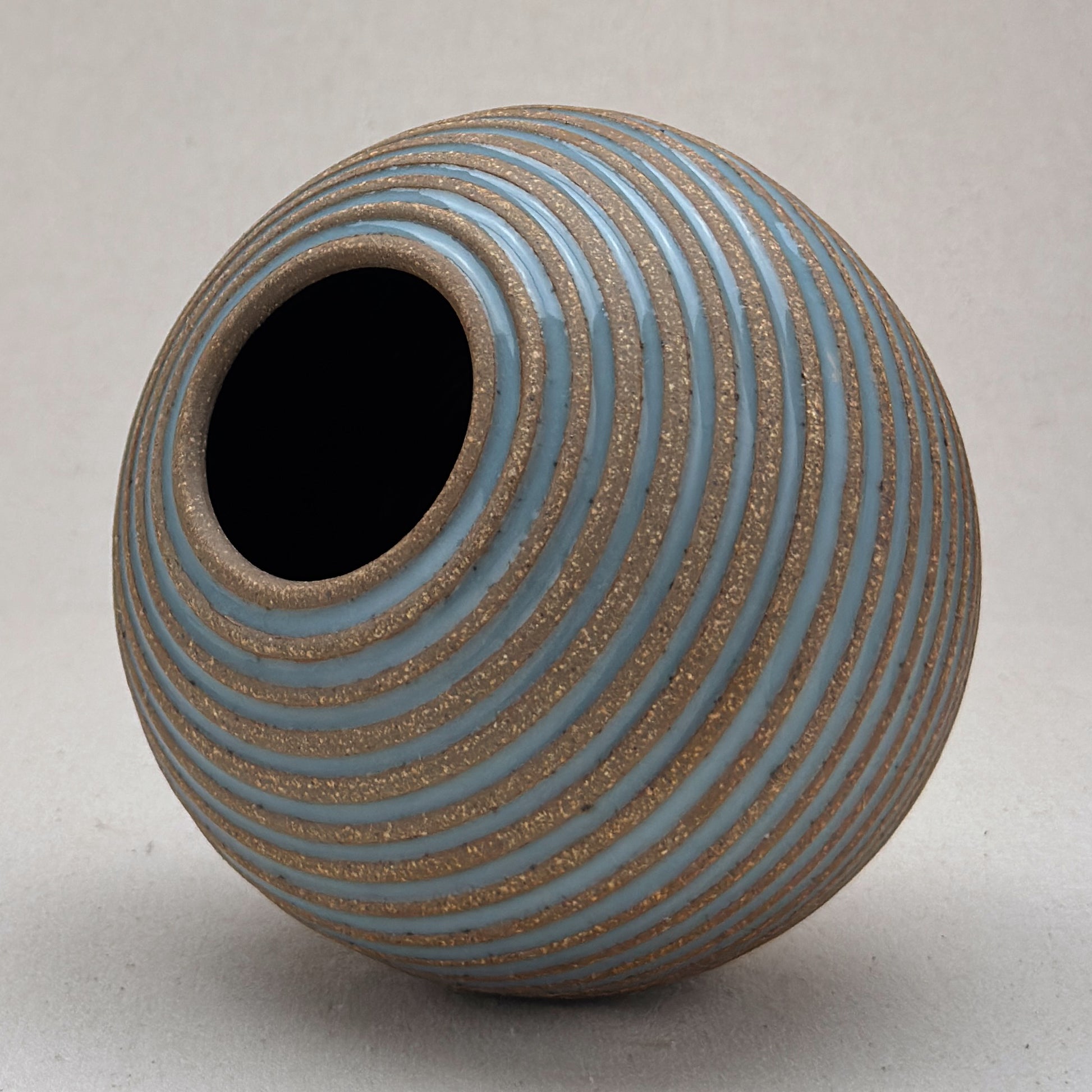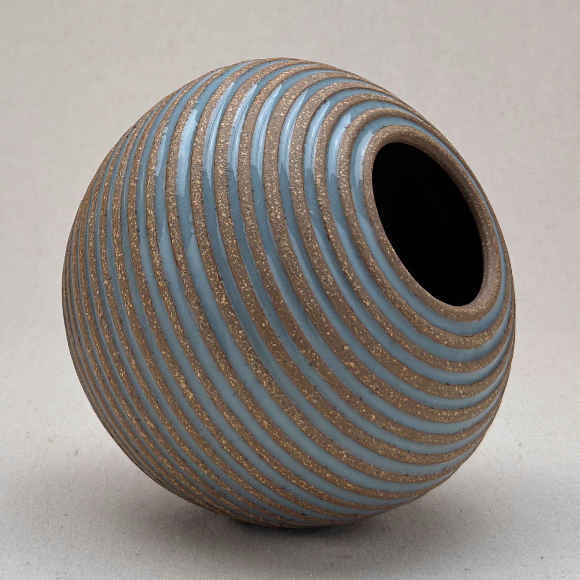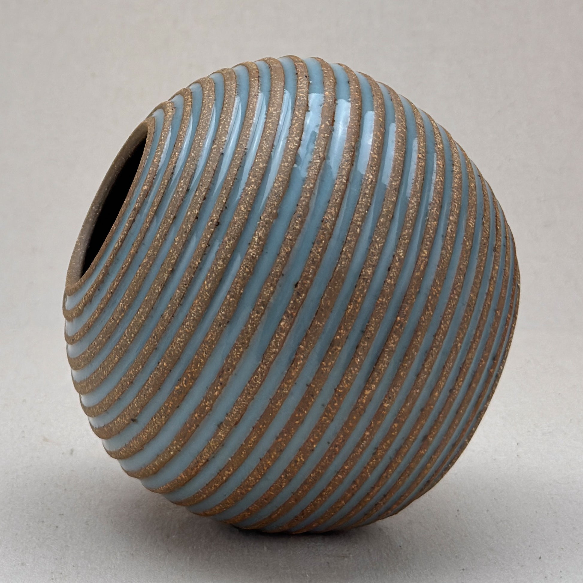 This striped blue ceramic bud vase was made on the potters wheel. When I threw it, I used a textured potter’s rib to form a deep groove into the wet clay. I used a transparent blue glaze letting it pool among the ridges. I left the peaks unglazed, so you can see iron-based clay.