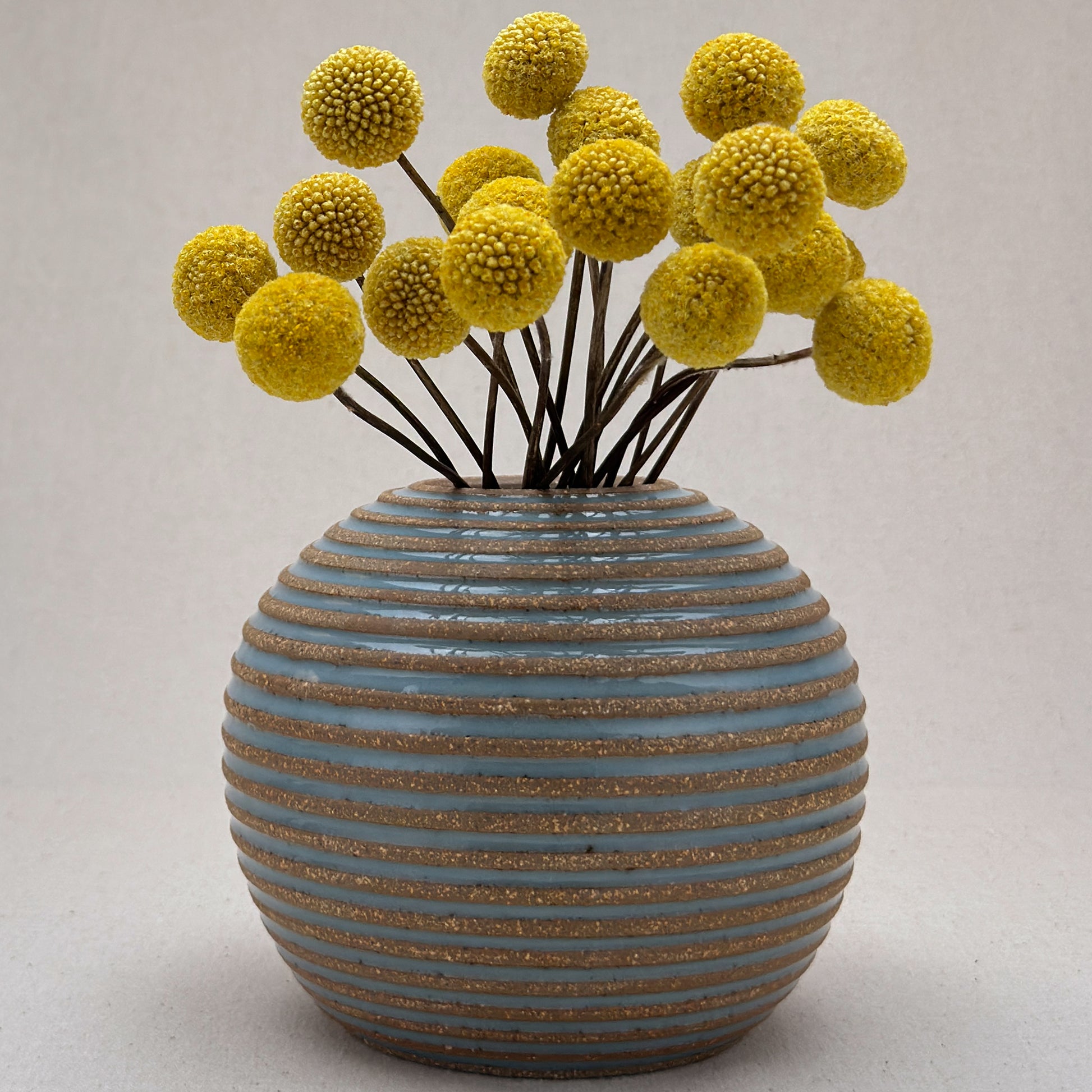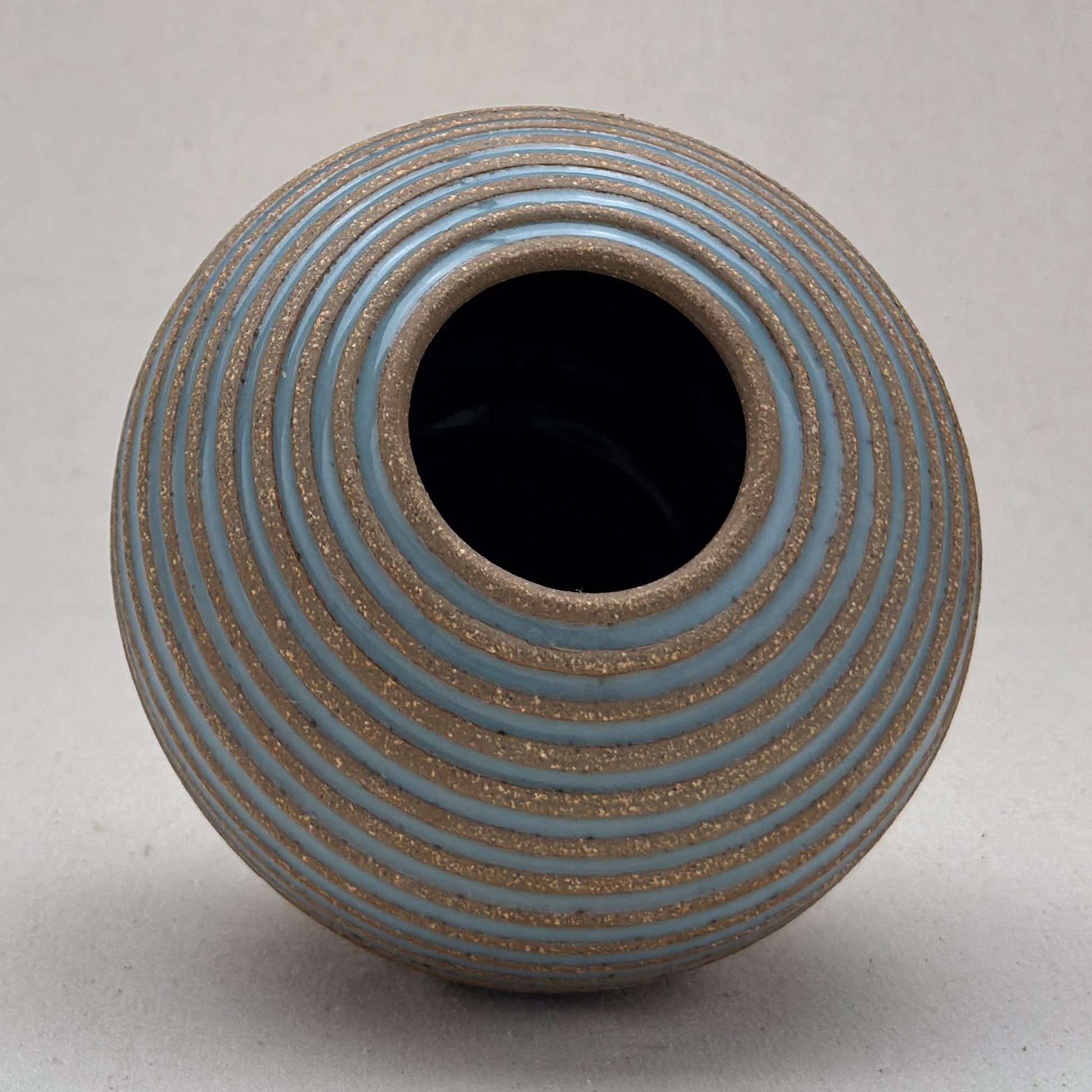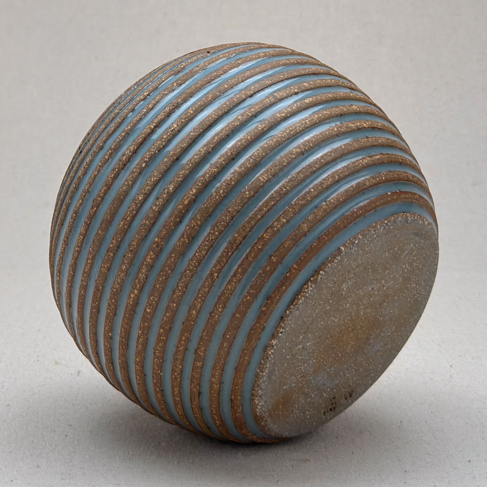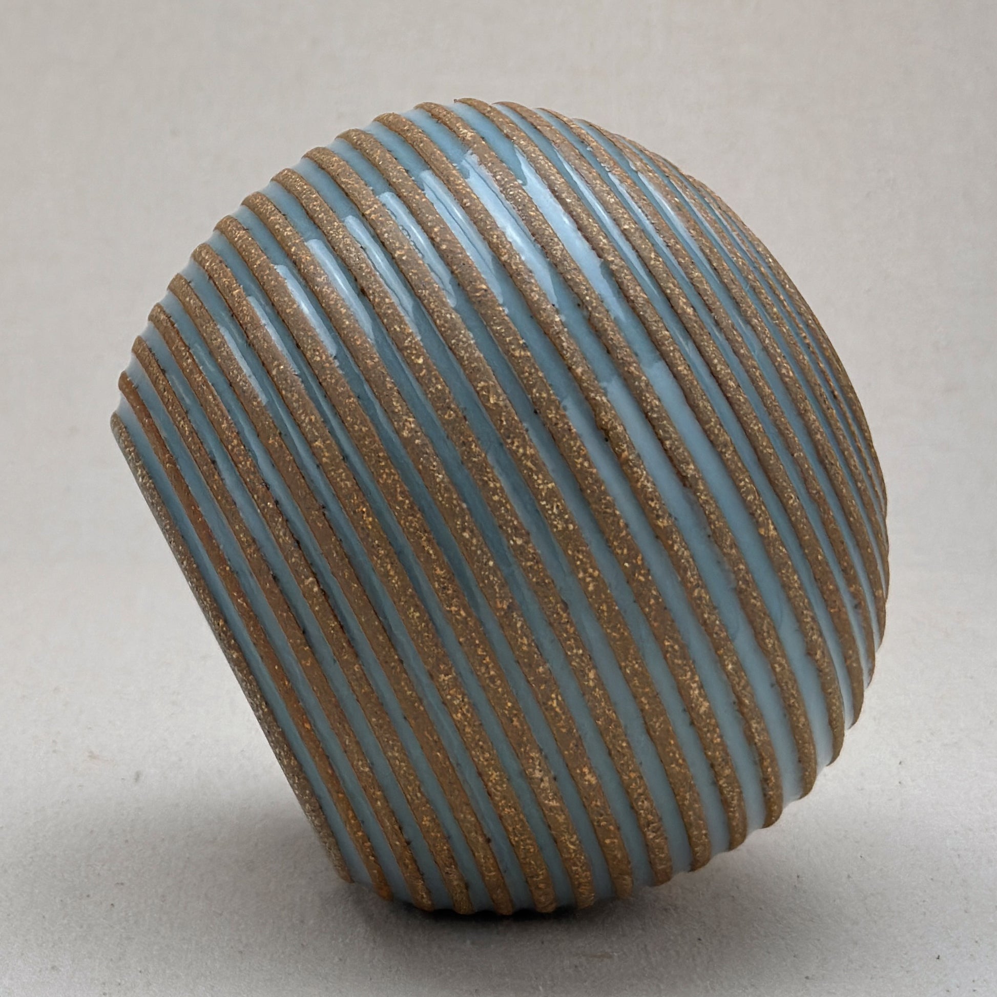 This striped blue ceramic bud vase was made on the potters wheel. When I threw it, I used a textured potter’s rib to form a deep groove into the wet clay. I used a transparent blue glaze letting it pool among the ridges. I left the peaks unglazed, so you can see iron-based clay.