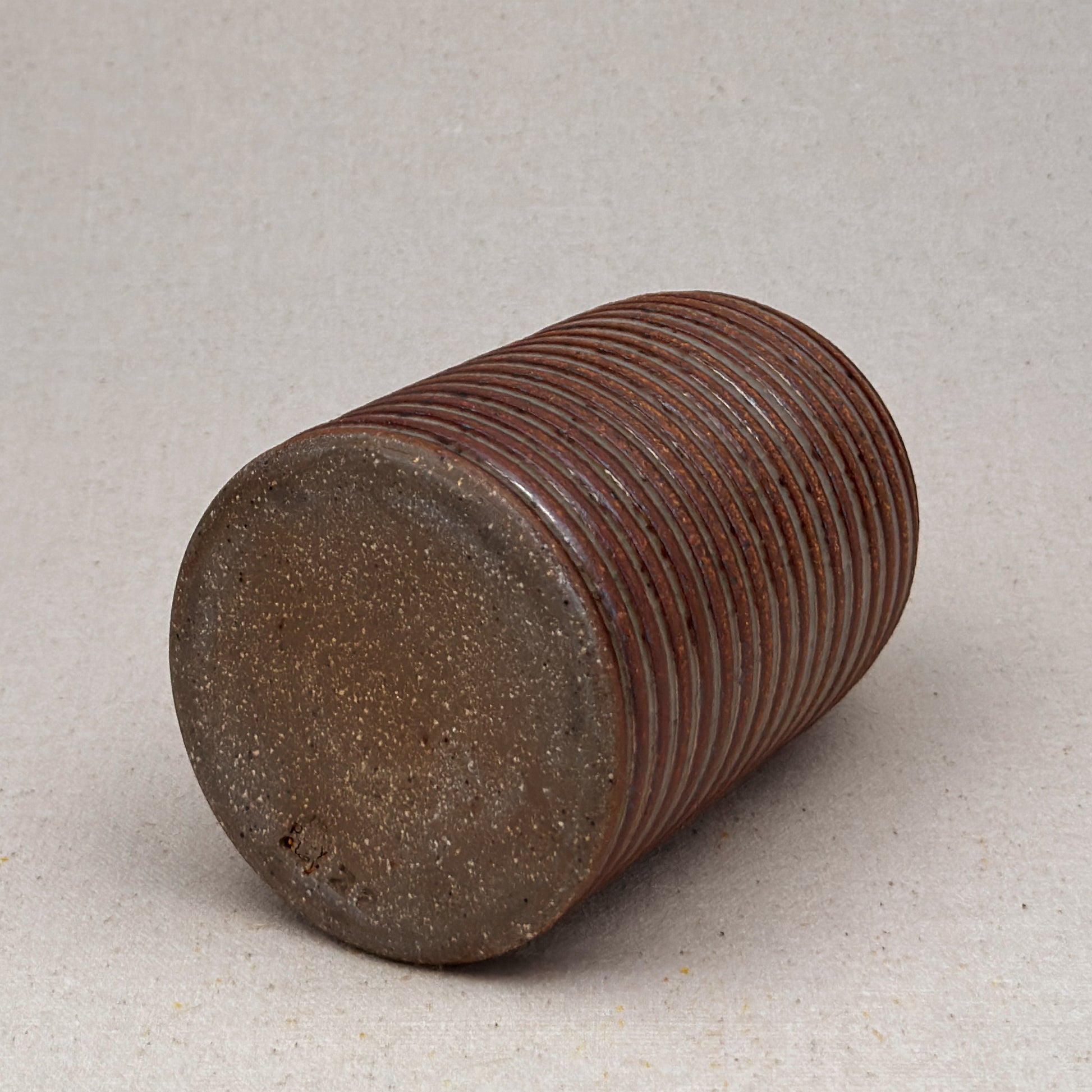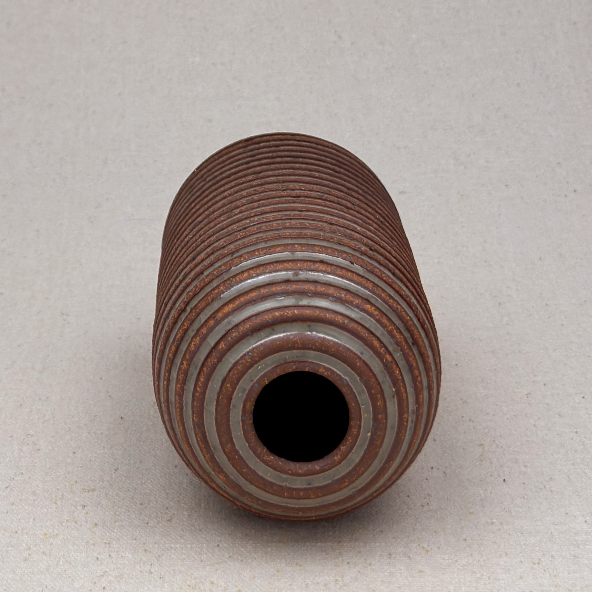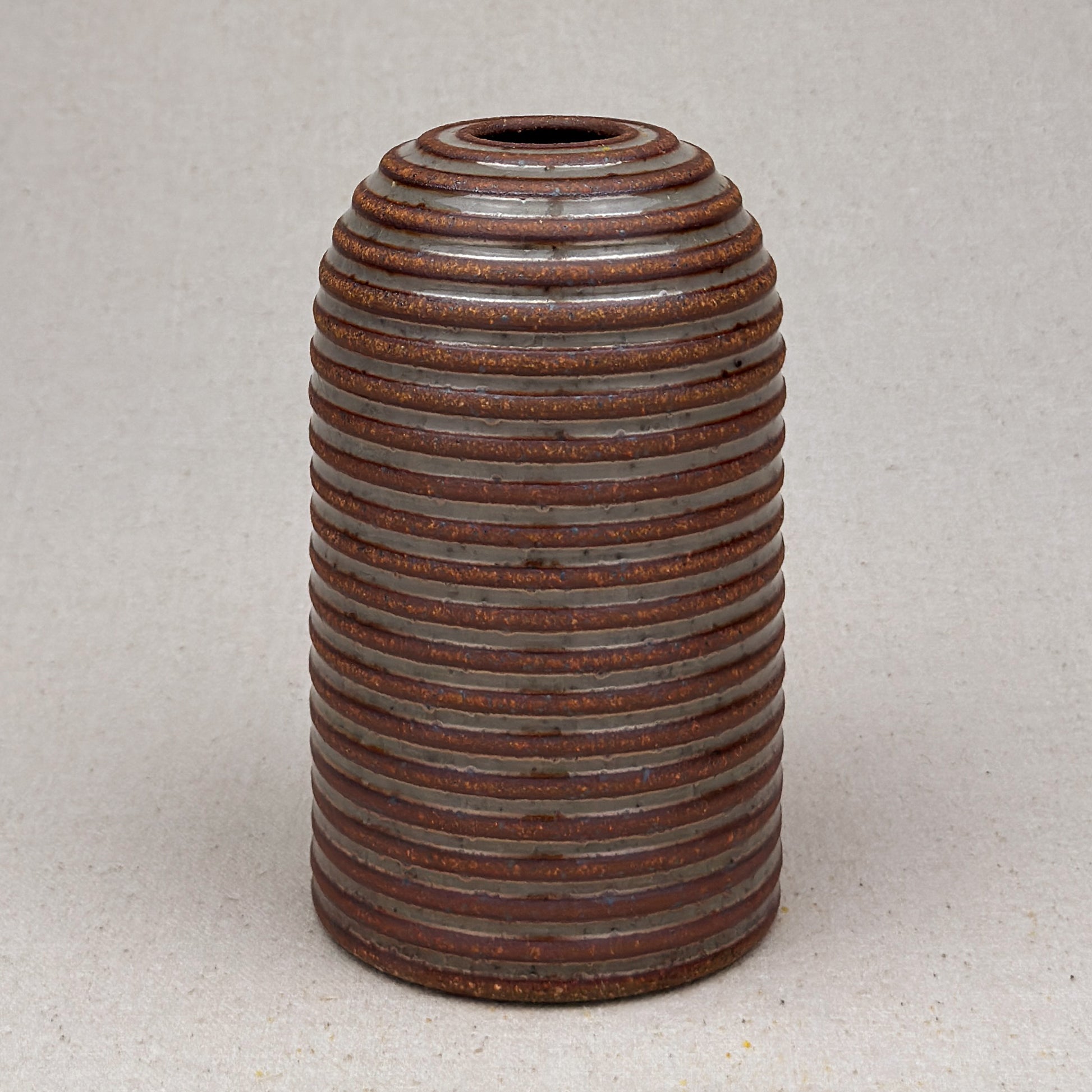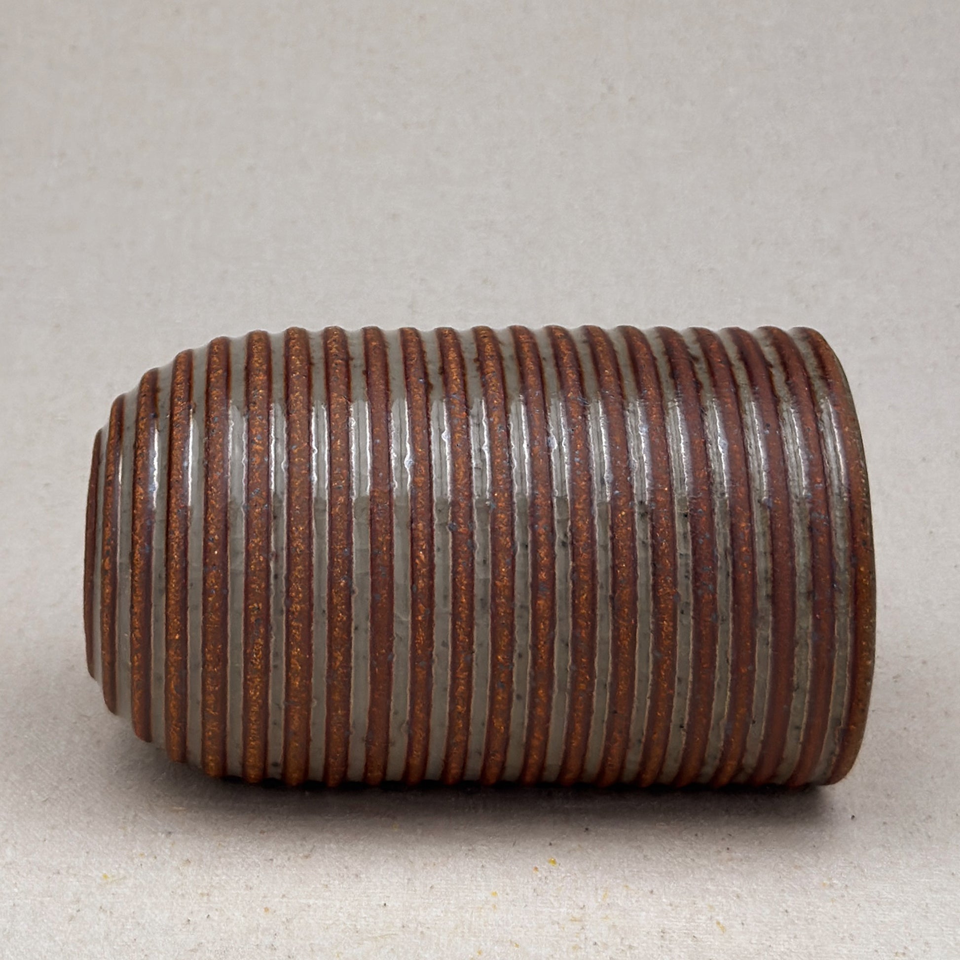 This shino striped vase was made on the potters wheel. When I threw it, I used a textured potter’s rib to form a deep groove into the wet clay. I used a luster shino glaze letting it pool among the ridges. I left the peaks unglazed, so you can see iron-based clay.
