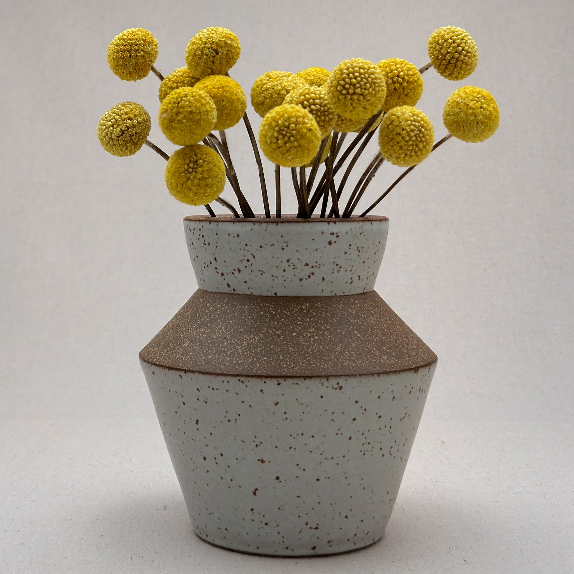 This speckled white ceramic vase was thrown on the wheel.