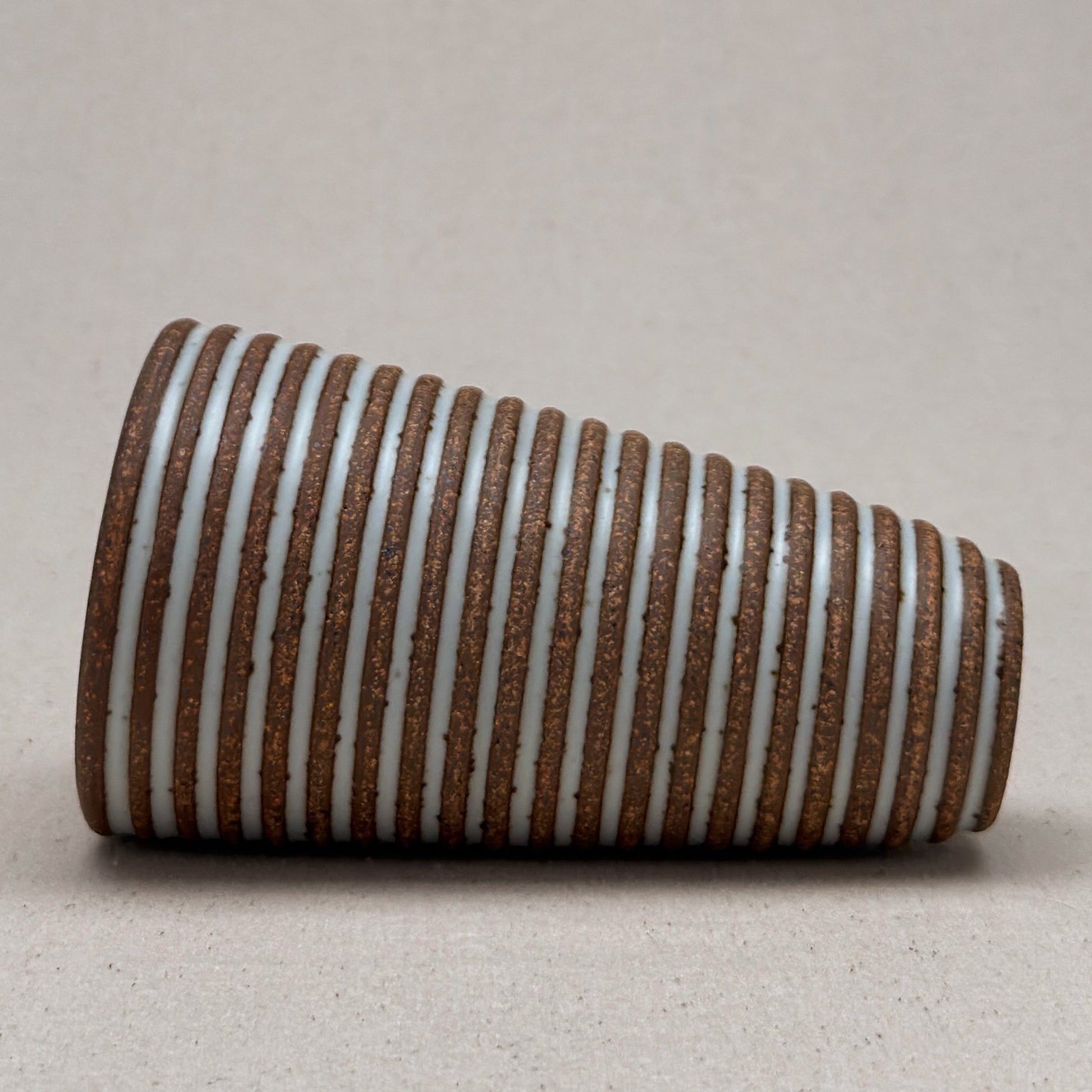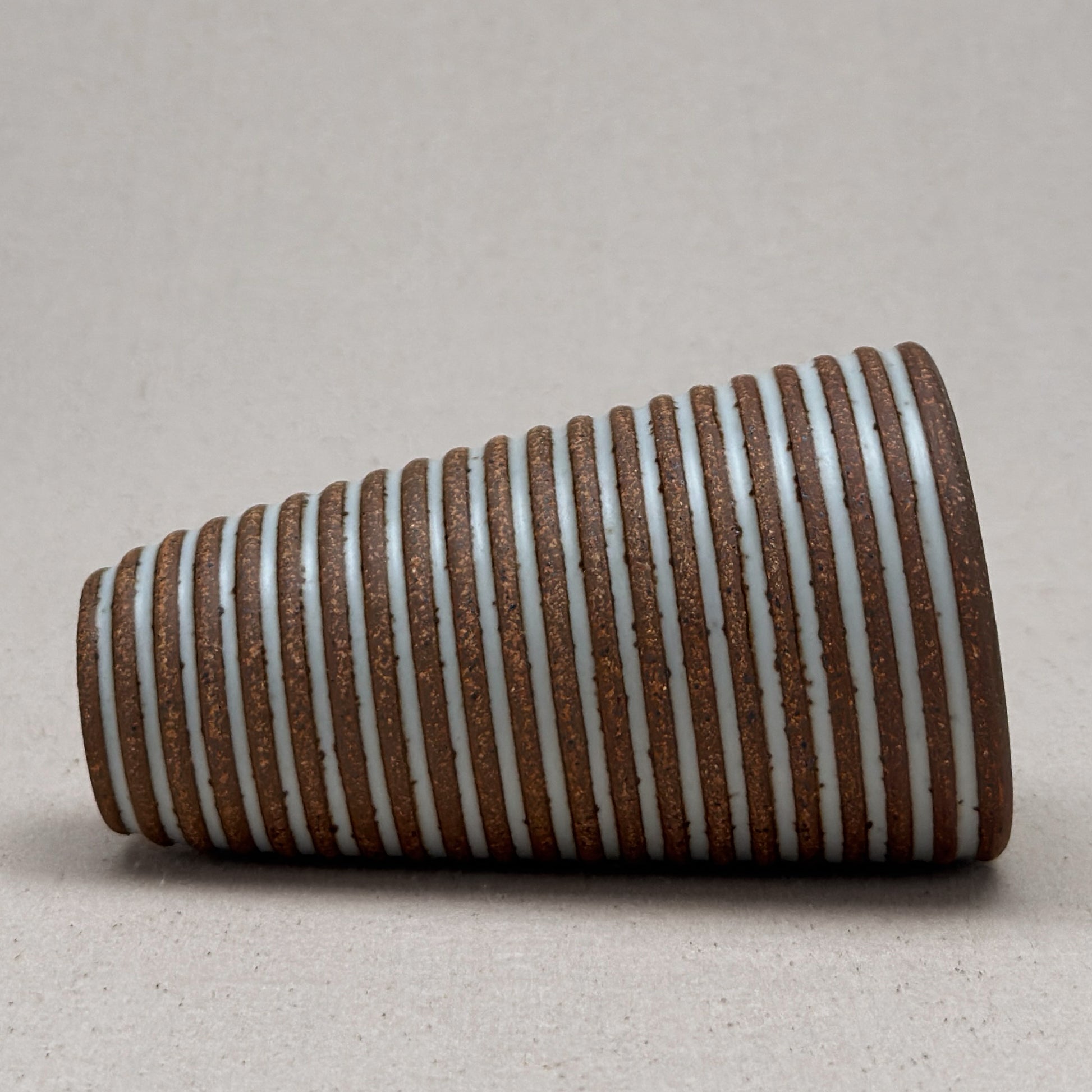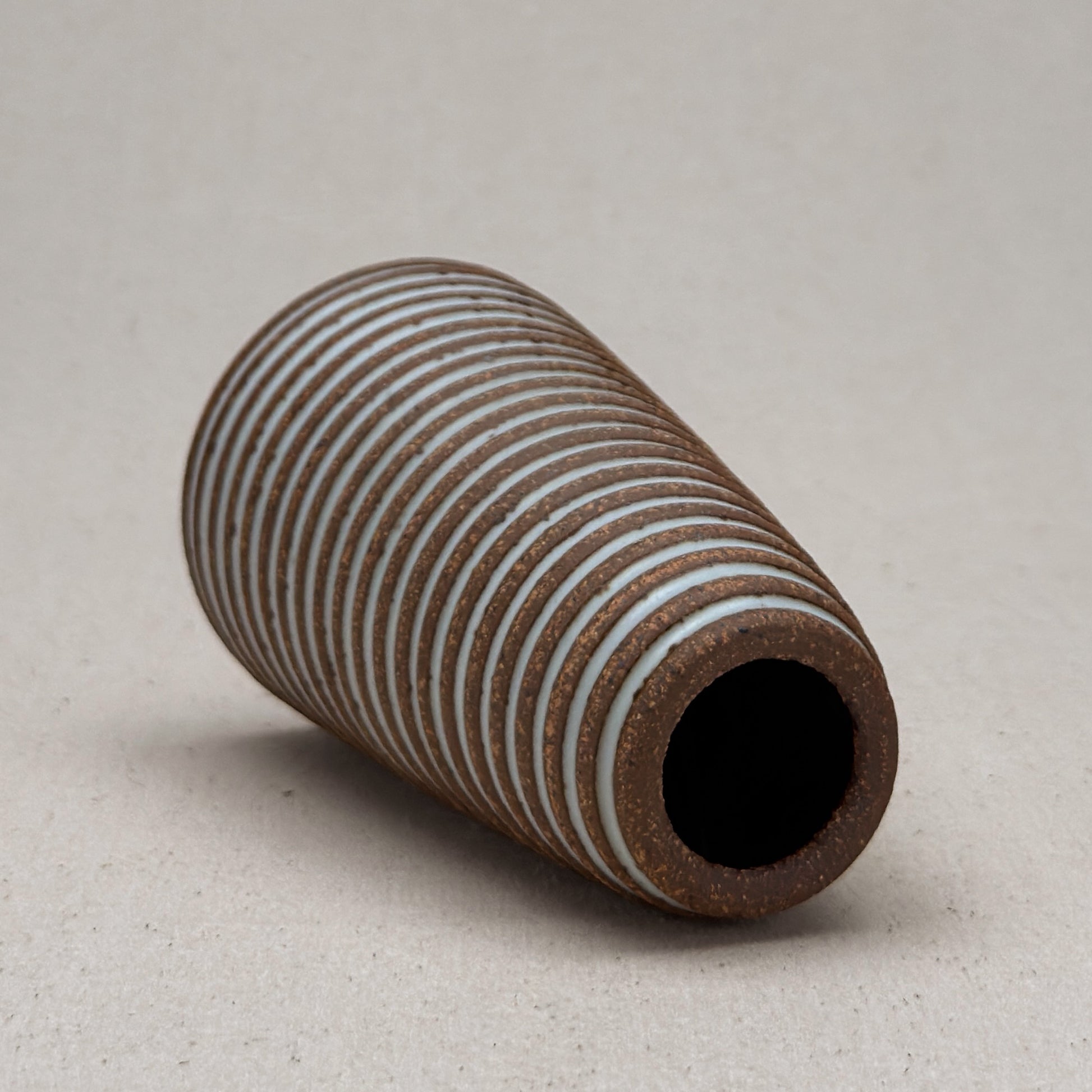This white striped vase was made on the potters wheel. When I threw it, I used a textured potter’s rib to form a deep groove into the wet clay. I used an opaque white glaze letting it pool among the ridges. I left the peaks unglazed, so you can see iron-based clay.