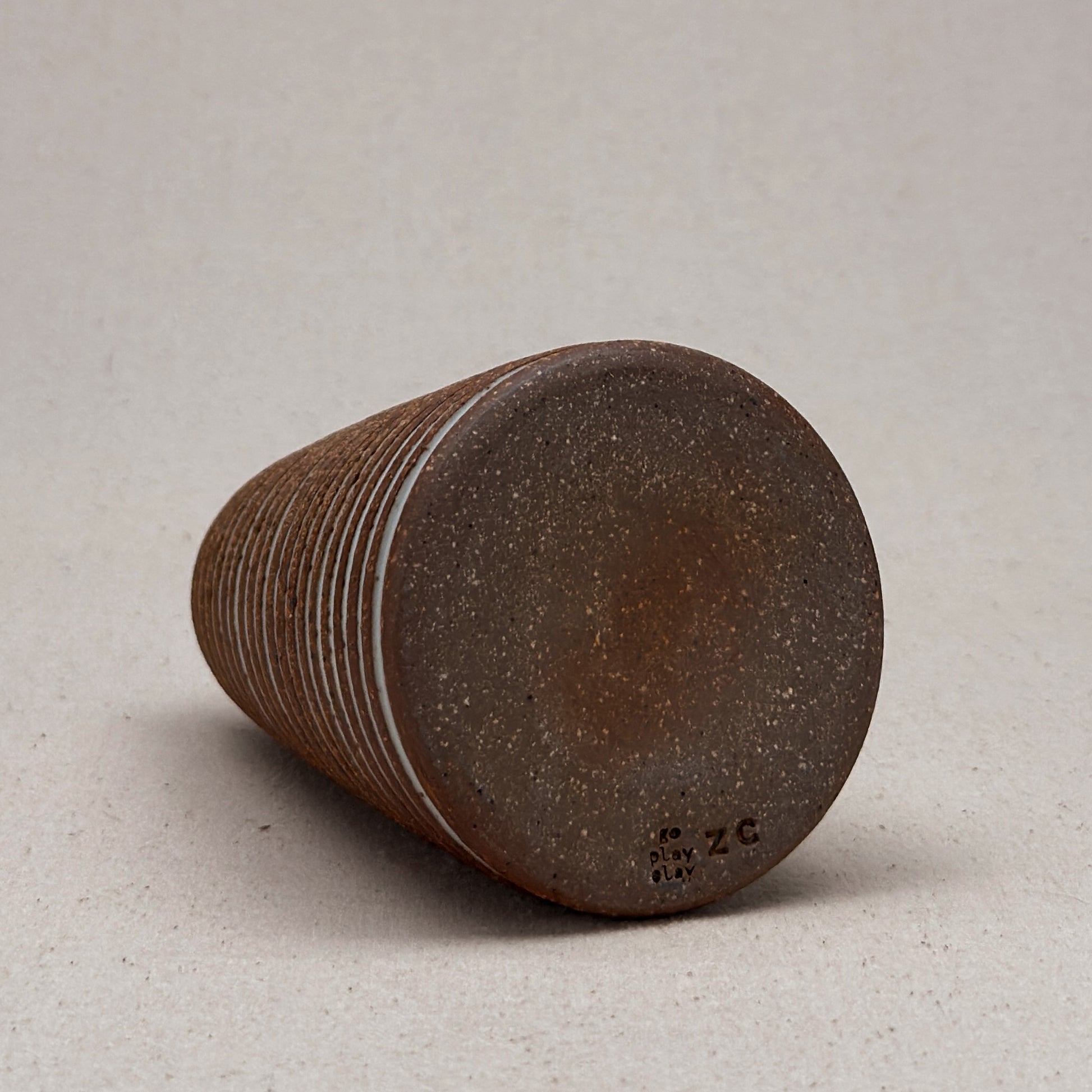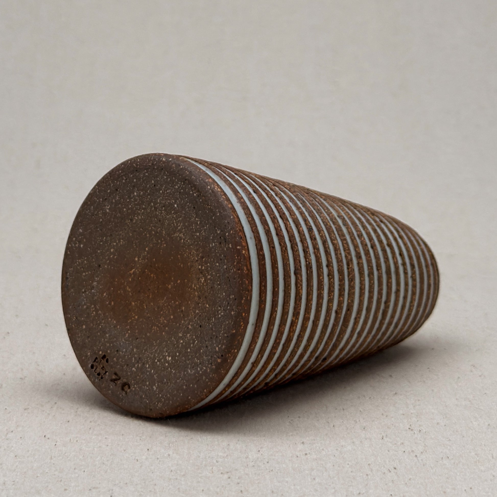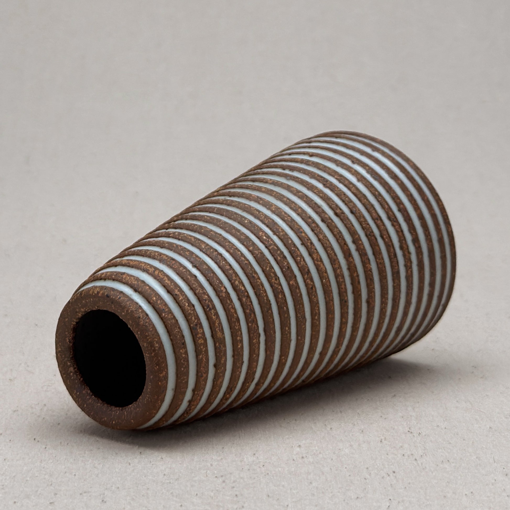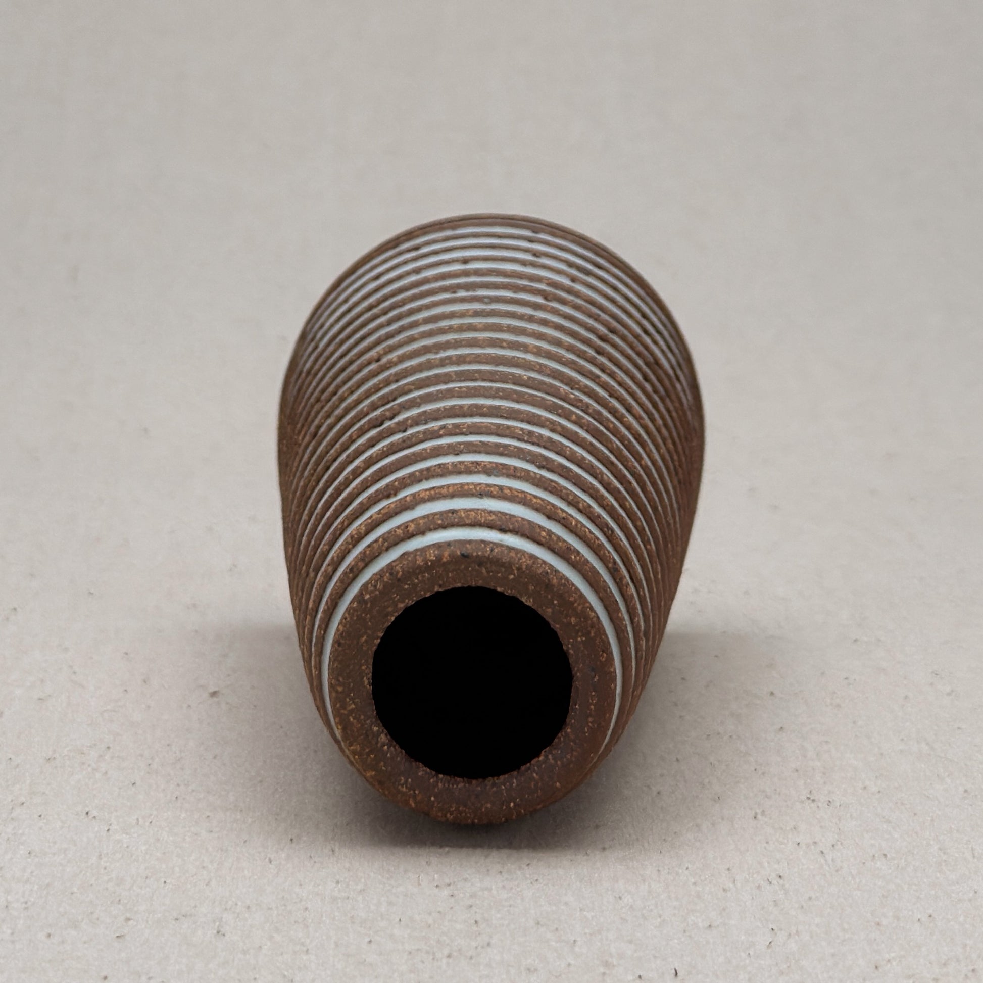 This white striped vase was made on the potters wheel. When I threw it, I used a textured potter’s rib to form a deep groove into the wet clay. I used an opaque white glaze letting it pool among the ridges. I left the peaks unglazed, so you can see iron-based clay.