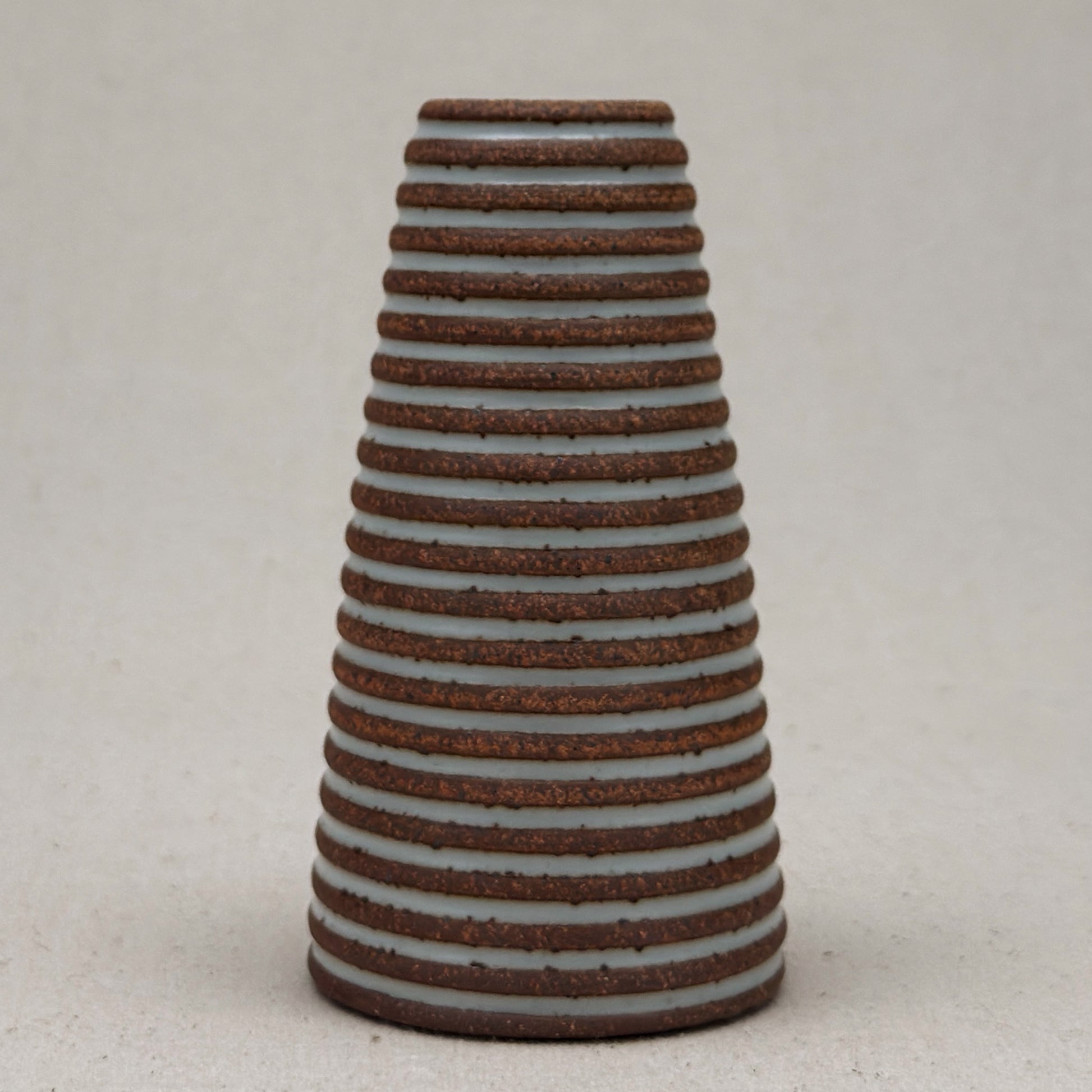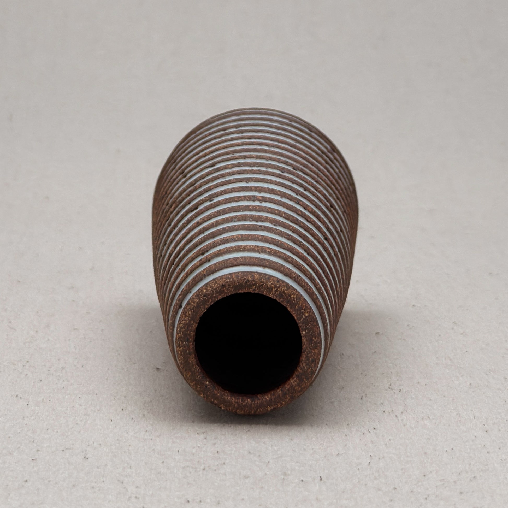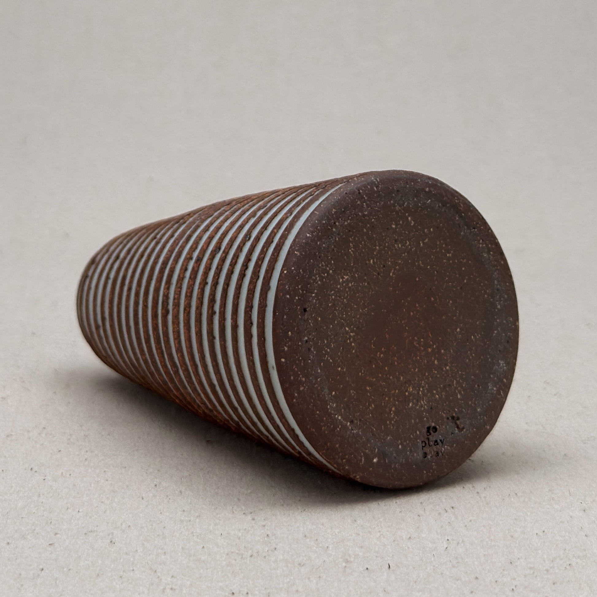 This white striped vase was made on the potters wheel. When I threw it, I used a textured potter’s rib to form a deep groove into the wet clay. I used an opaque white glaze letting it pool among the ridges. I left the peaks unglazed, so you can see iron-based clay.