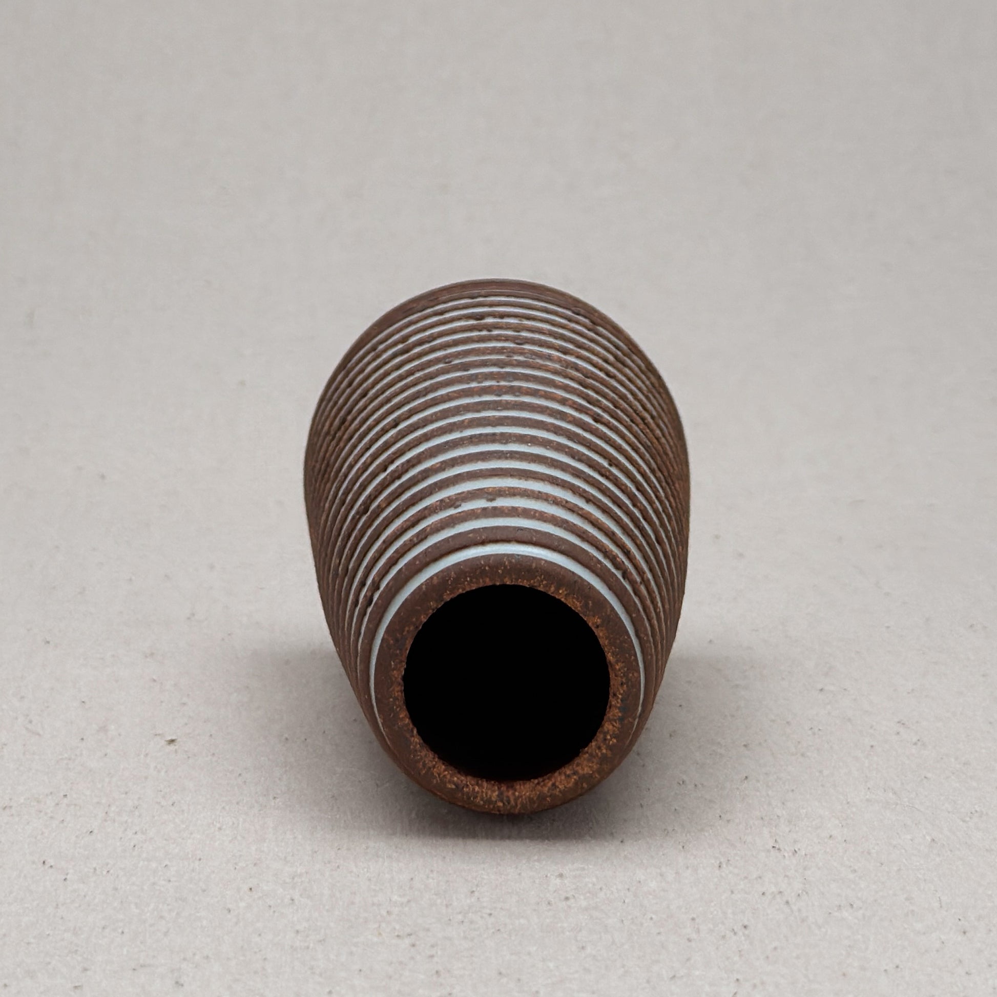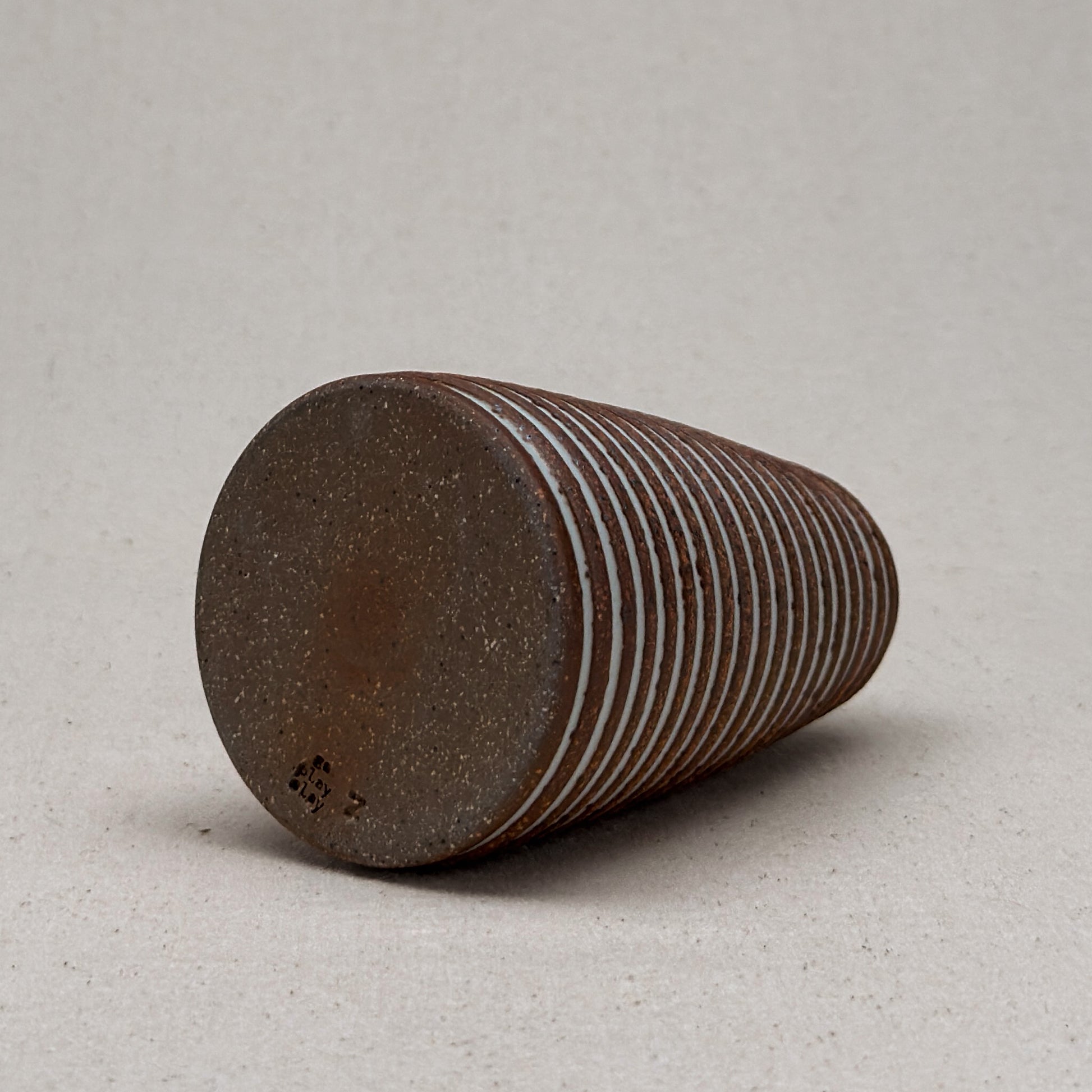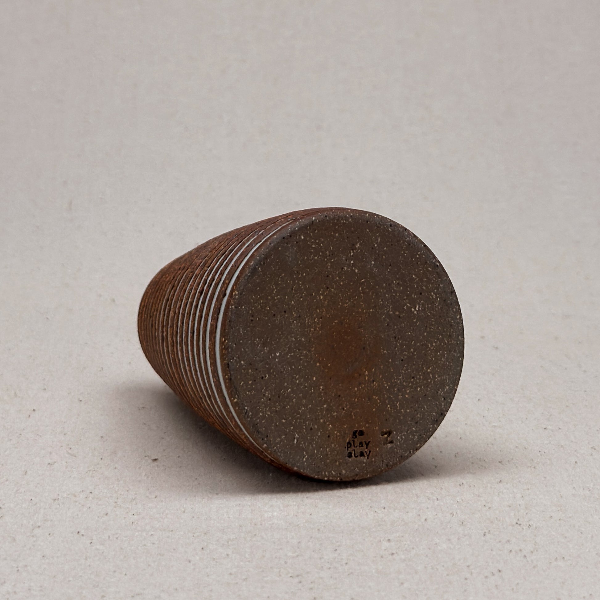 This white striped vase was made on the potters wheel. When I threw it, I used a textured potter’s rib to form a deep groove into the wet clay. I used an opaque white glaze letting it pool among the ridges. I left the peaks unglazed, so you can see iron-based clay.