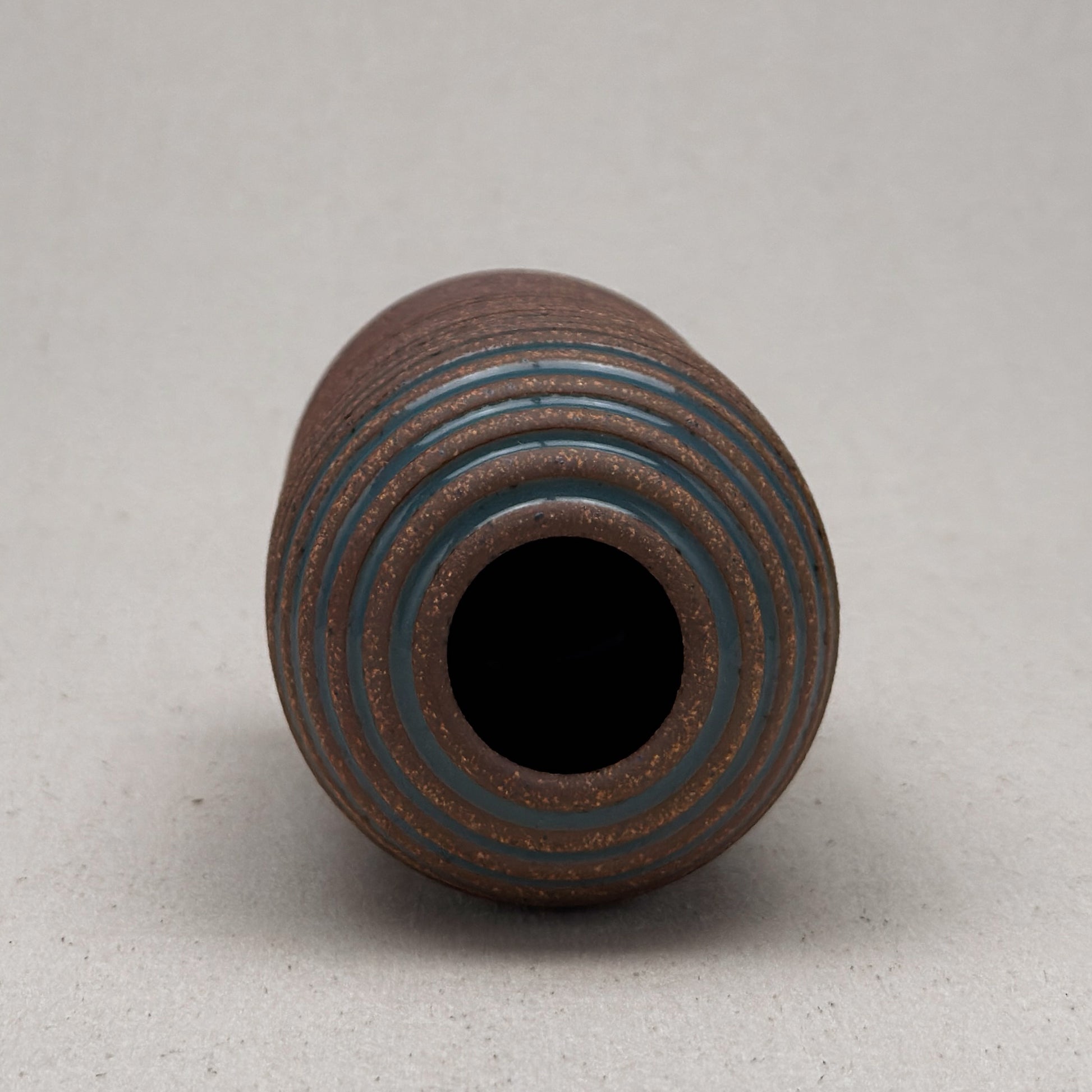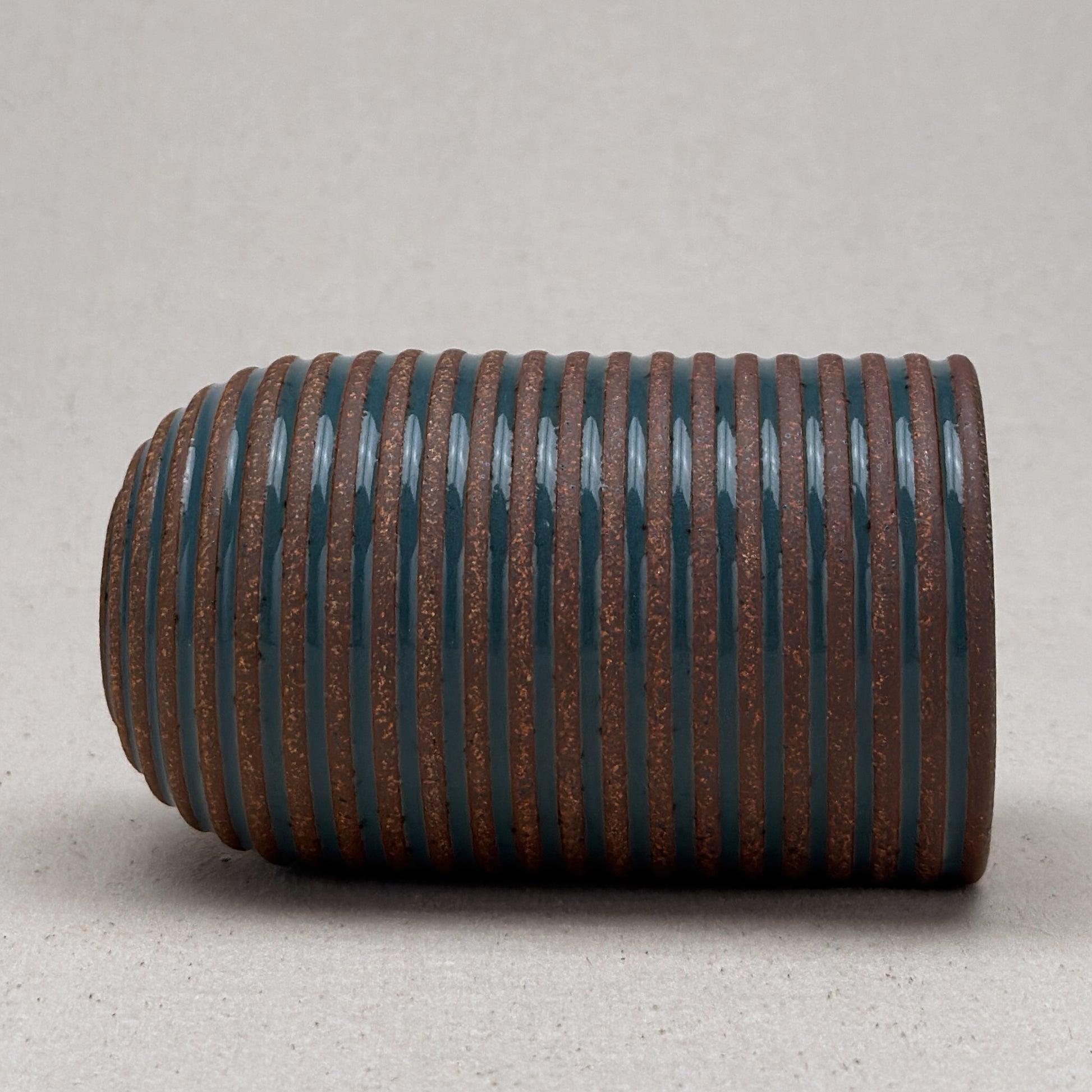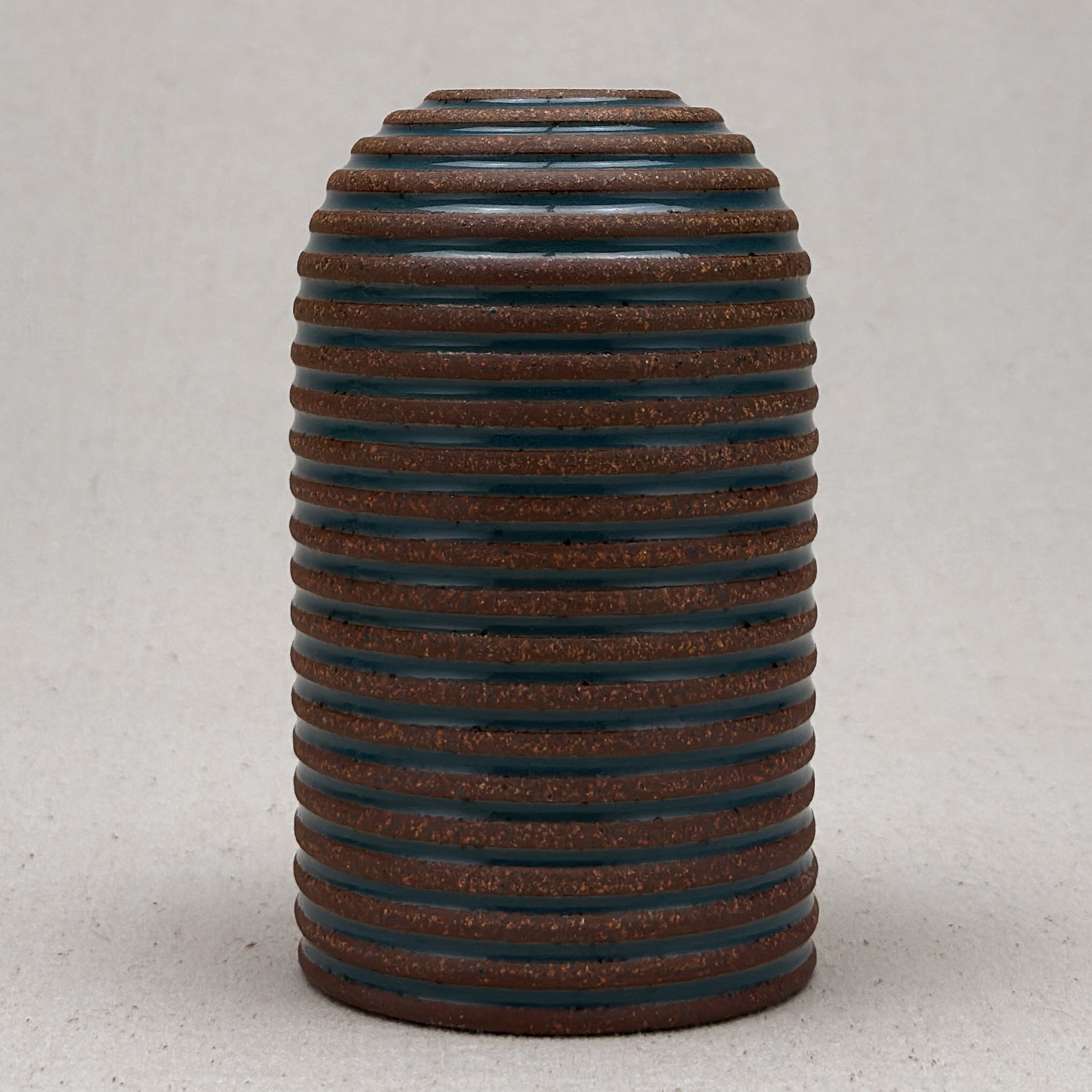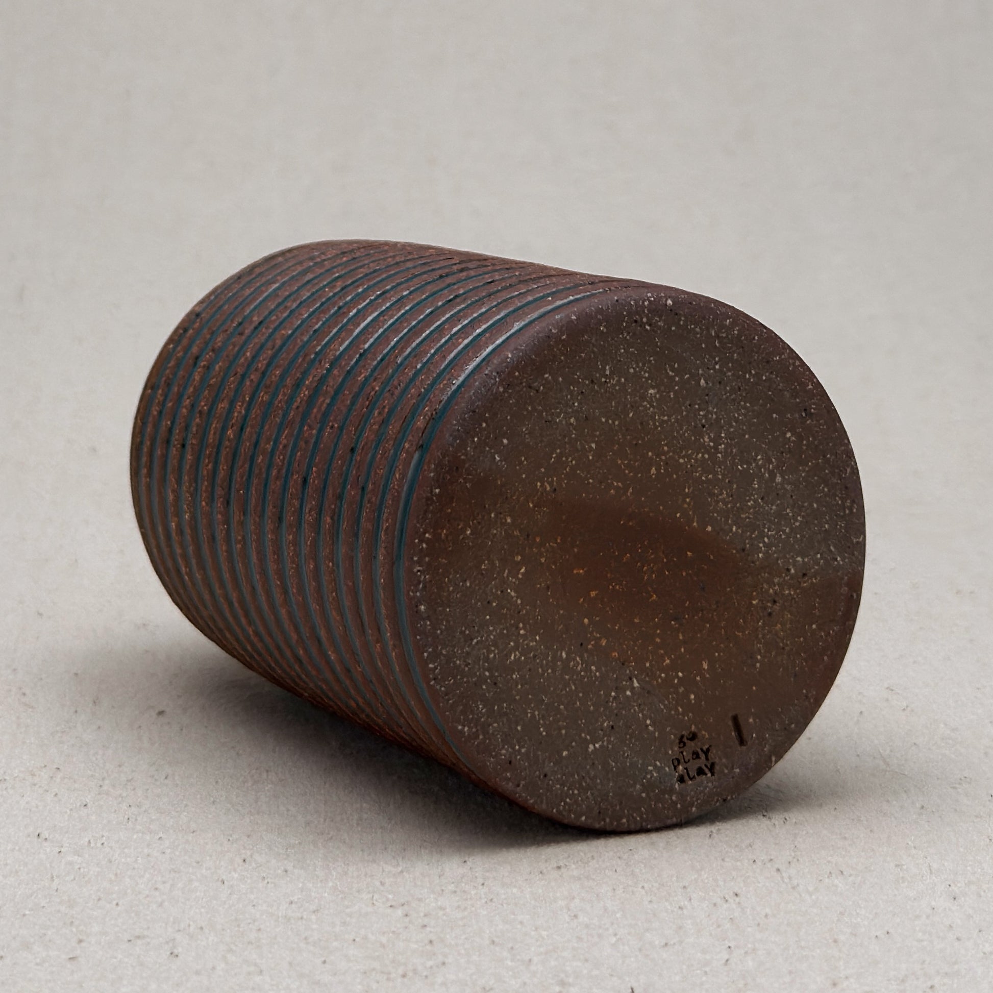 This striped blue ceramic bud vase was made on the potters wheel. When I threw it, I used a textured potter’s rib to form a deep groove into the wet clay. I used a transparent blue glaze letting it pool among the ridges. I left the peaks unglazed, so you can see iron-based clay.