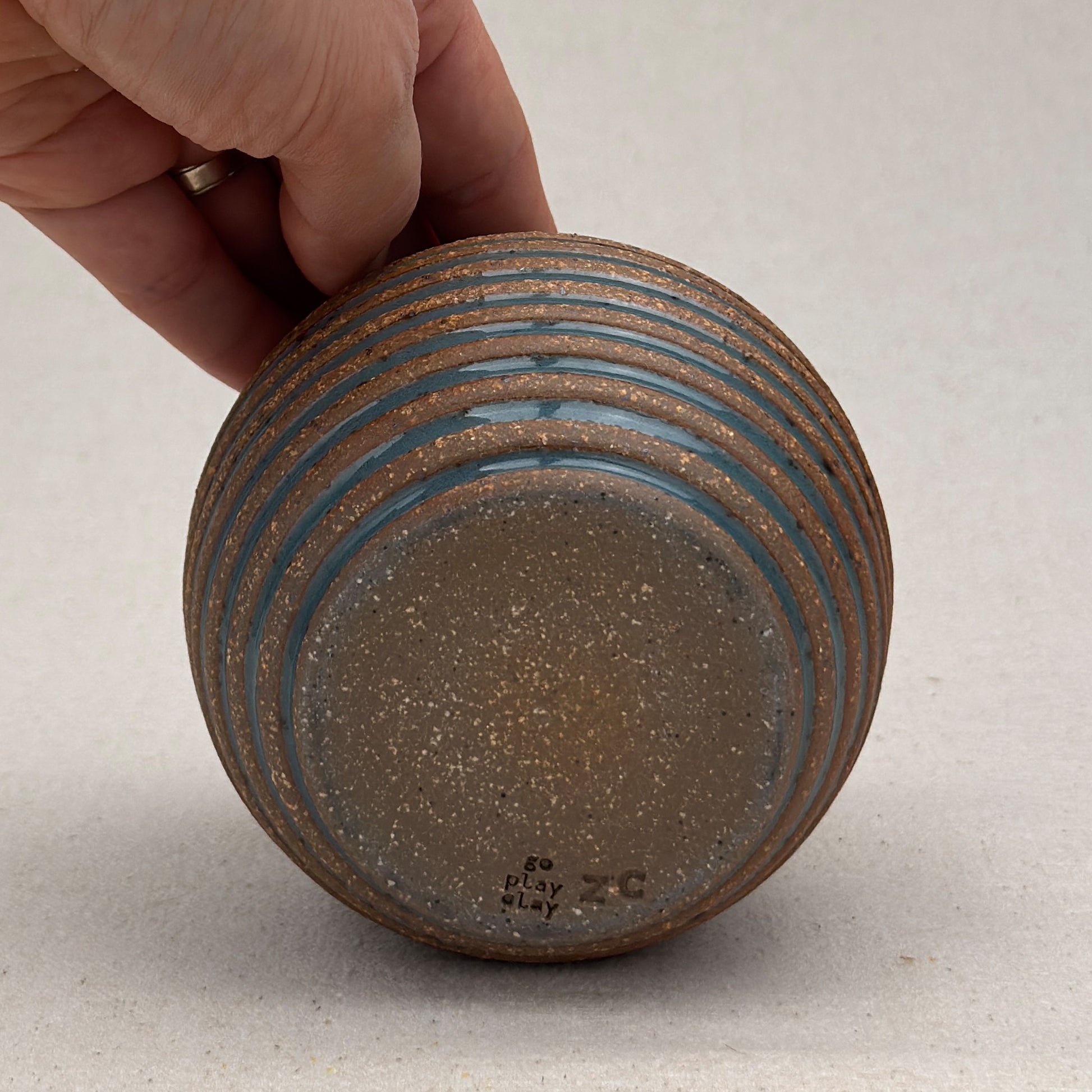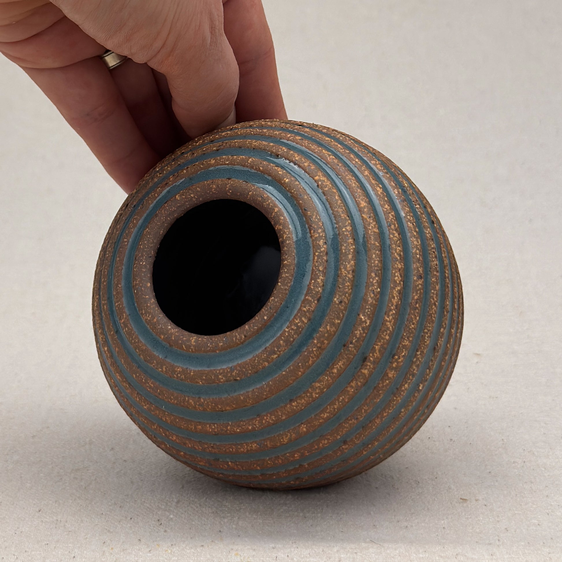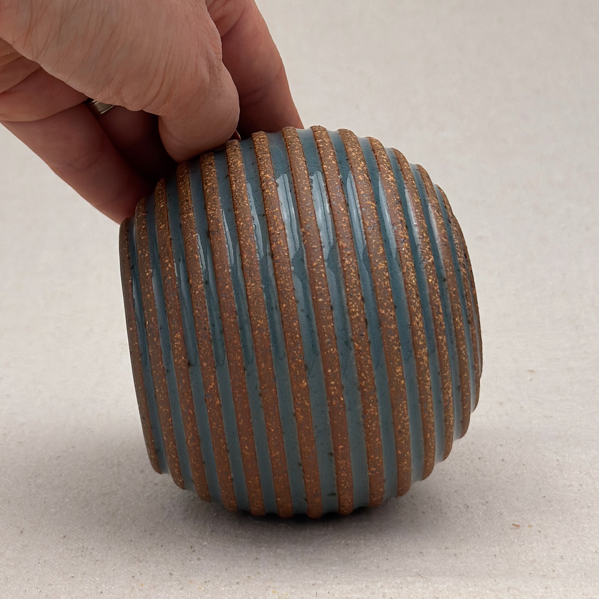 This striped blue ceramic vase was made on the potters wheel. When I threw it, I used a textured potter’s rib to form a deep groove into the wet clay. I used a transparent blue glaze letting it pool among the ridges. I left the peaks unglazed, so you can see iron-based clay.