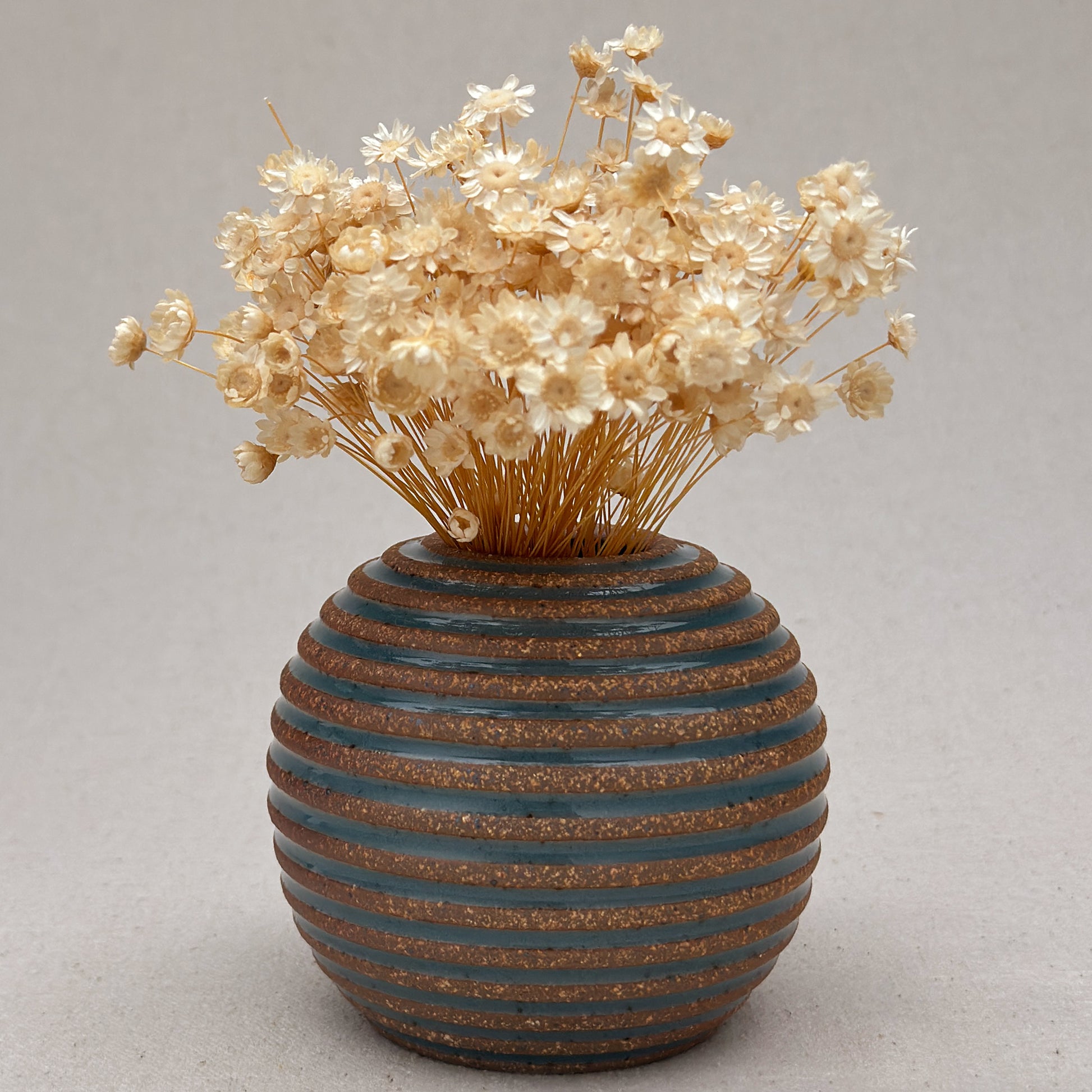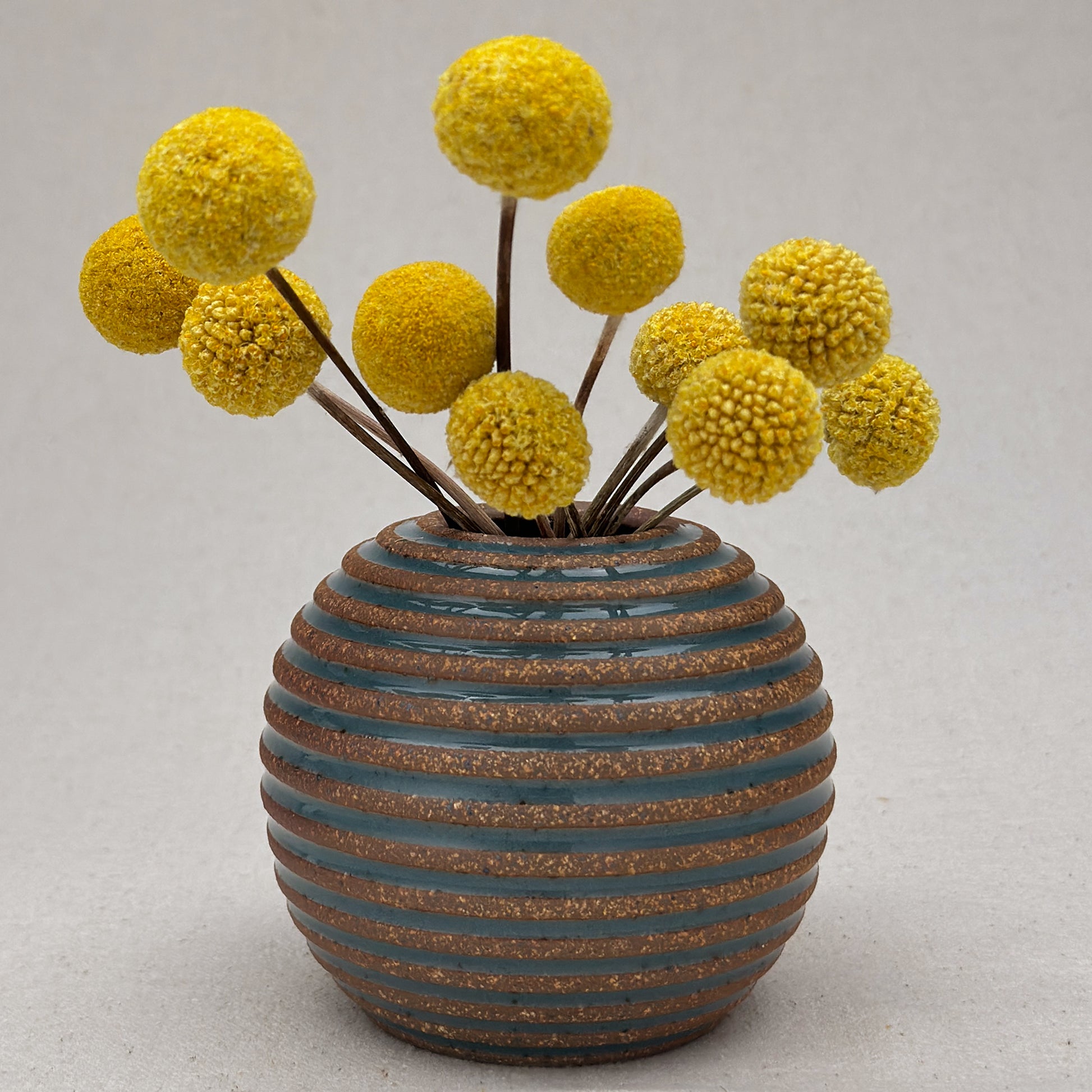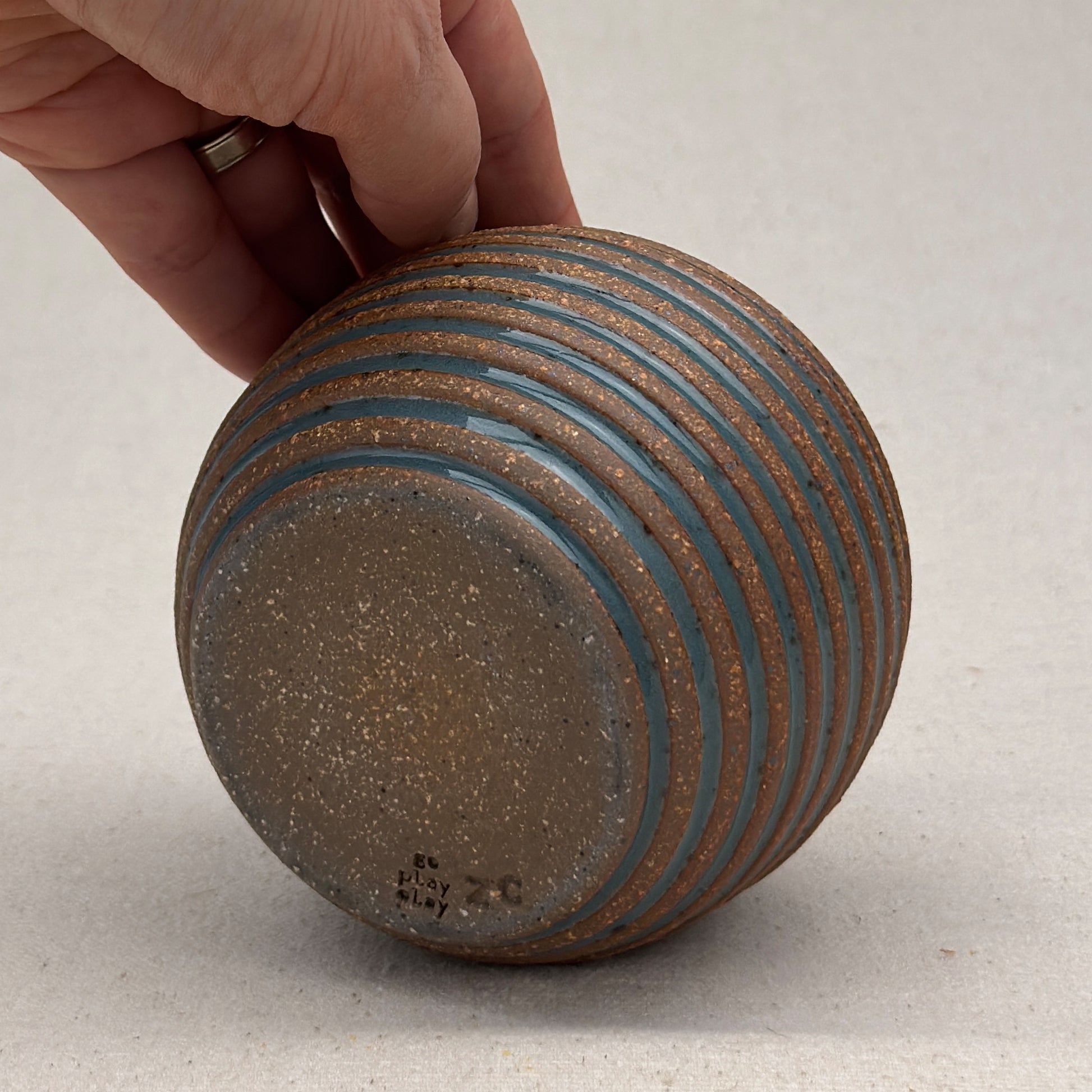 This striped blue ceramic vase was made on the potters wheel. When I threw it, I used a textured potter’s rib to form a deep groove into the wet clay. I used a transparent blue glaze letting it pool among the ridges. I left the peaks unglazed, so you can see iron-based clay.