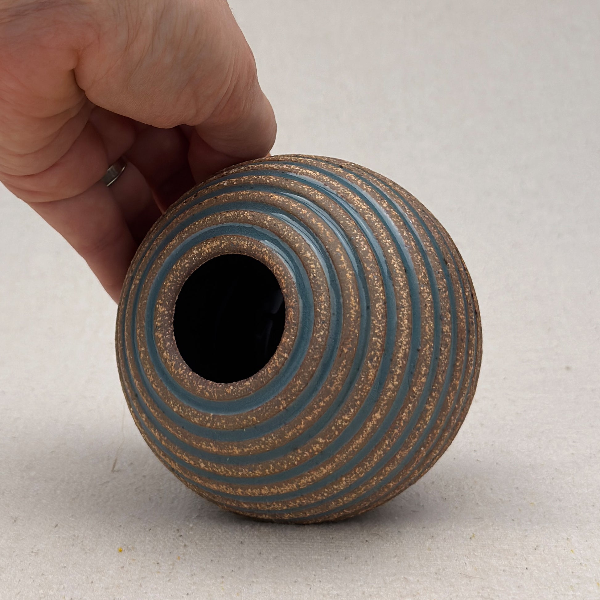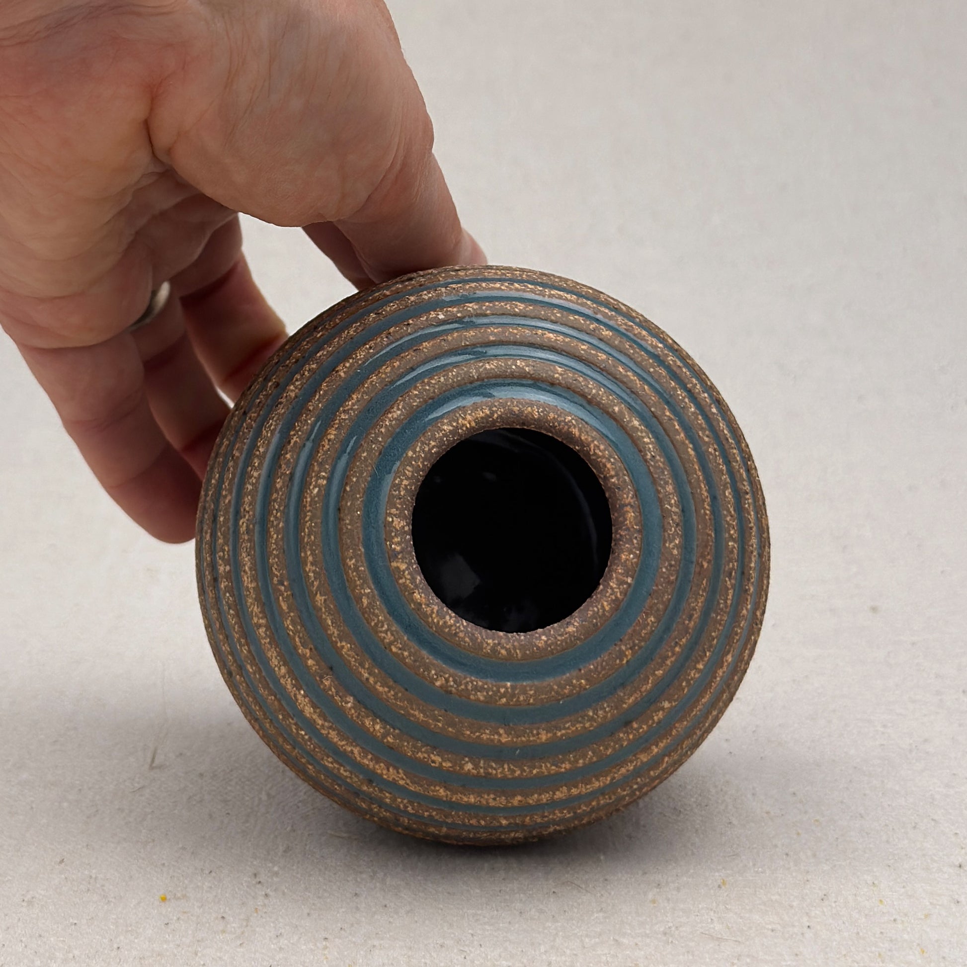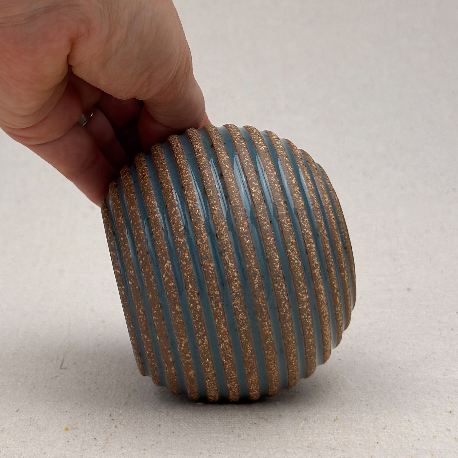 This striped blue ceramic vase was made on the potters wheel. When I threw it, I used a textured potter’s rib to form a deep groove into the wet clay. I used a transparent blue glaze letting it pool among the ridges. I left the peaks unglazed, so you can see iron-based clay.
