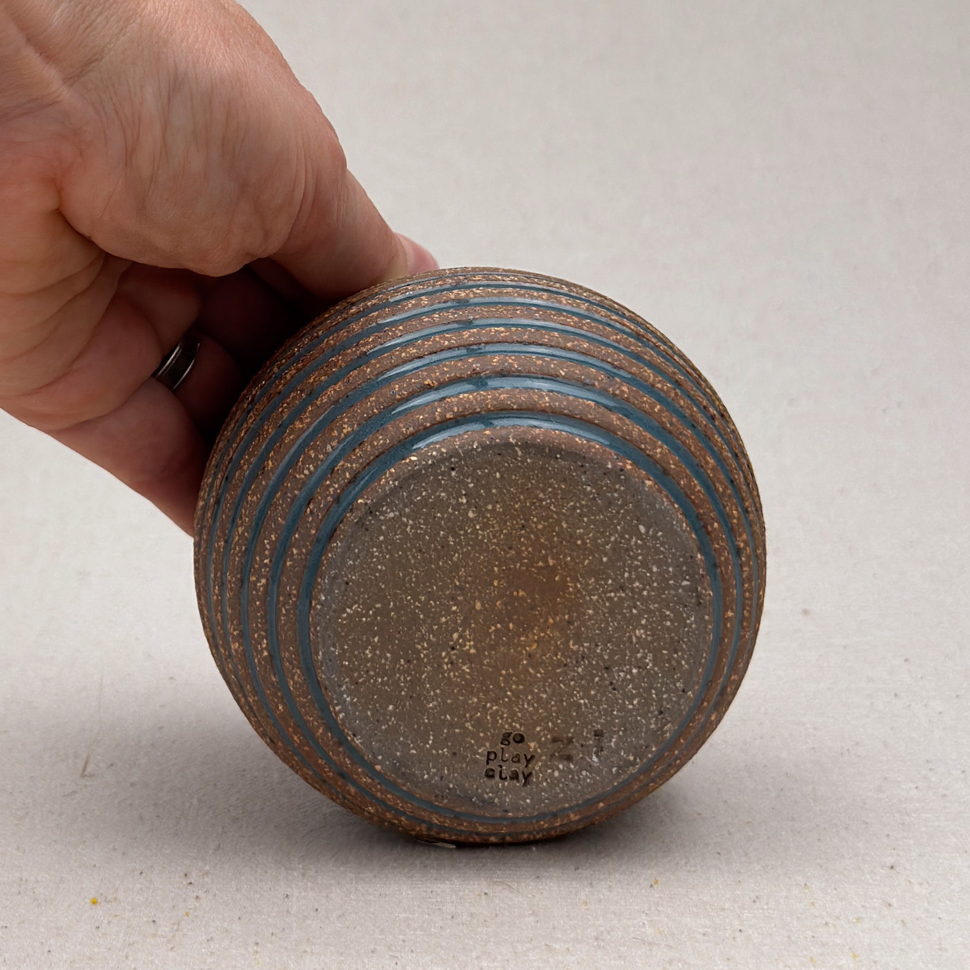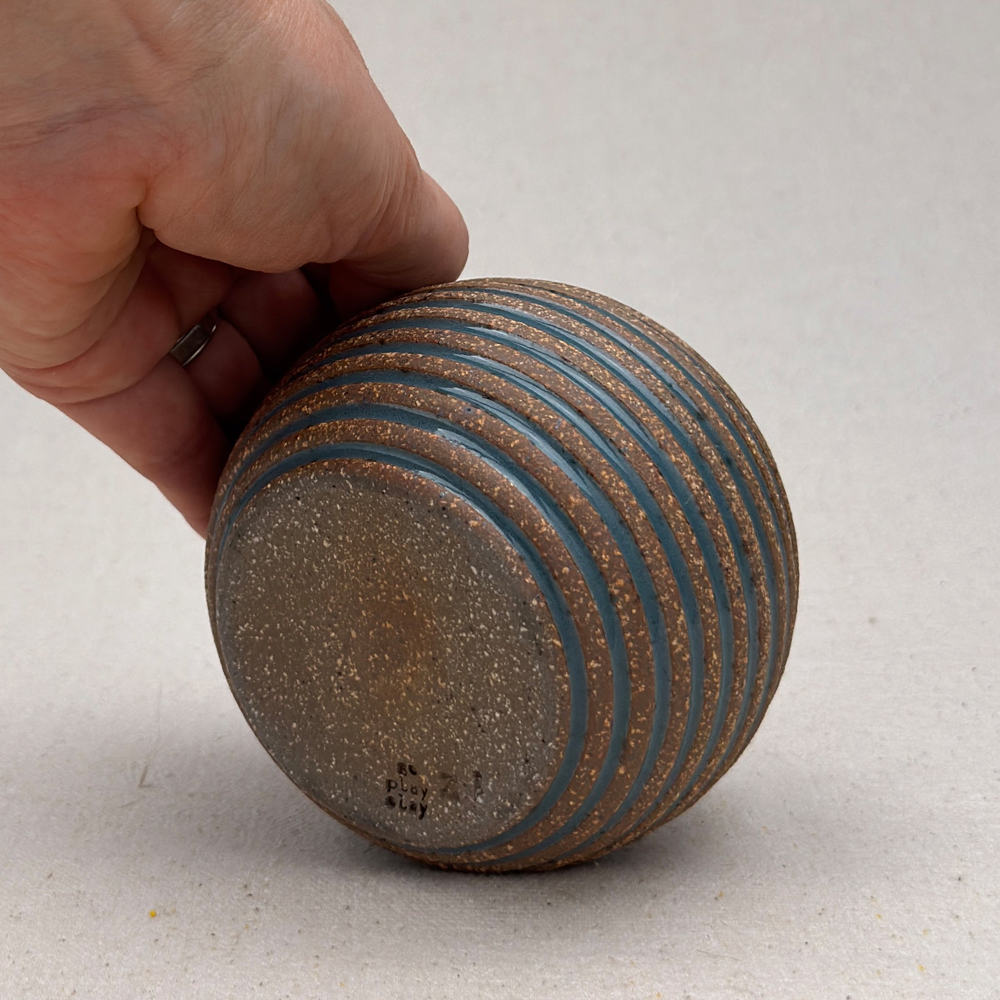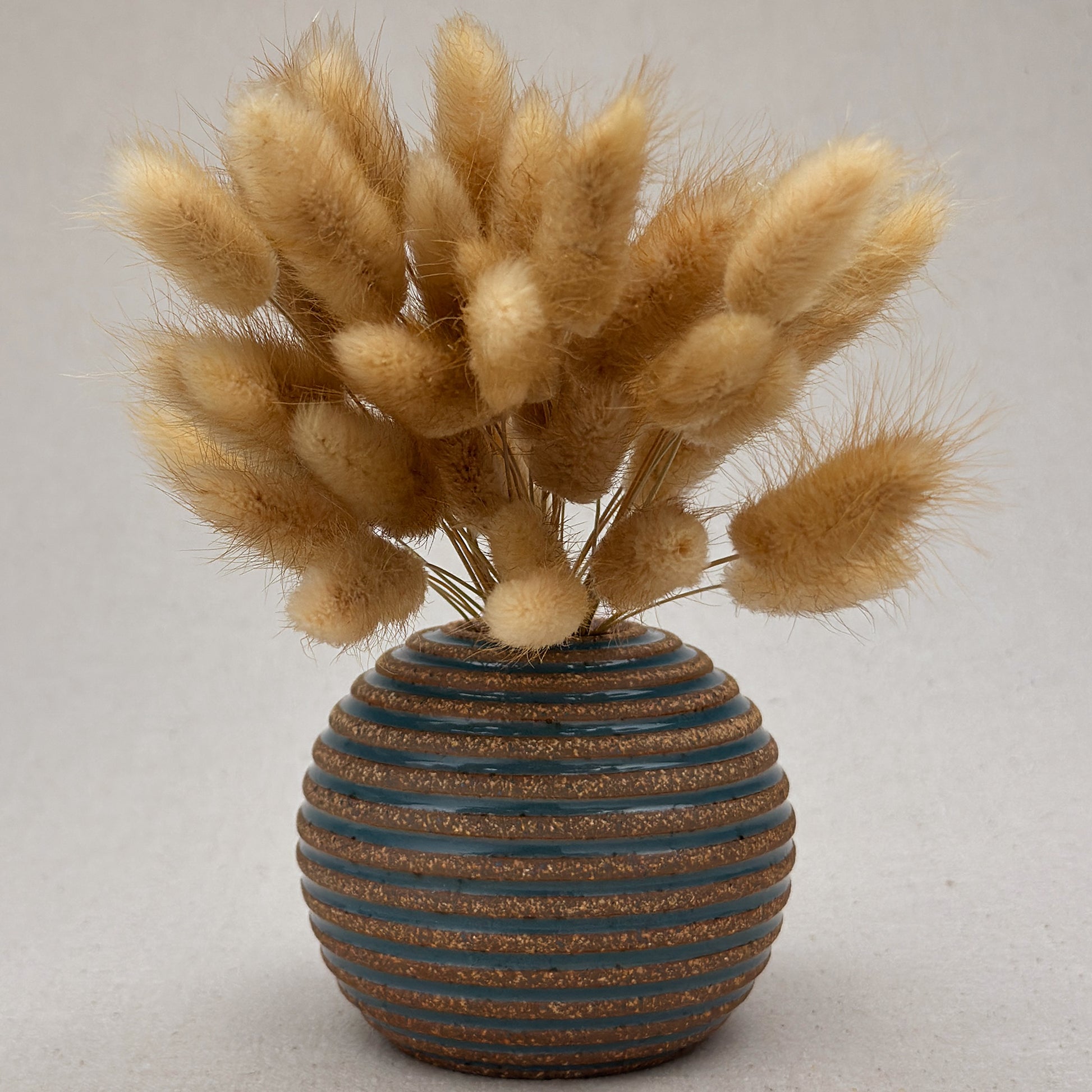 This striped blue ceramic vase was made on the potters wheel. When I threw it, I used a textured potter’s rib to form a deep groove into the wet clay. I used a transparent blue glaze letting it pool among the ridges. I left the peaks unglazed, so you can see iron-based clay.