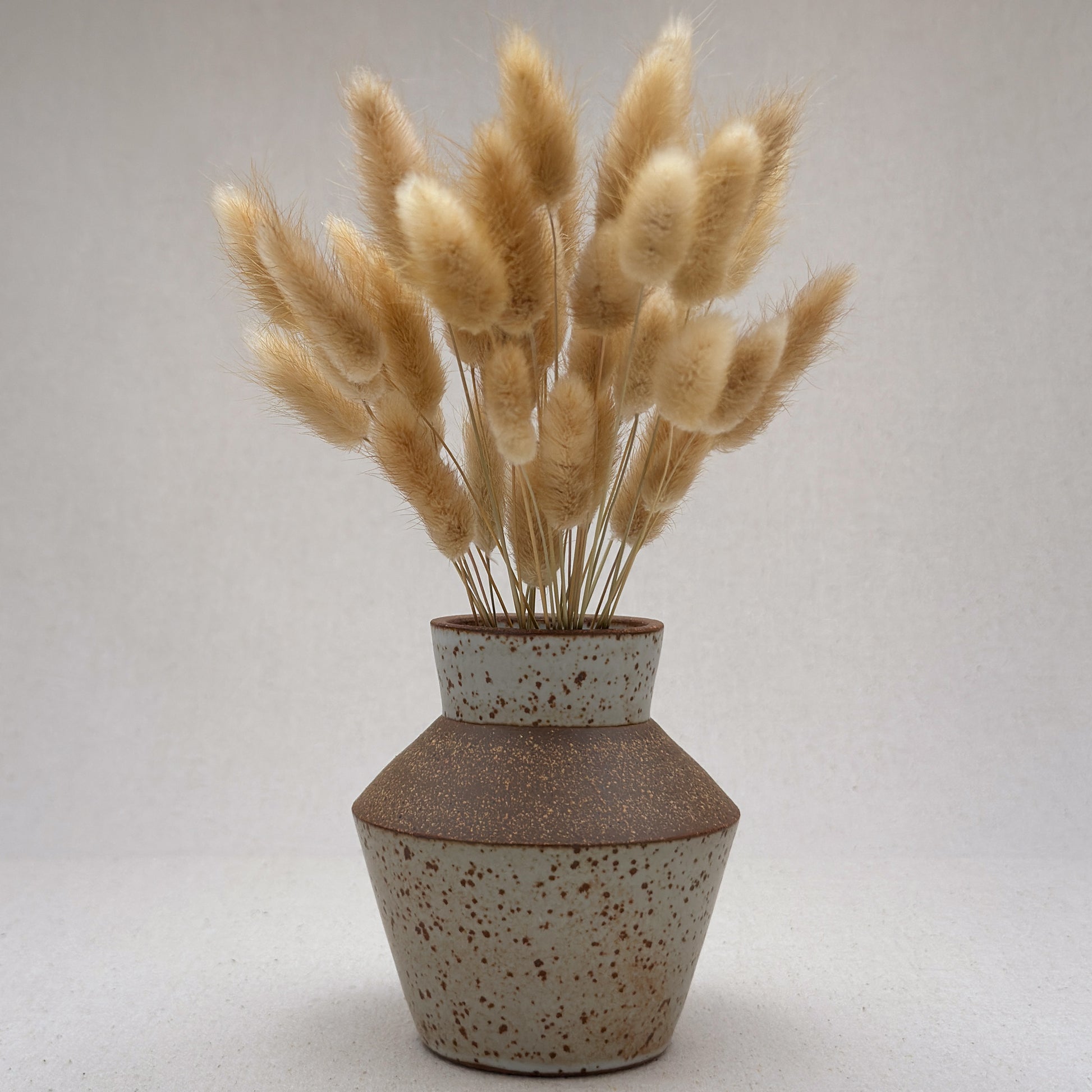It's angular shape makes it a fun vase for small table arrangements. The opening at the neck is about three inches wide, making it perfect for bold arrangements that still need to include a few thick stems. I love putting billy balls, bunny tails, or eucalyptus in this form. Wild bouquets contrast nicely with the angular design of the form.