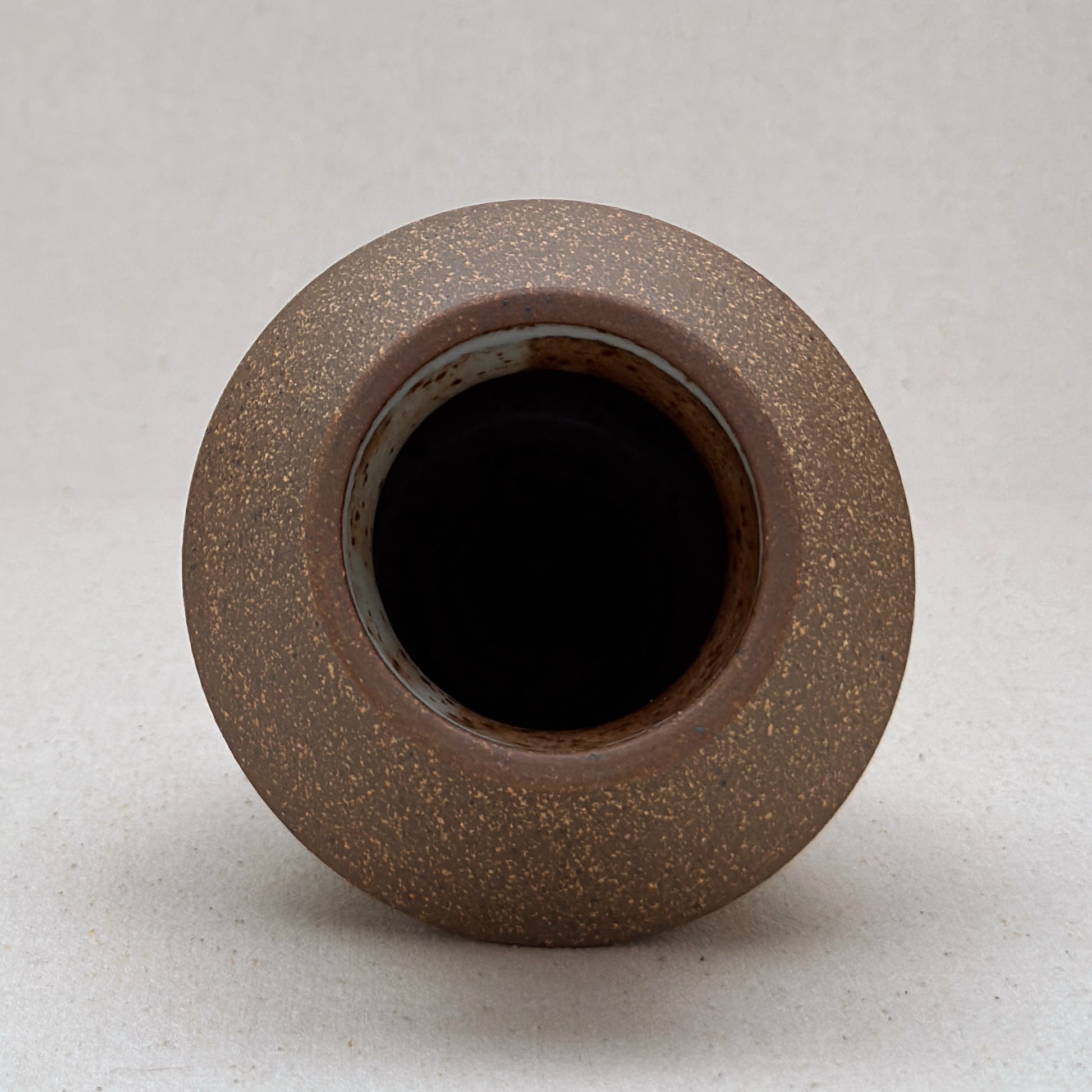 It is glazed in a white opaque glaze that when fired results in a thick satin finish with iron speckles. Two areas on the outside are left bare to reveal the texture and color of the iron in the clay. The interior is fully glazed and watertight.