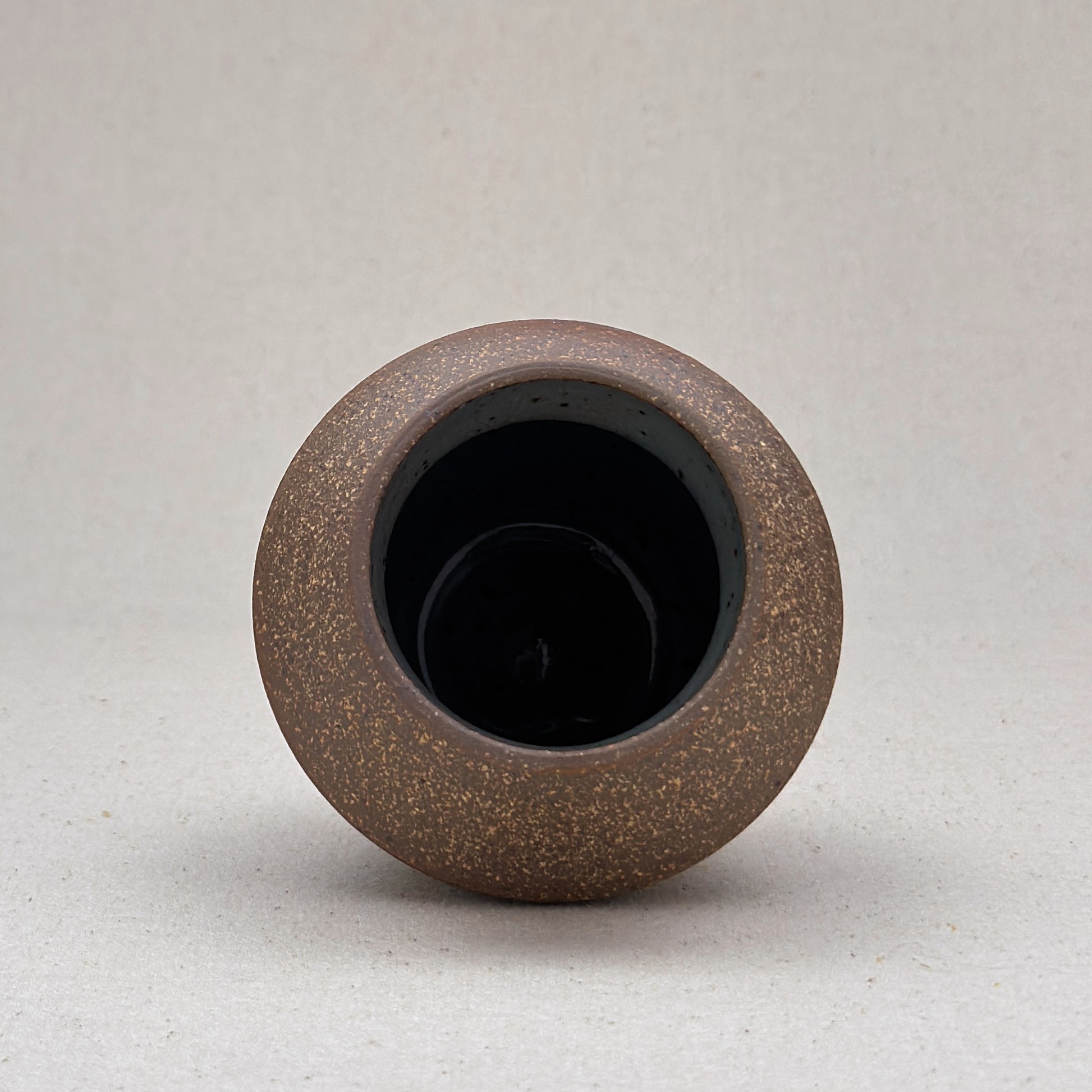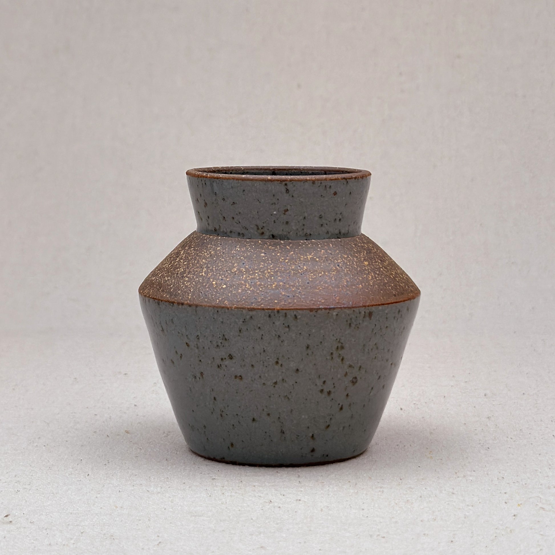 This small blue ceramic vase was thrown on the wheel. The total height is just under four inches. The width is just over three inches wide. The opening at the top is just over an inch wide.