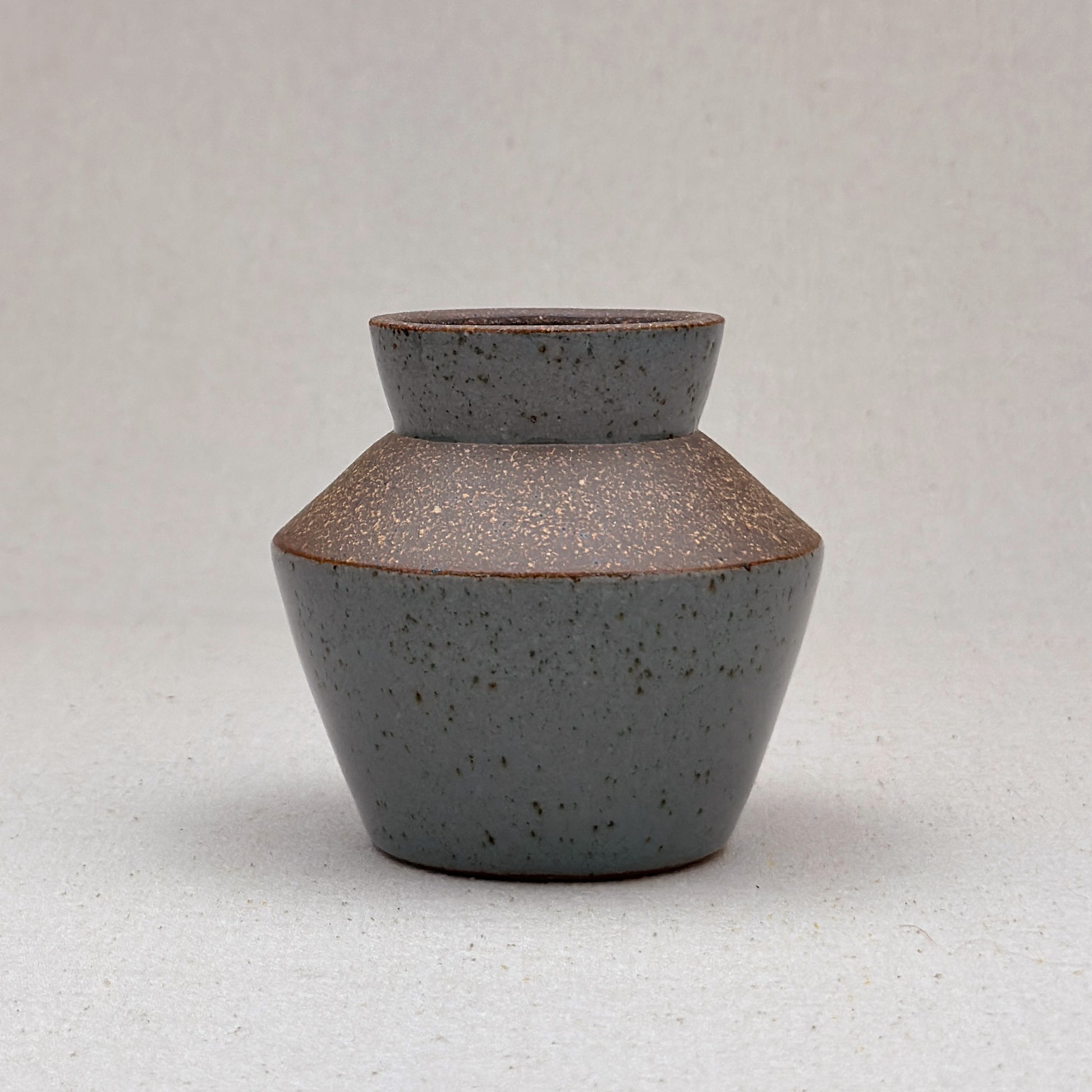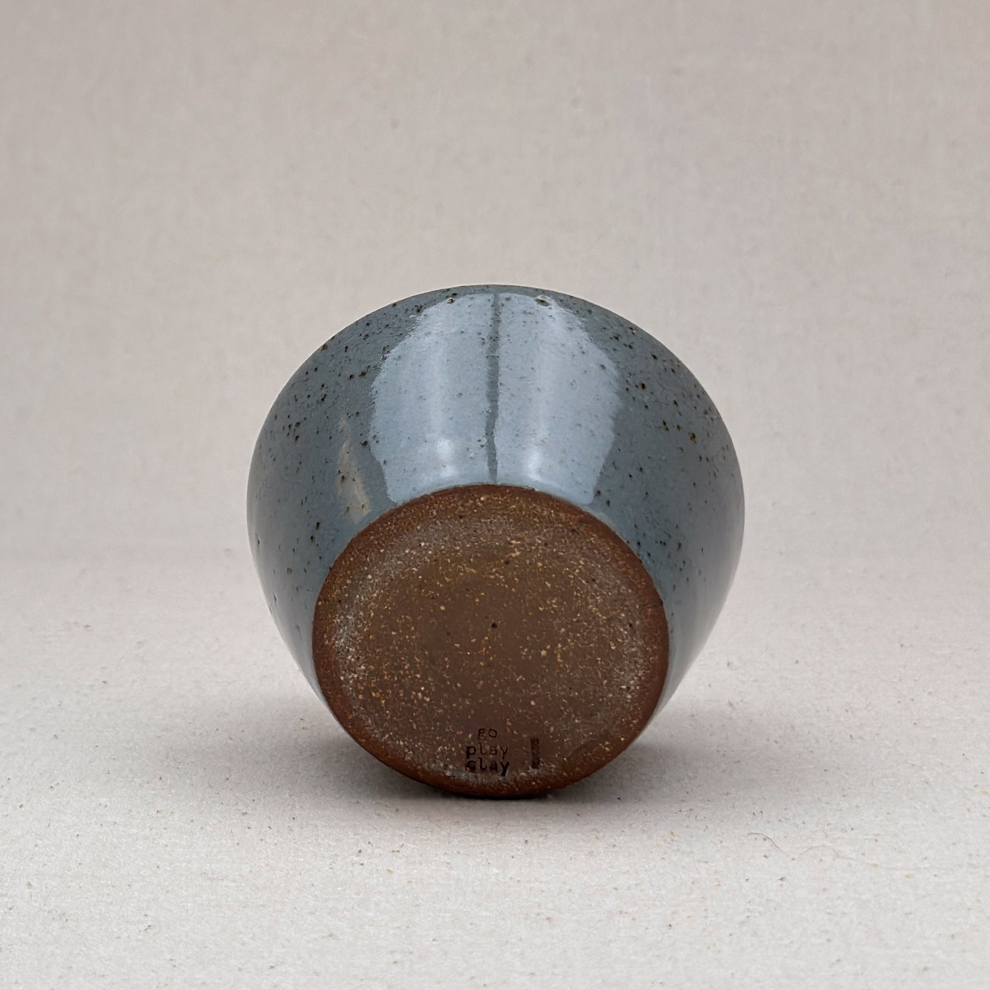 This small blue ceramic vase was thrown on the wheel. The total height is just under four inches. The width is just over three inches wide. The opening at the top is just over an inch wide.