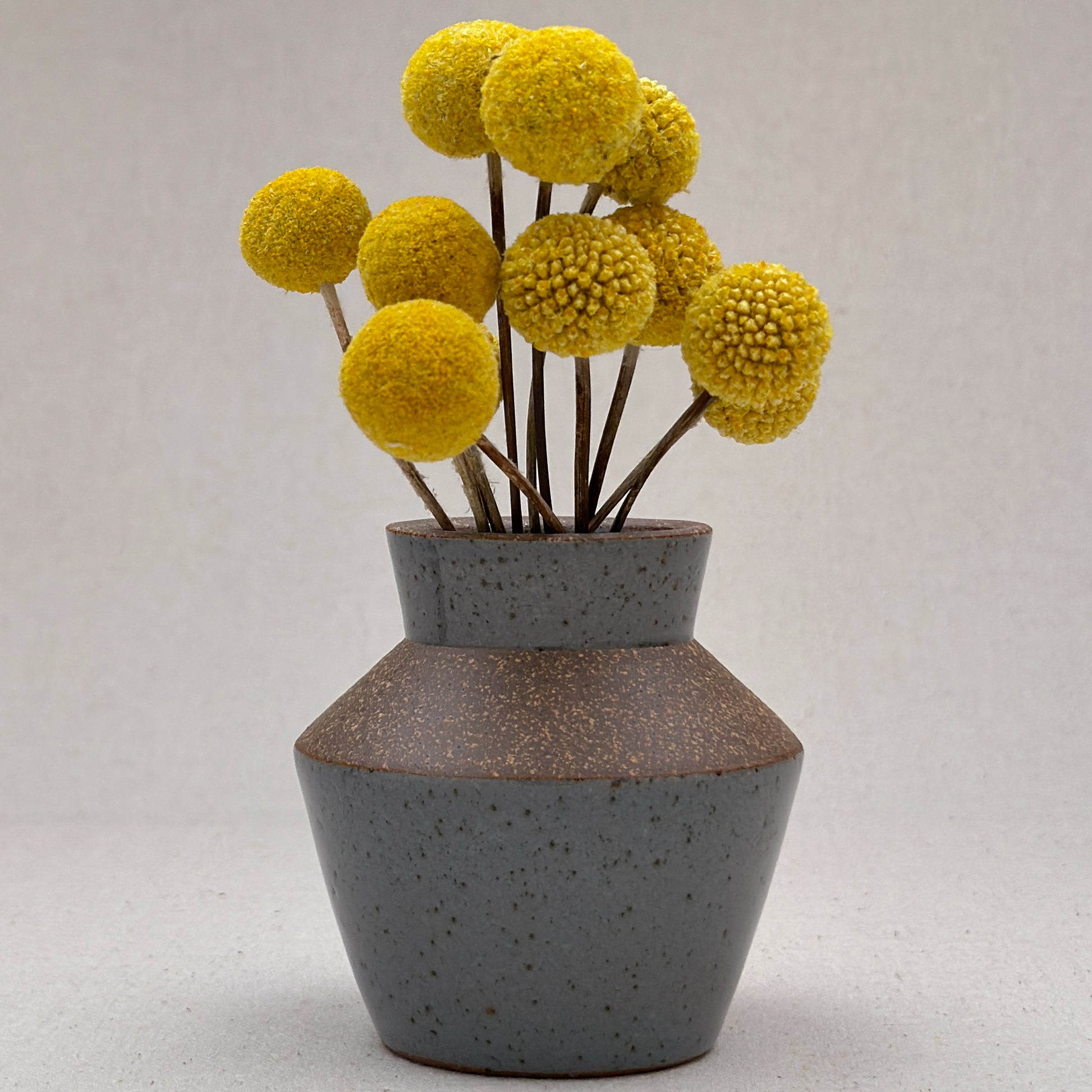 This is a fun vase for small table arrangements. The opening at the neck is just over an inch wide, making it perfect for bold arrangements that still need to include a few thick stems. I love putting billy balls, bunny tails, or eucalyptus in this form. Wild bouquets contrast nicely with the angular order this form presents.