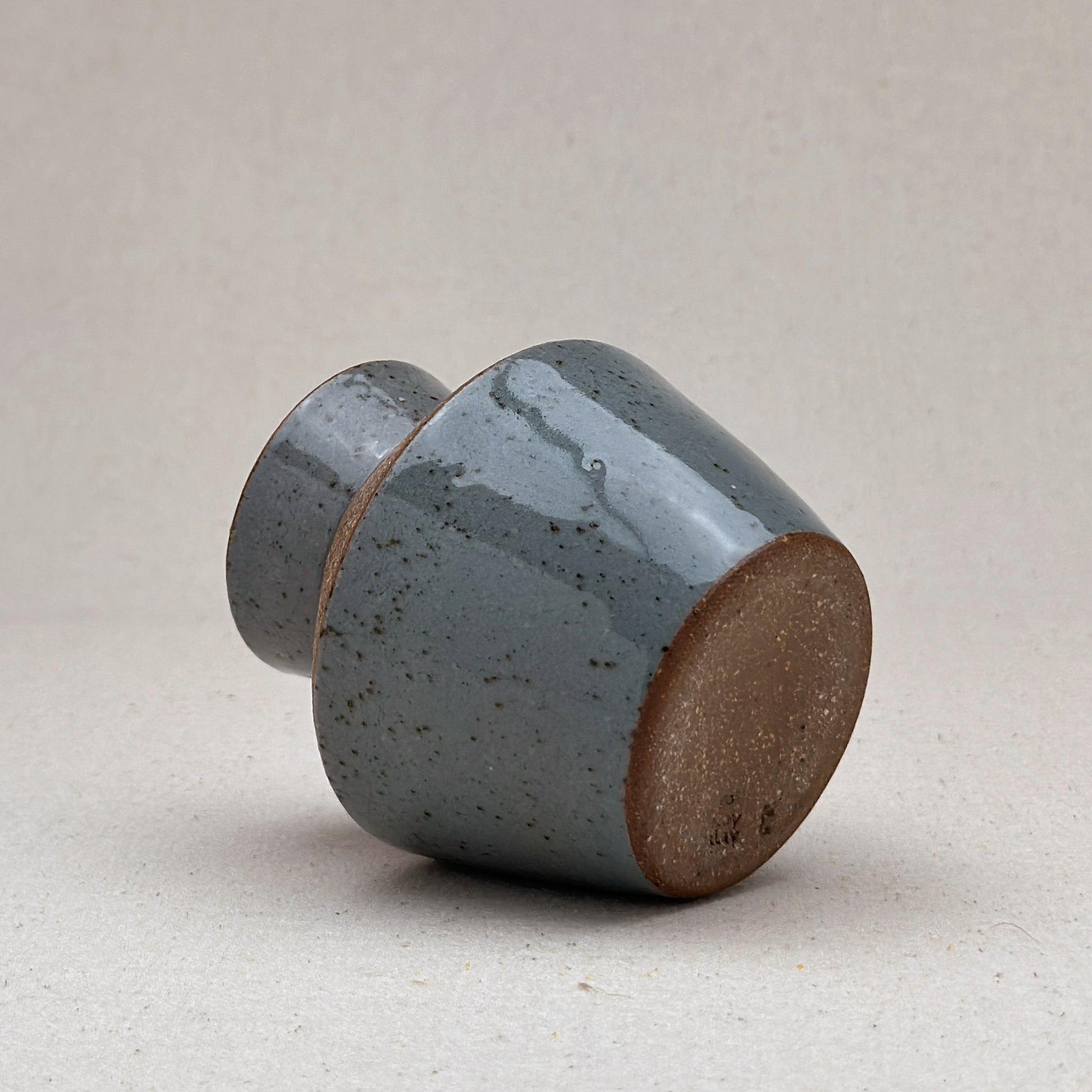 This small blue ceramic vase was thrown on the wheel. The total height is just under four inches. The width is just over three inches wide. The opening at the top is just over an inch wide.