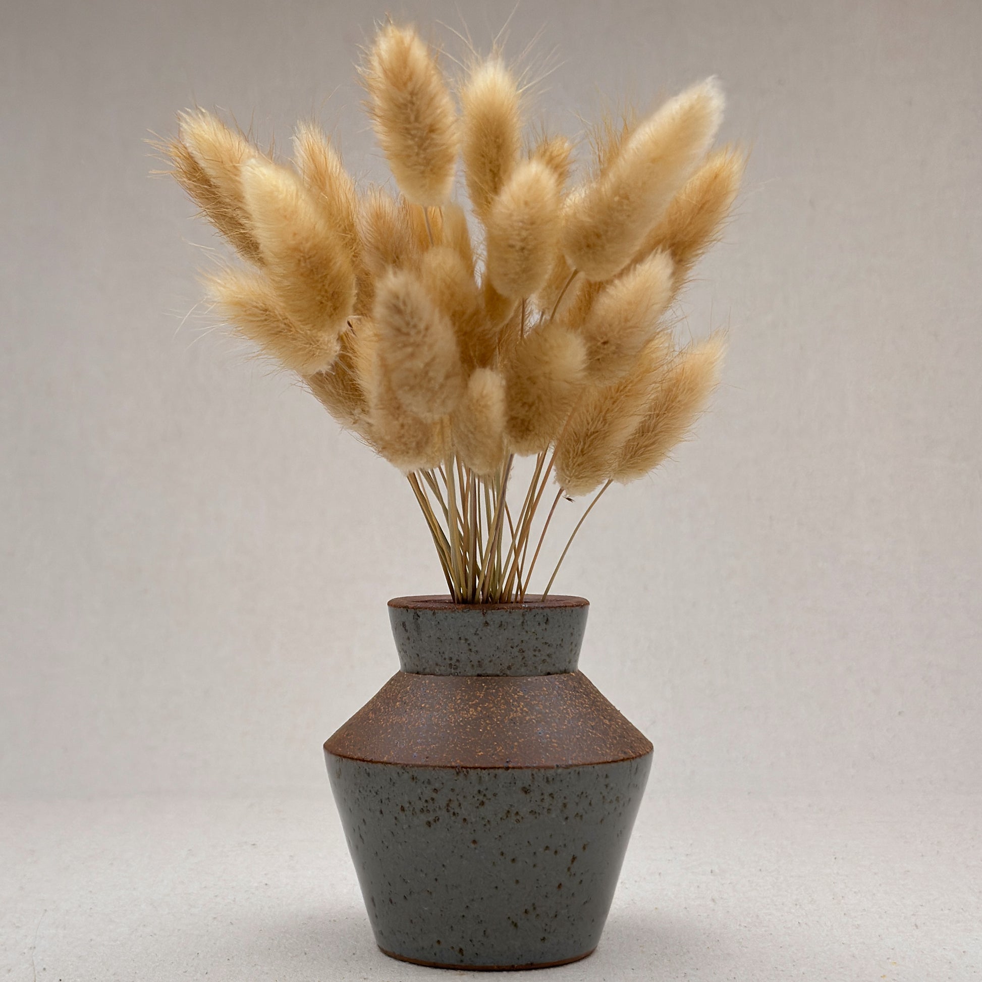This is a fun vase for small table arrangements. The opening at the neck is just over an inch wide, making it perfect for bold arrangements that still need to include a few thick stems. I love putting billy balls, bunny tails, or eucalyptus in this form. Wild bouquets contrast nicely with the angular order this form presents.