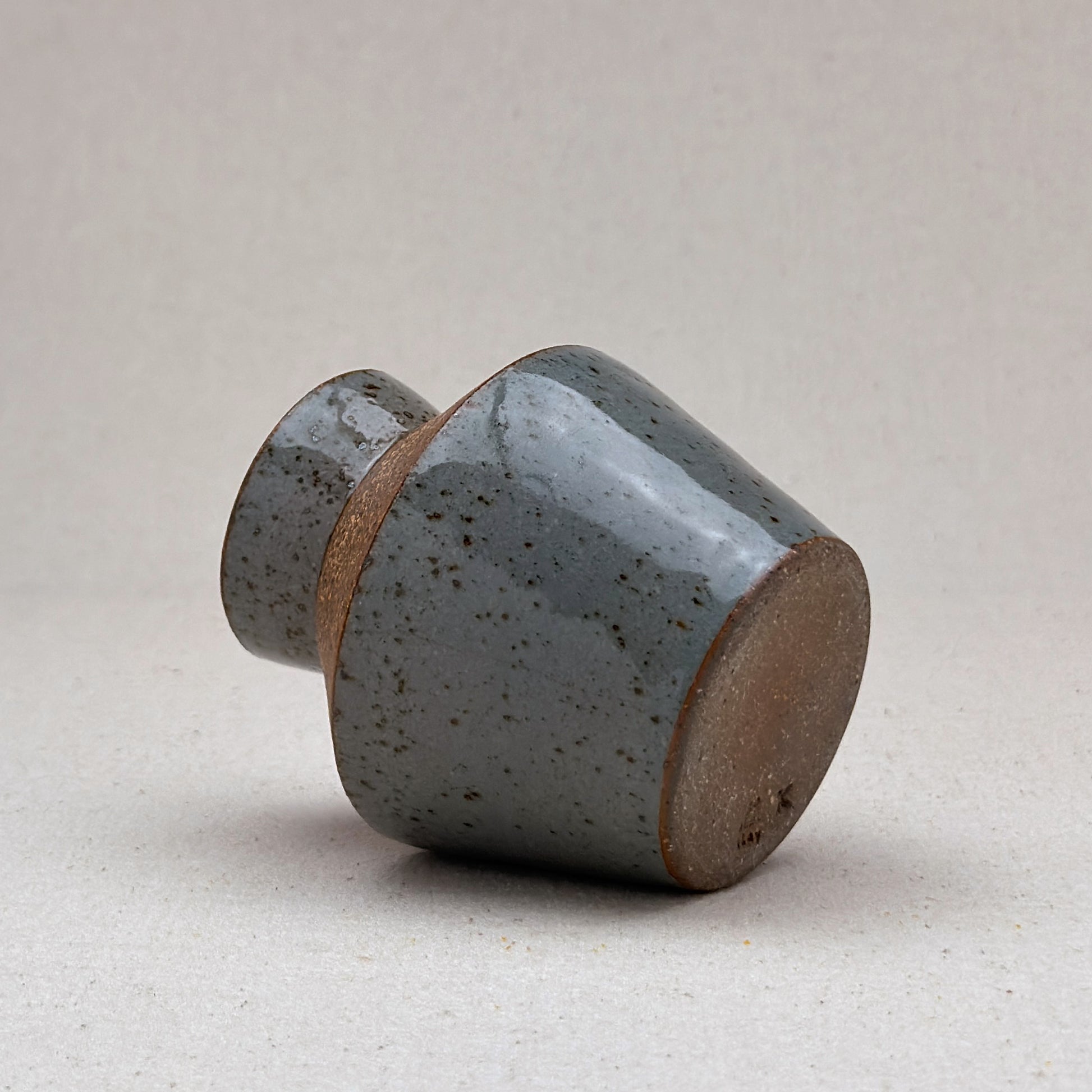 It is glazed in a baby blue transparent glaze that when fired results in a thick glossy finish. Two areas on the outside are left bare to reveal the texture and color of the iron in the clay. The interior is fully glazed and watertight.
