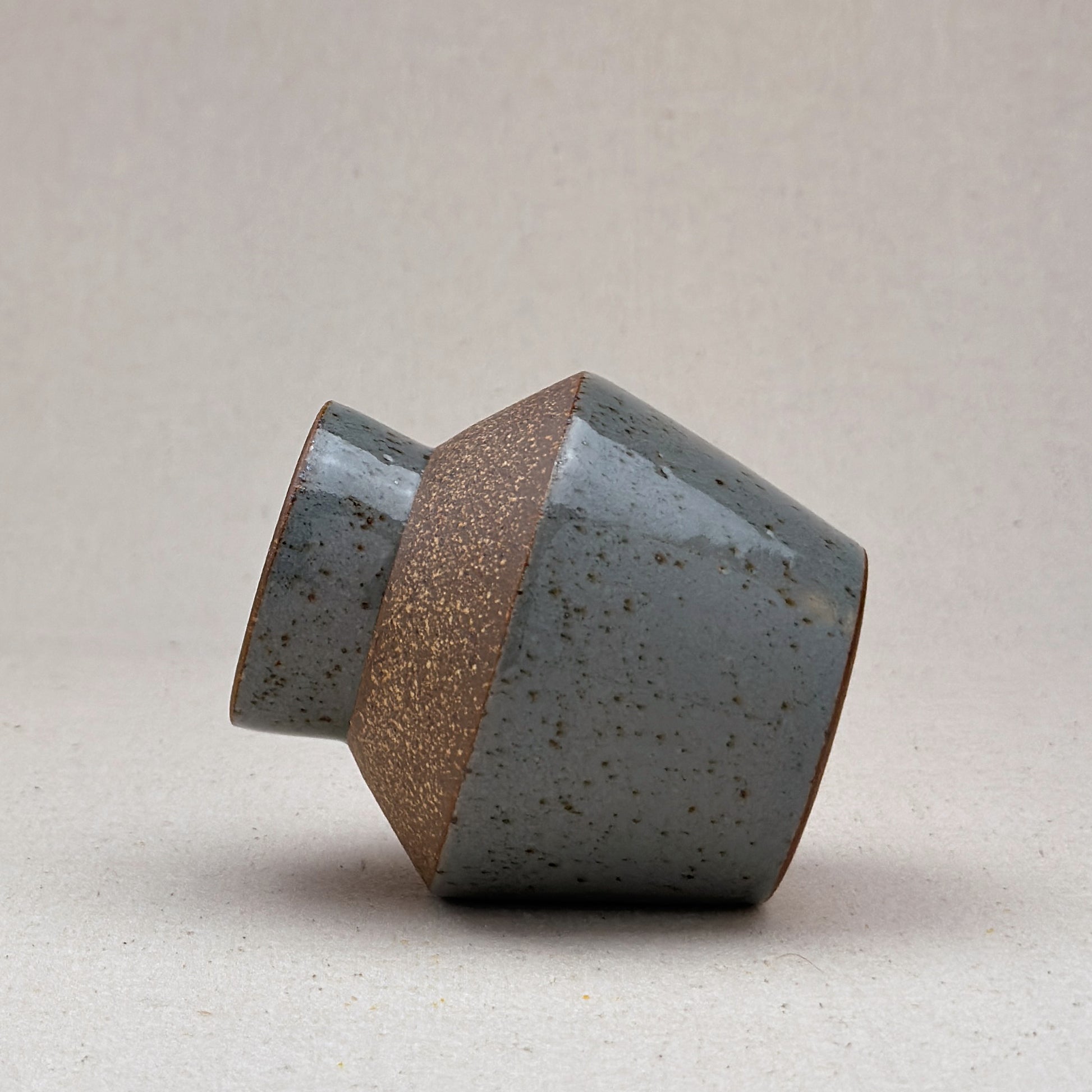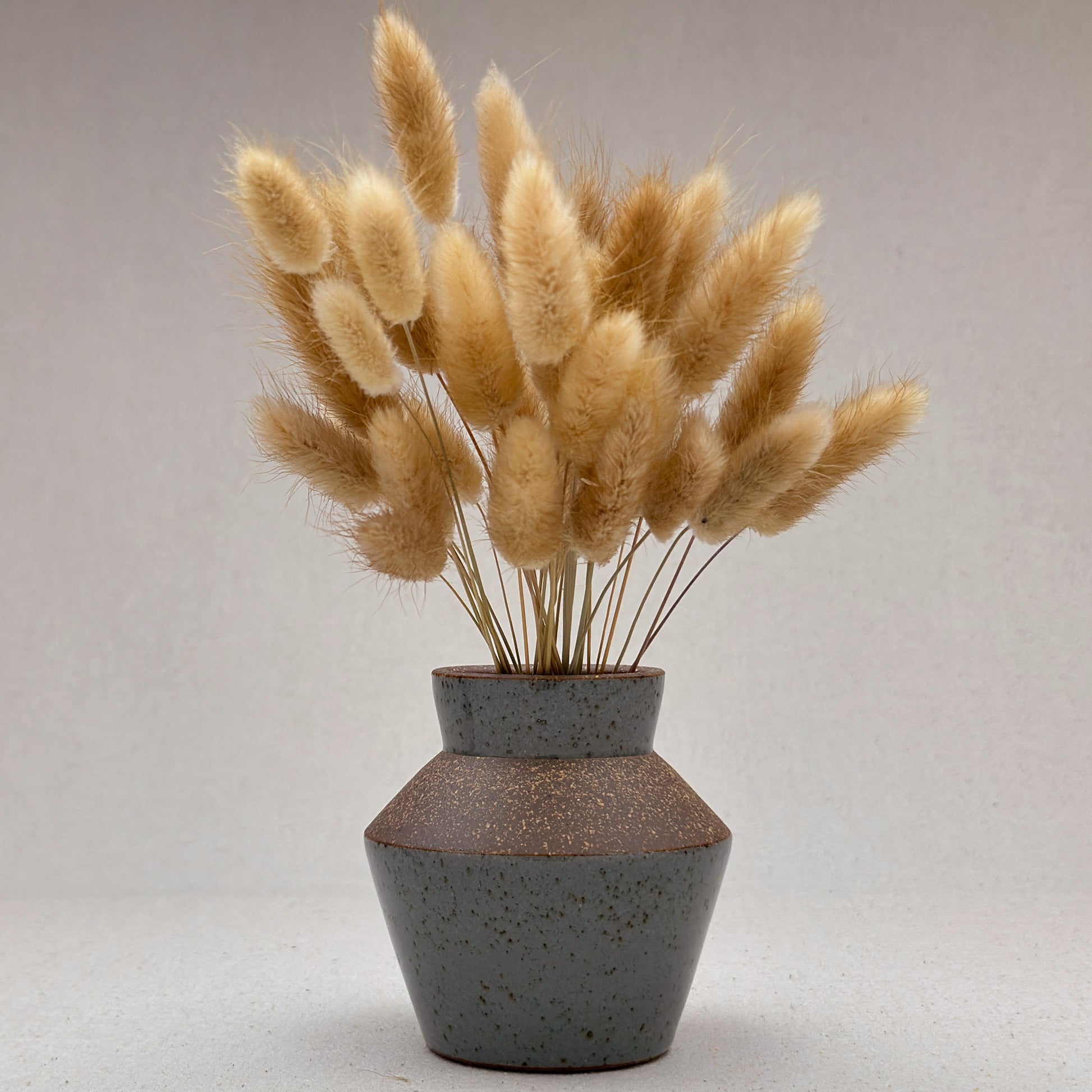 This is a fun vase for small table arrangements. The opening at the neck is just over an inch wide, making it perfect for bold arrangements that still need to include a few thick stems. I love putting billy balls, bunny tails, or eucalyptus in this form. Wild bouquets contrast nicely with the angular order this form presents.