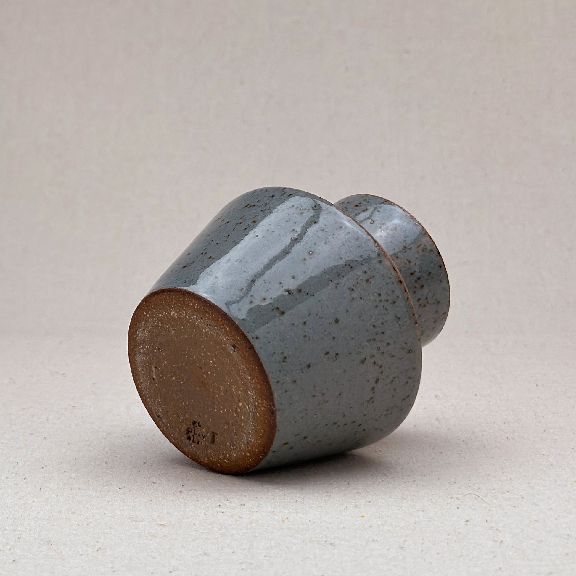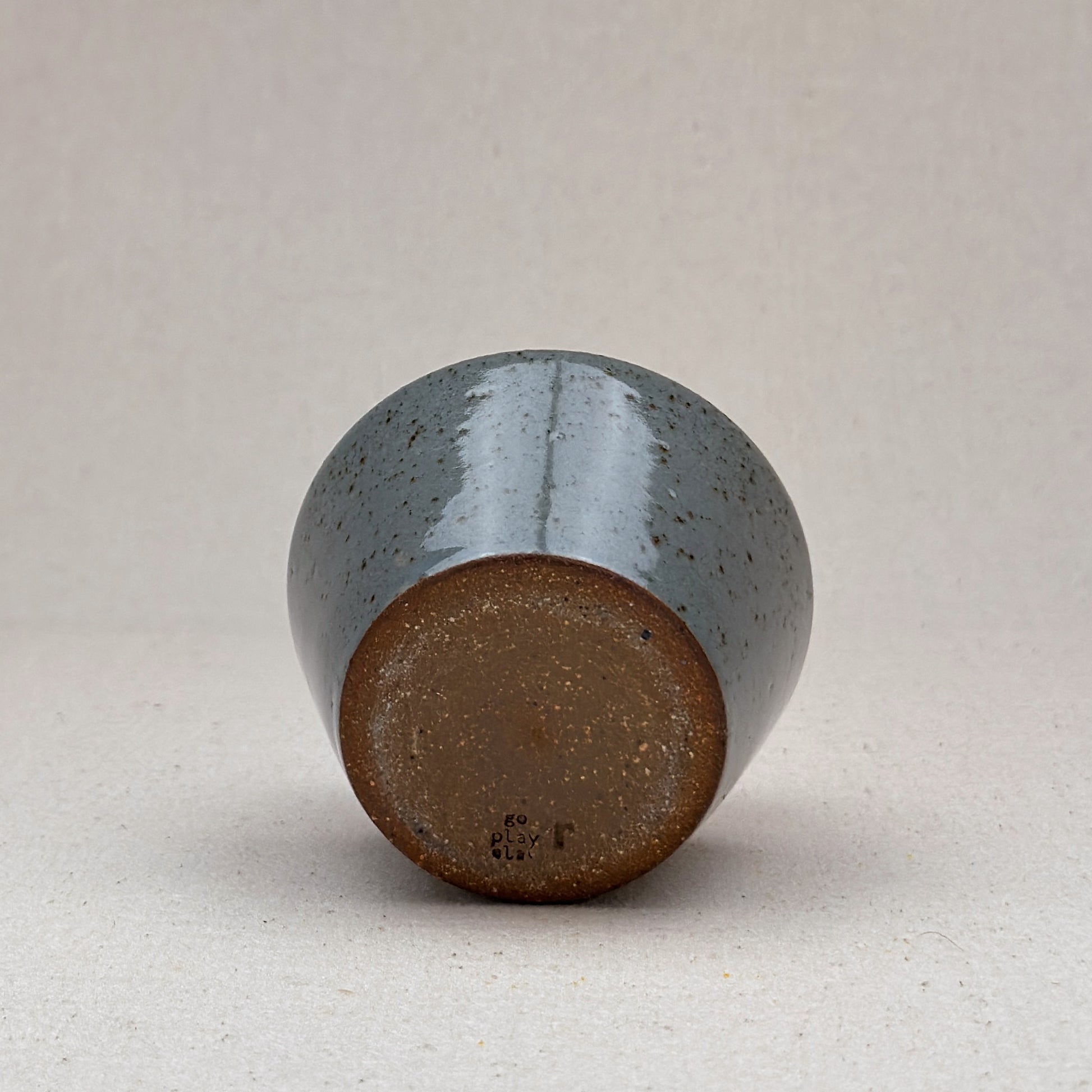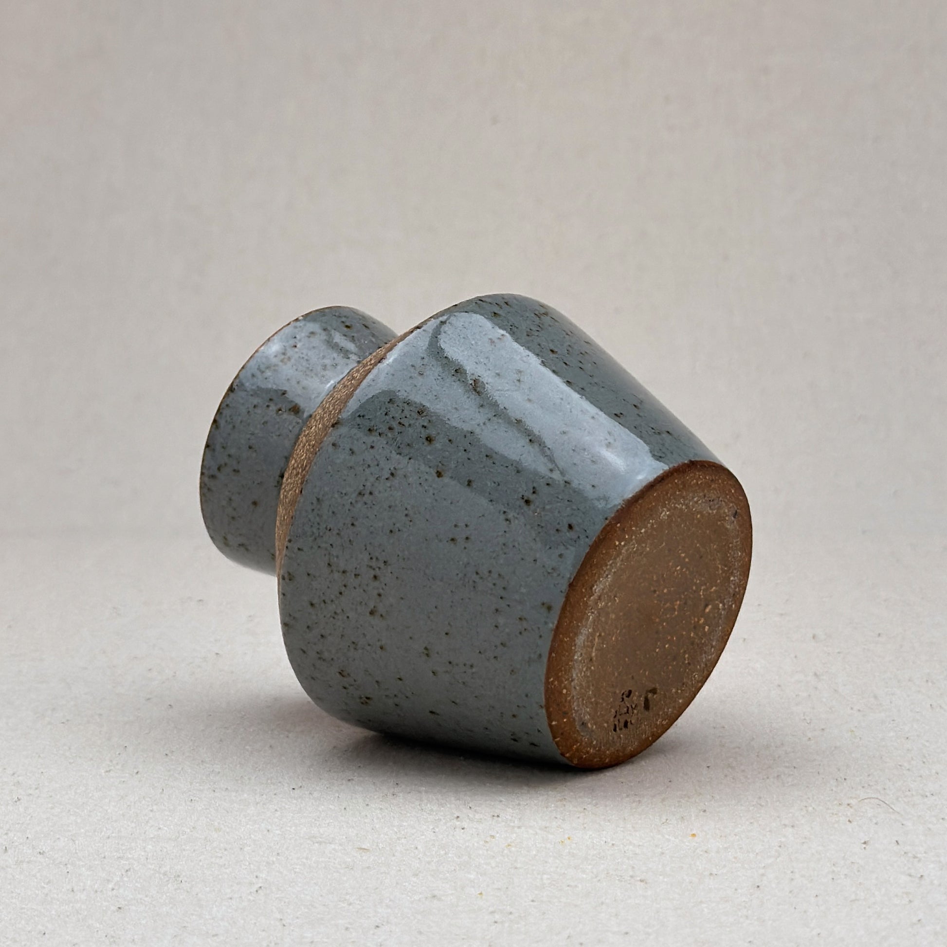 This small blue ceramic vase was thrown on the wheel. The total height is just under four inches. The width is just over three inches wide. The opening at the top is just over an inch wide.