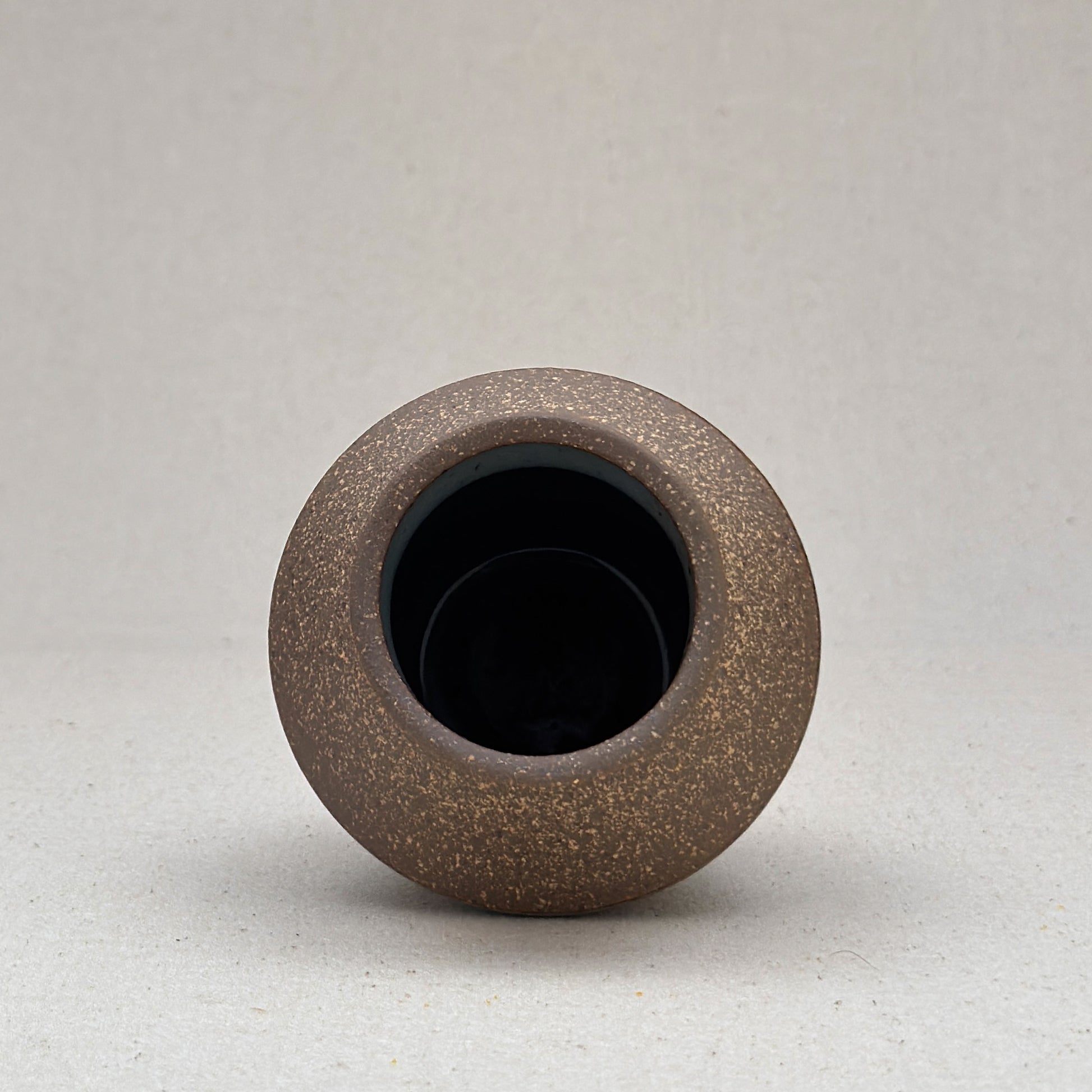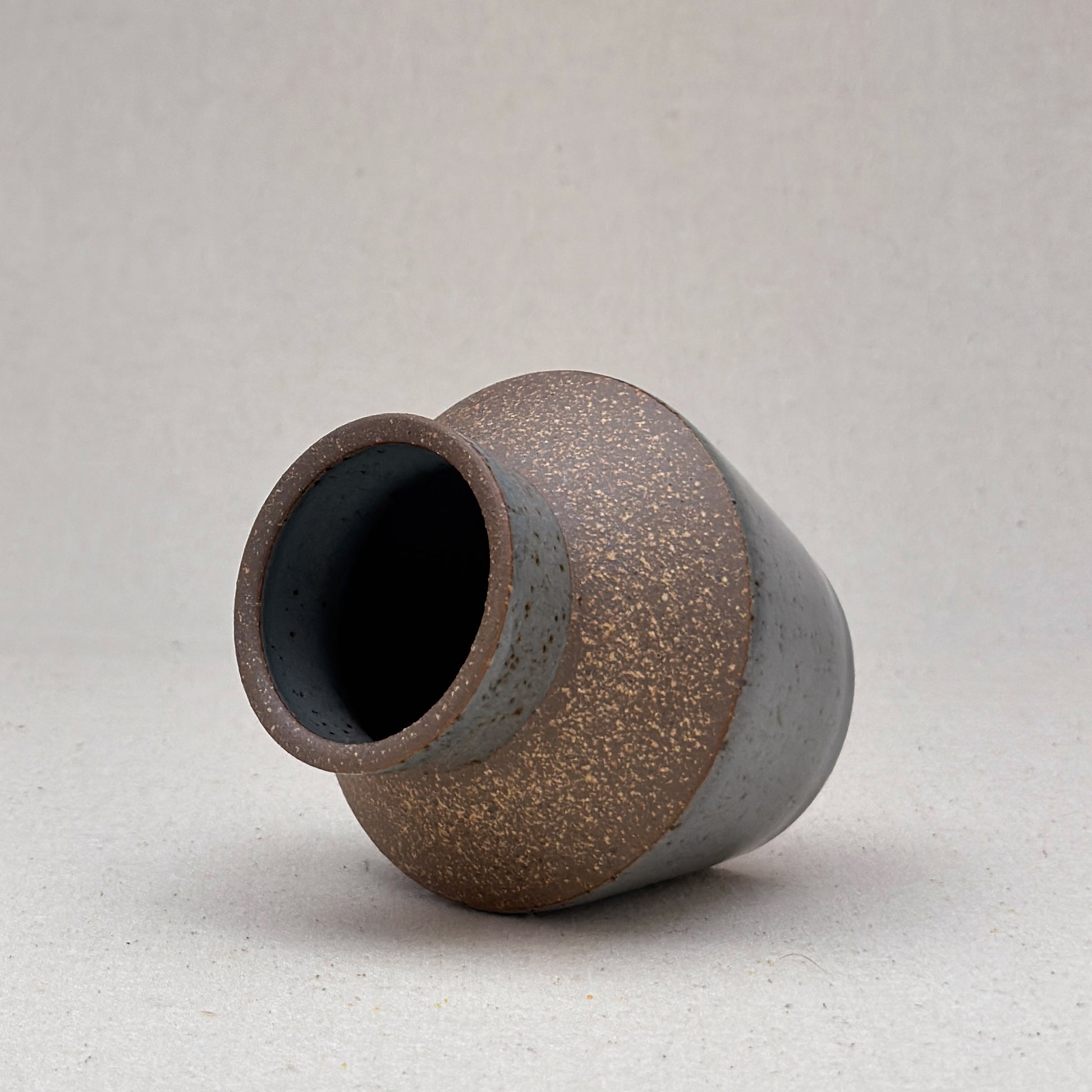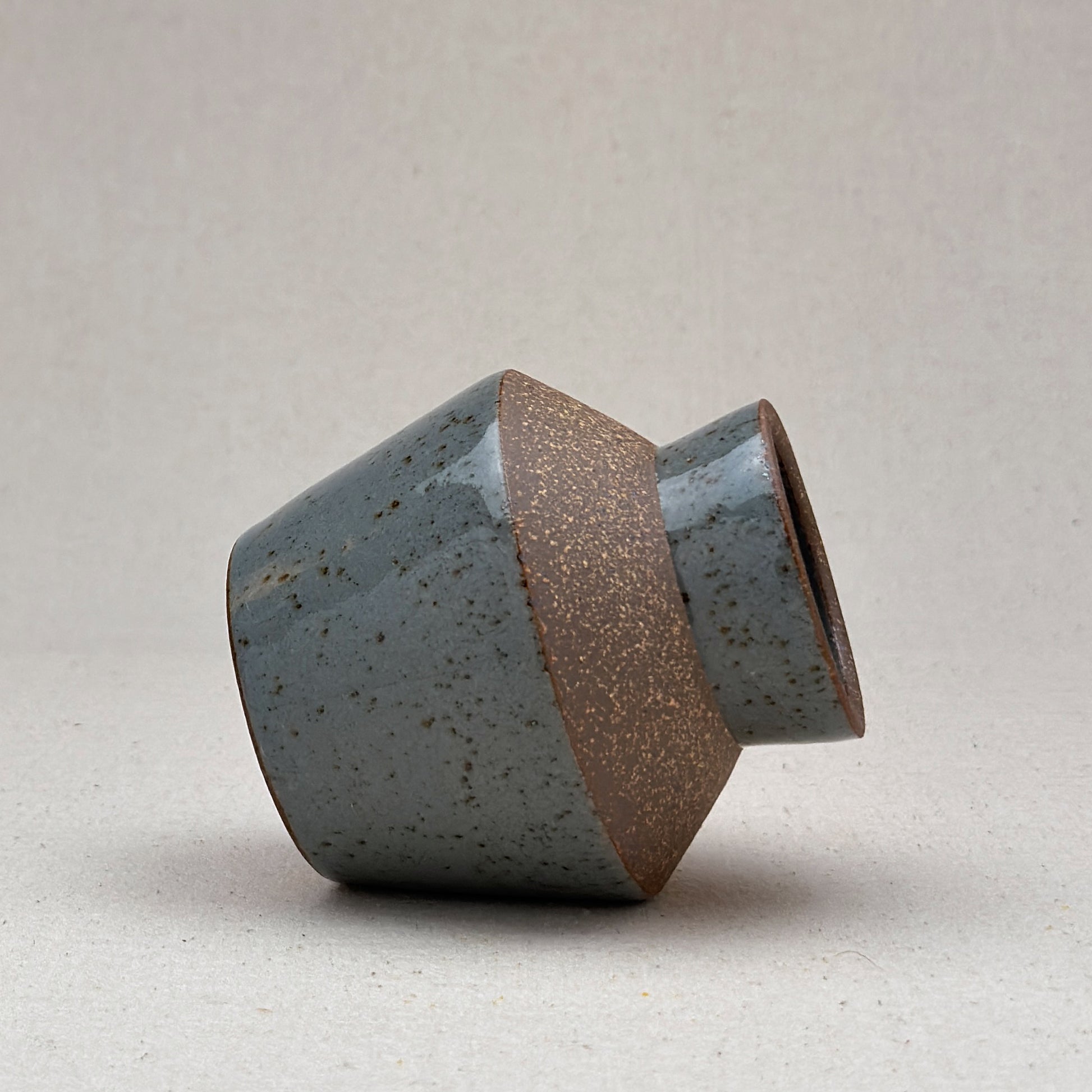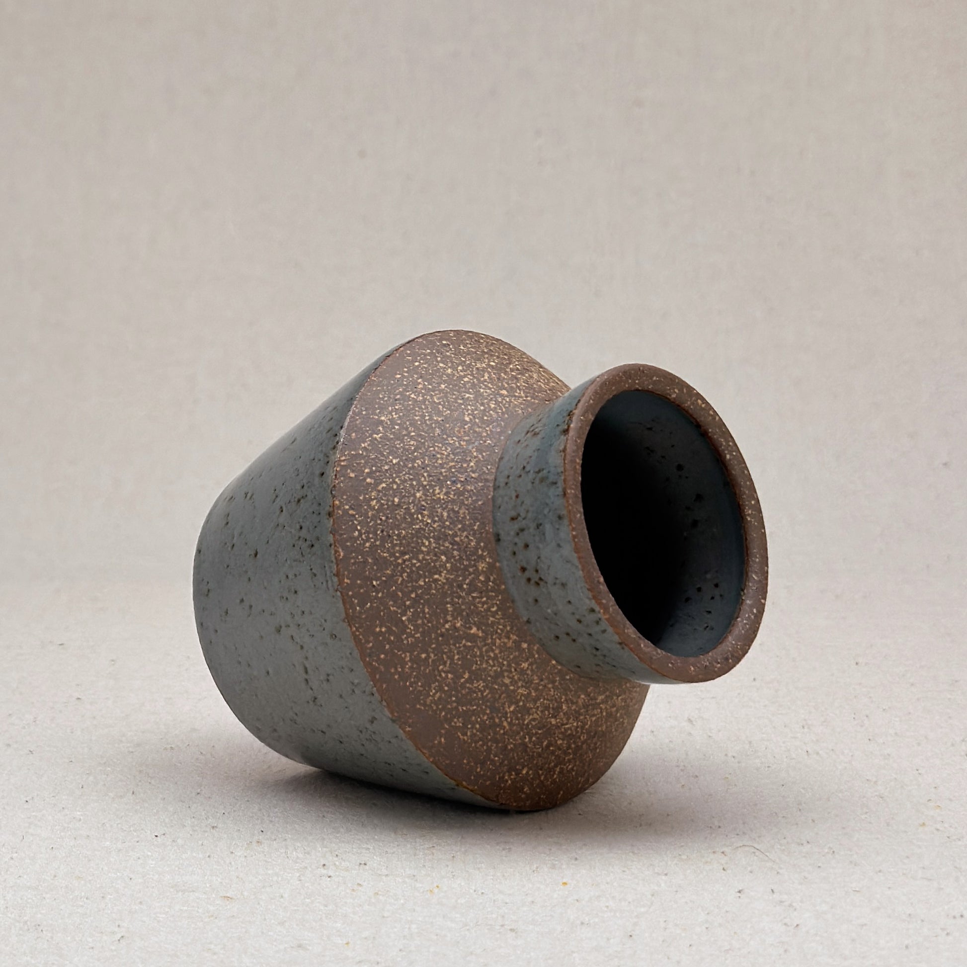 This small blue ceramic vase was thrown on the wheel. The total height is just under four inches. The width is just over three inches wide. The opening at the top is just over an inch wide.